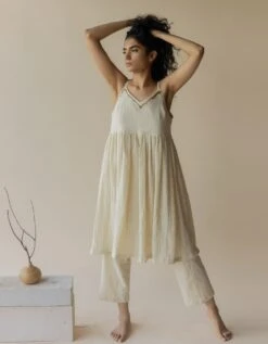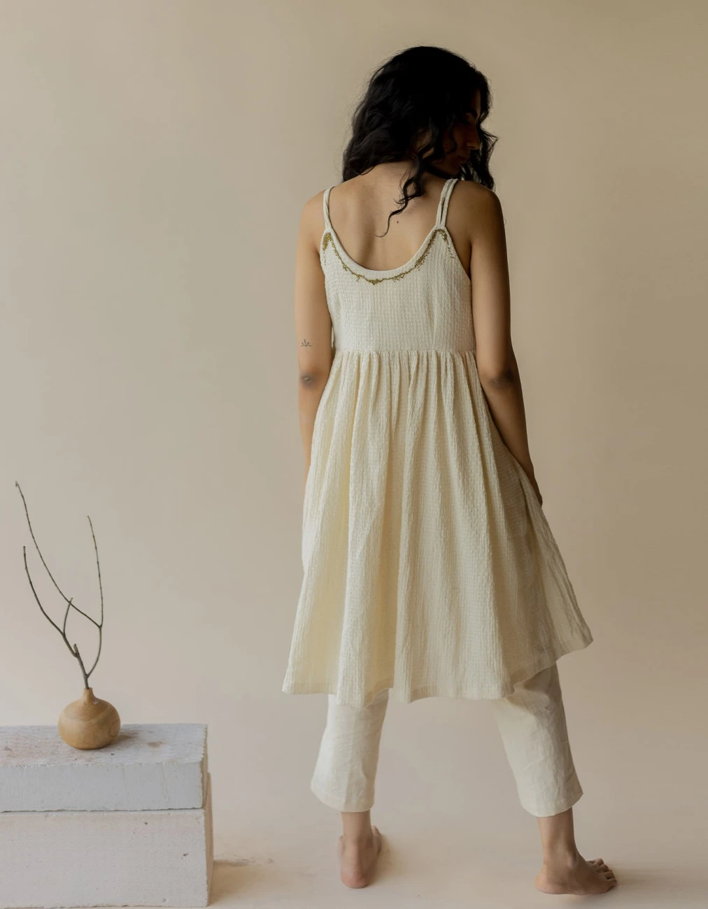 - An off-white strappy dress crafted in textured cotton