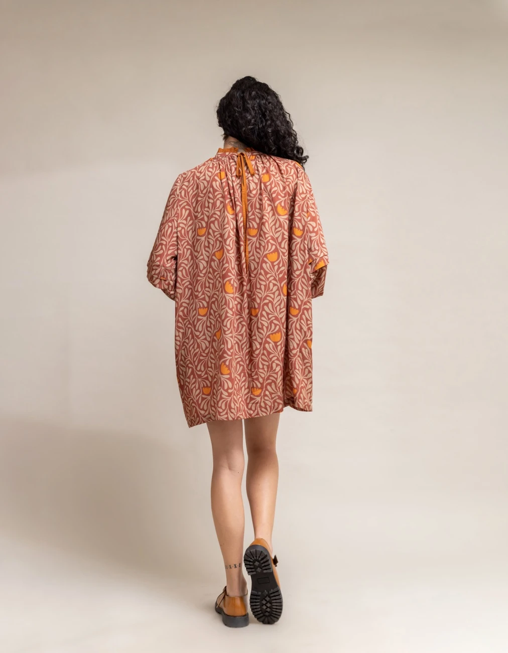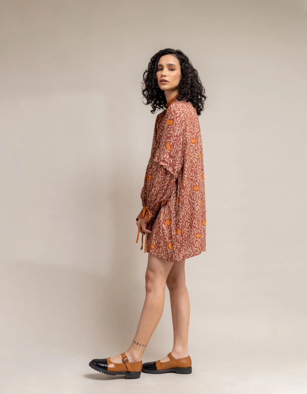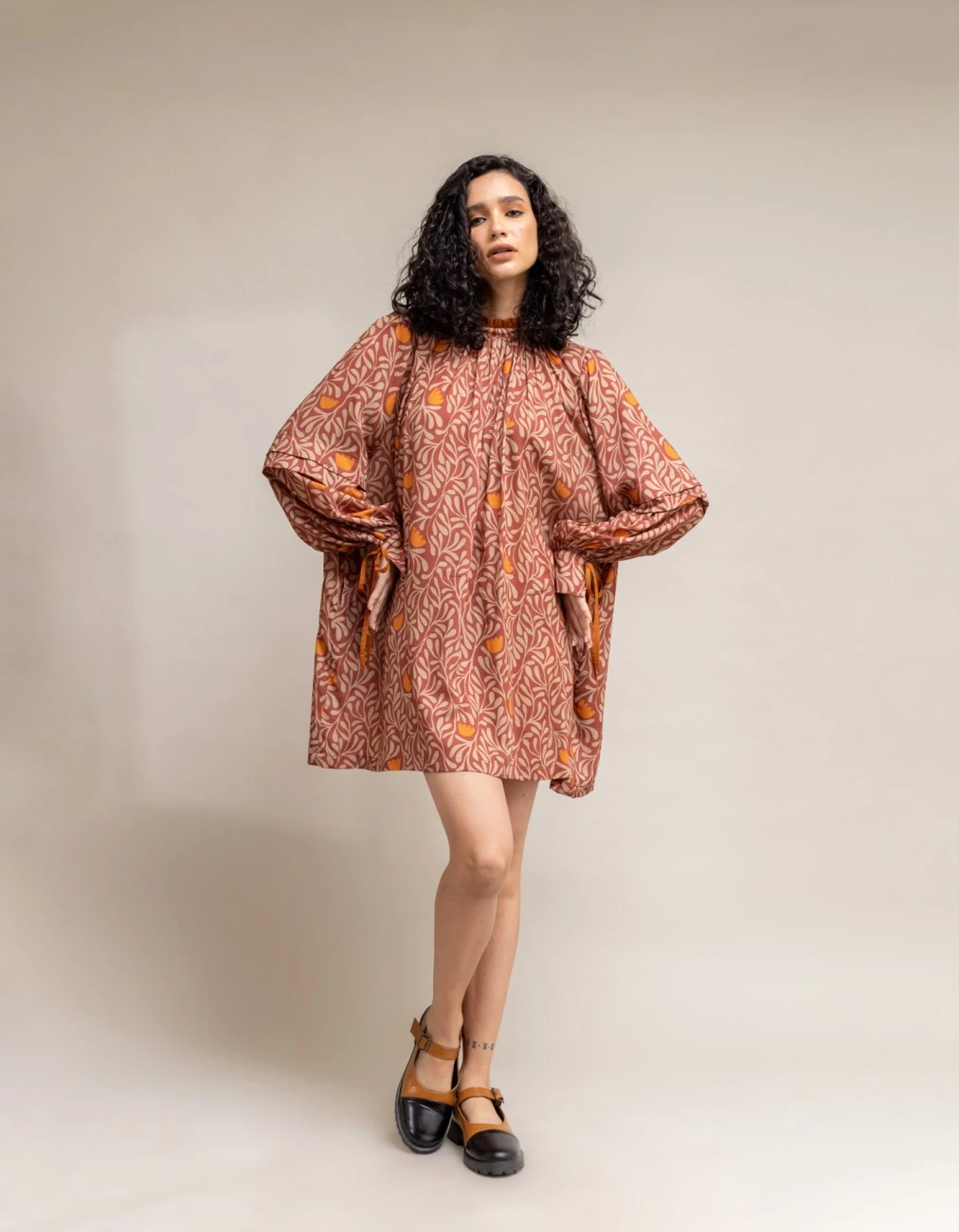 - Printed dress with puffy sleeves and mustard tie ups