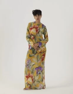 - This dress is crafted in the Alora yellow print carefully printed on Crepe. It has side slits on both sides