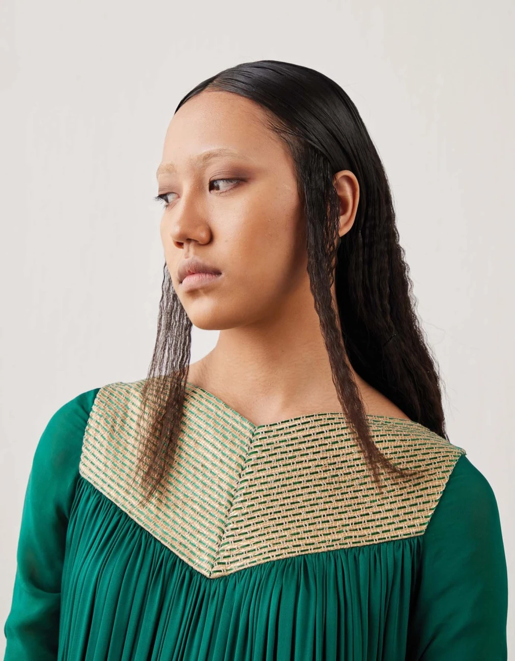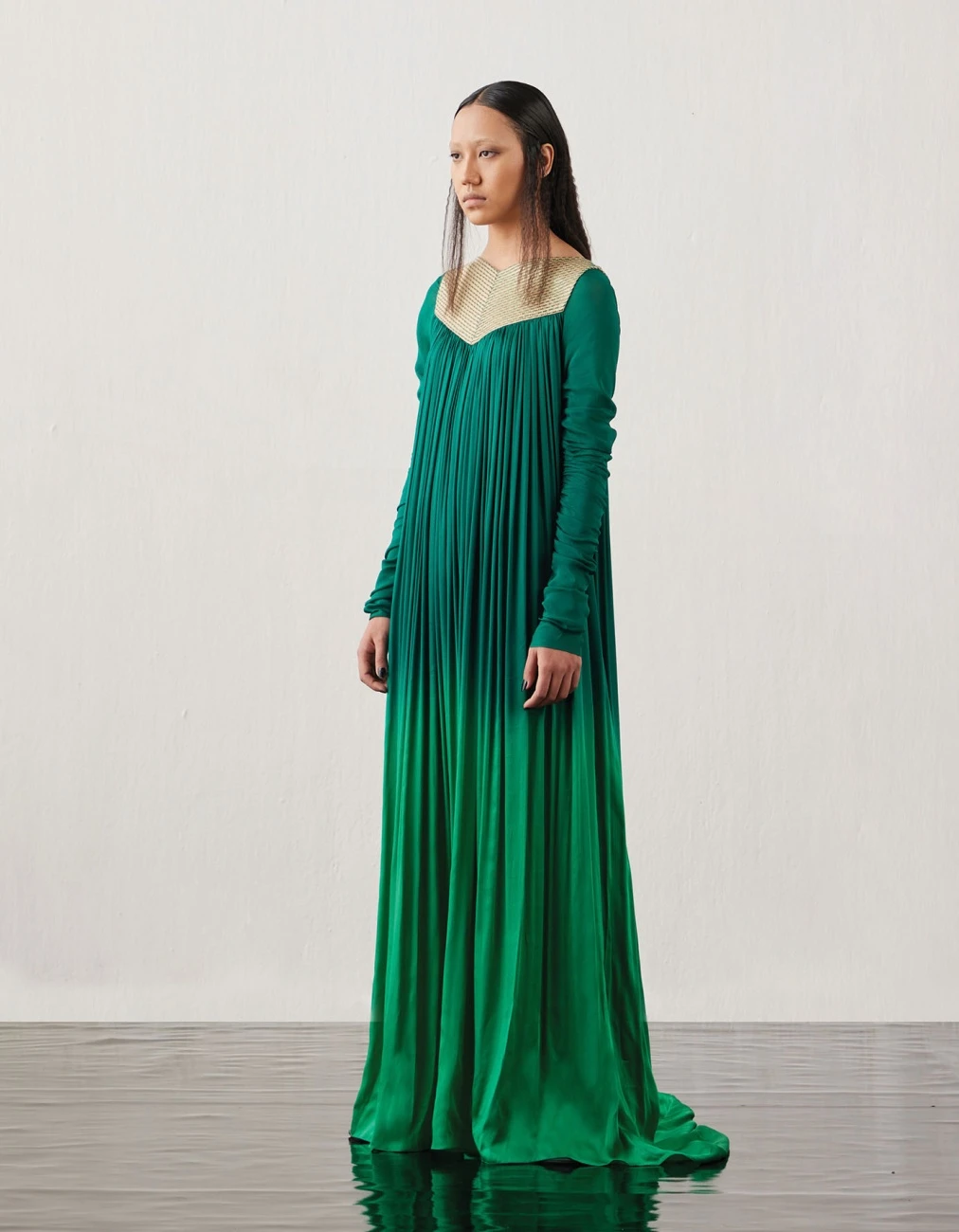 - Ombre- dyed rouched satin dress with hand-woven angular yoke and gathered chiffon sleeves