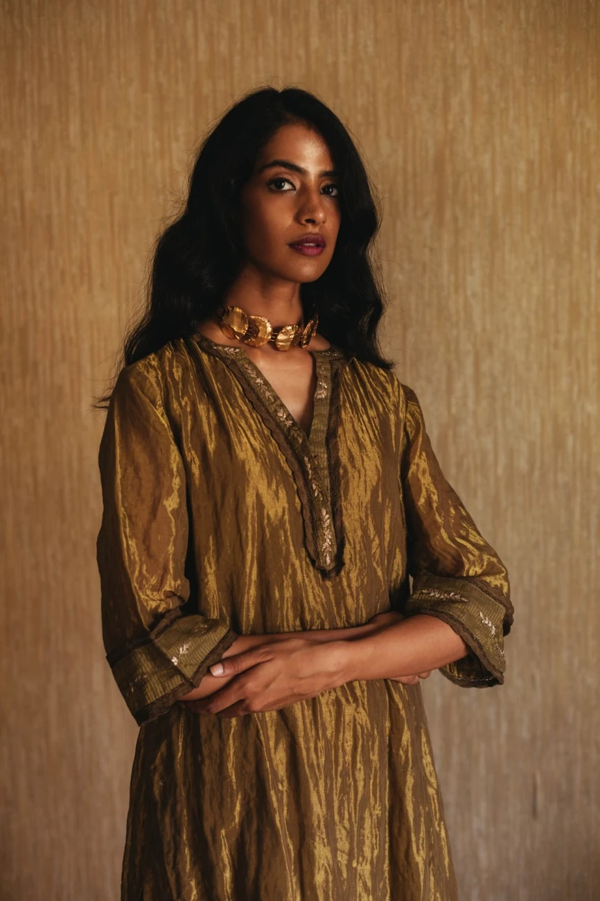 - Maxi dress in hanloom antique gold with handloom cigrette pant set