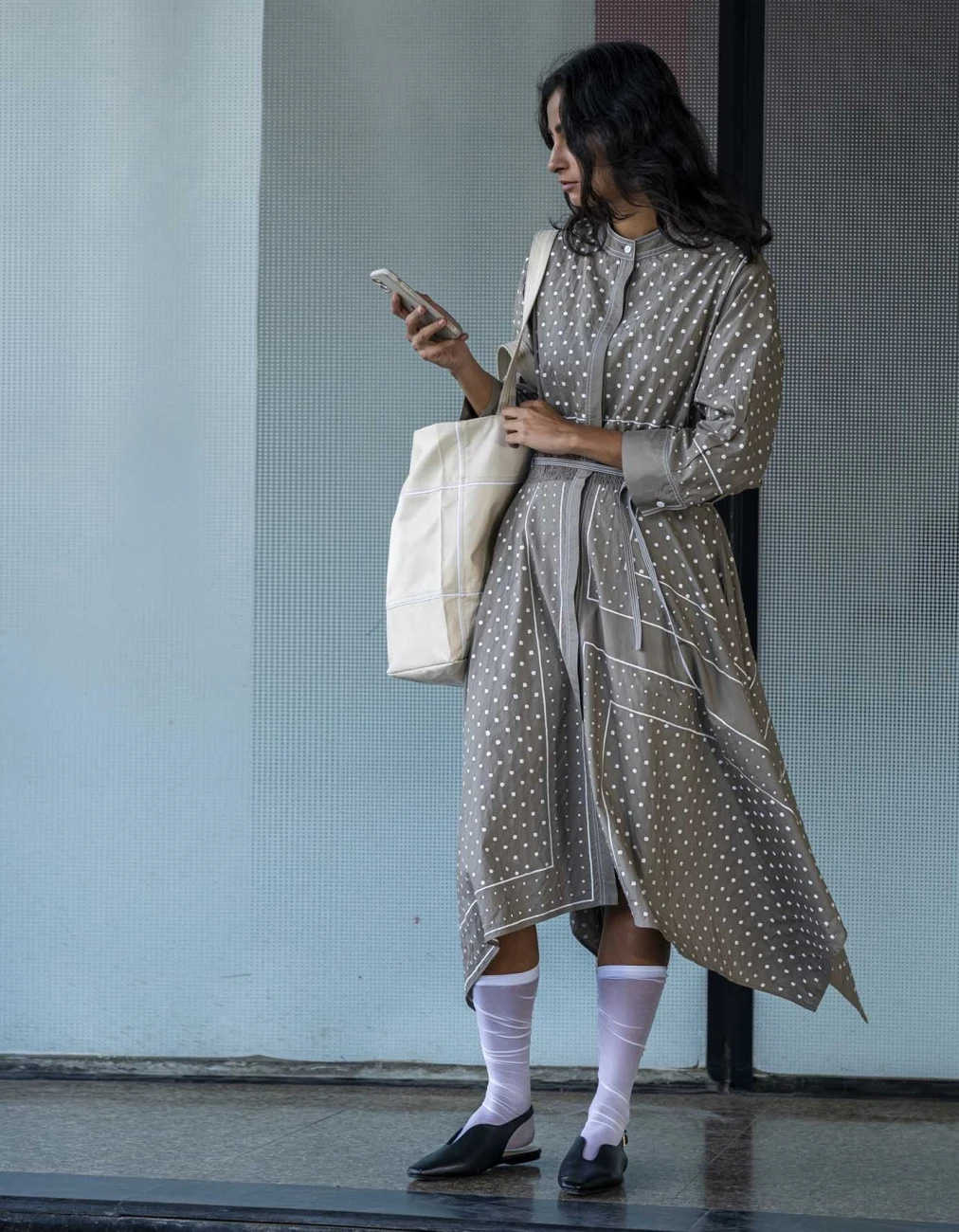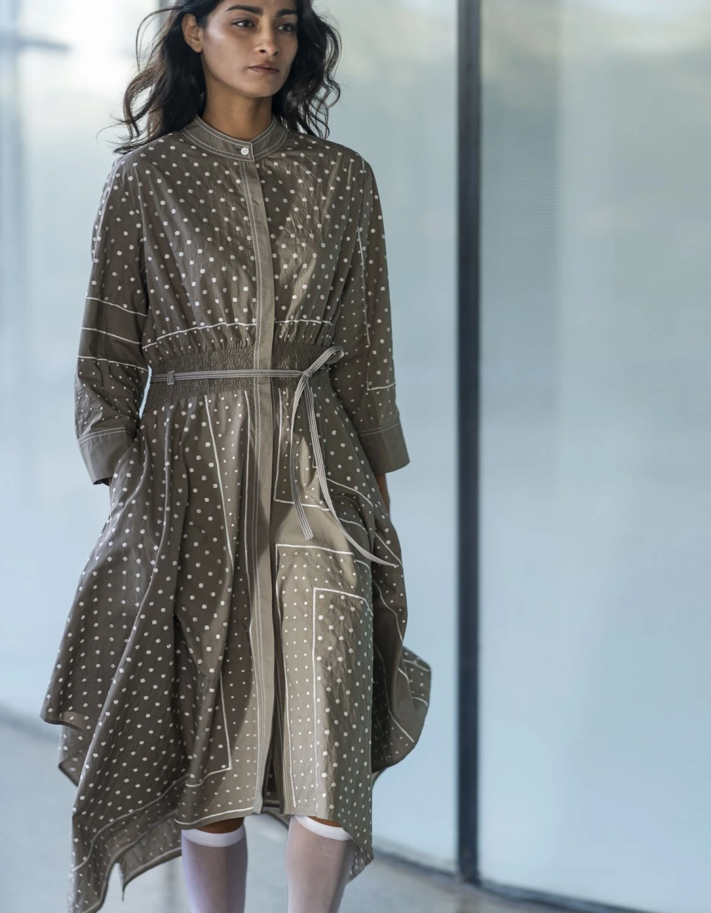 - The dress features a hankercheif hem and embroidered dots in silk threads