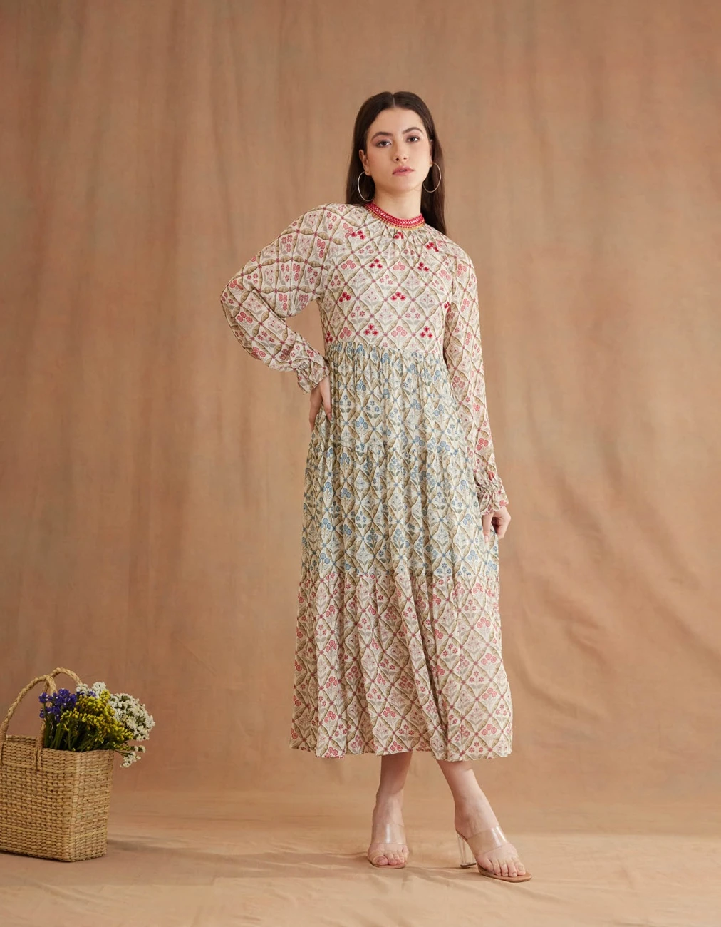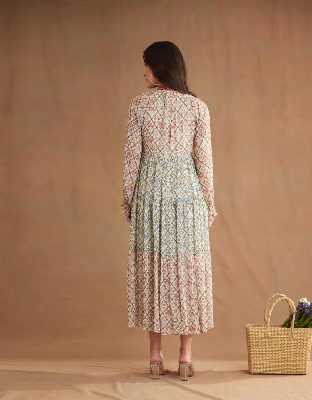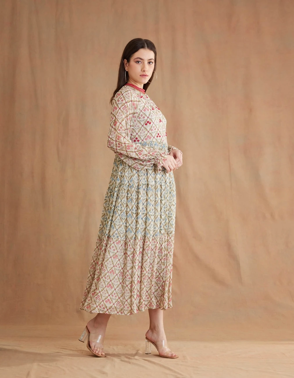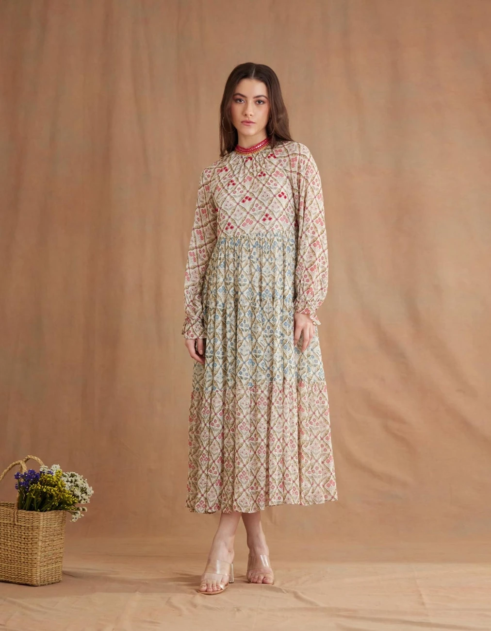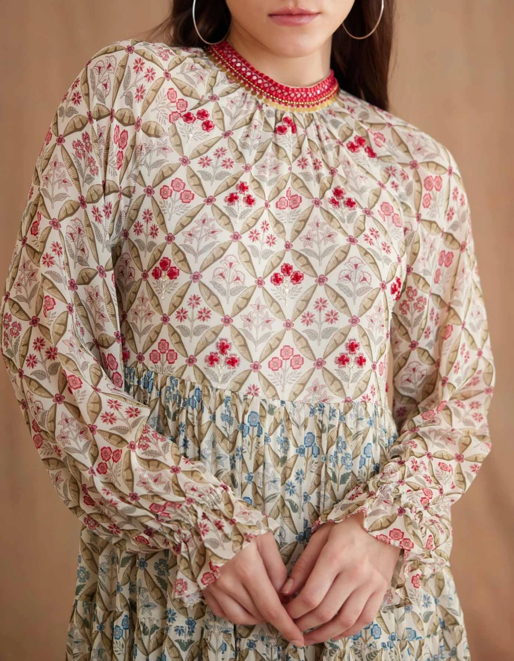 - antique brass sequins and mirror embroidery details on the collar and yoke