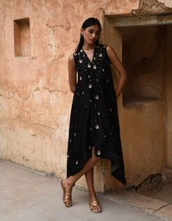 - Mixed phool guchha embroidered in dual tone zari on asymmeteric dress