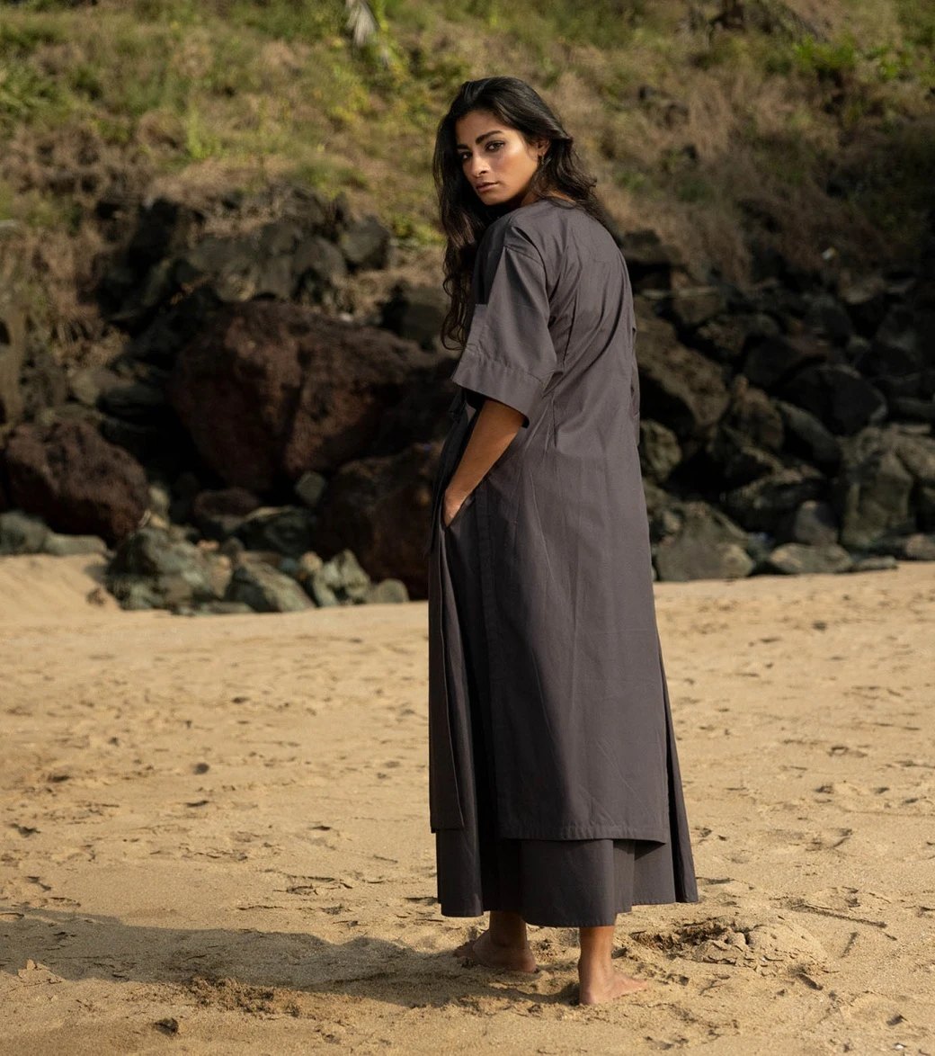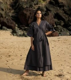 - A solid black side knoted wrap co-ord set with button embellished sleeve and flared elasticated waist pants