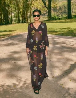 - Hand embroidered and appliqued florals on a black chiffon dress with side slits