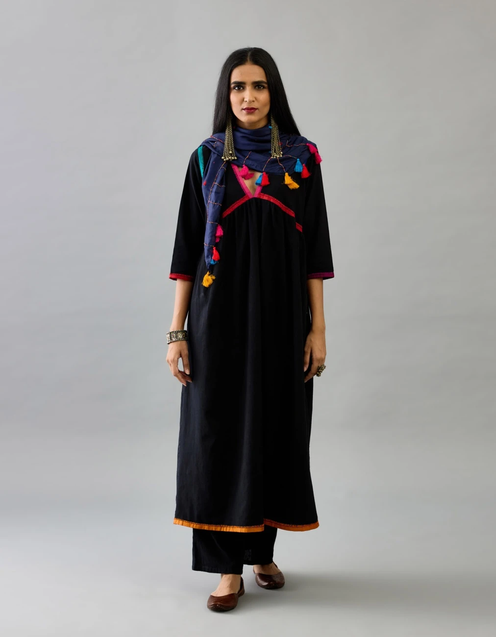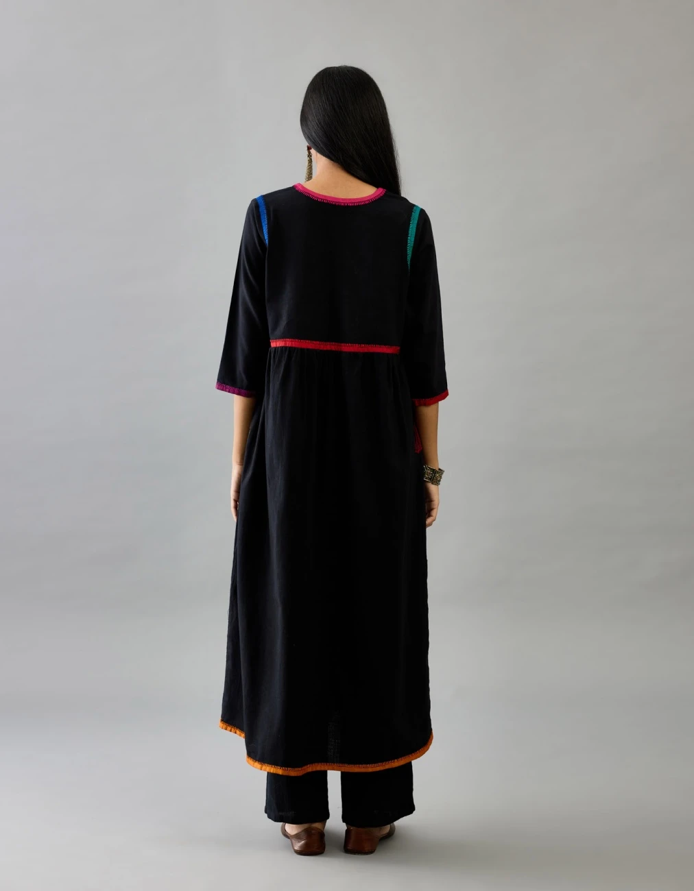 - Sleeves are 3/4 highlighted with multi colored embroidery and silk facing at edges, paired with black handloom cotton straight pants with side pockets
