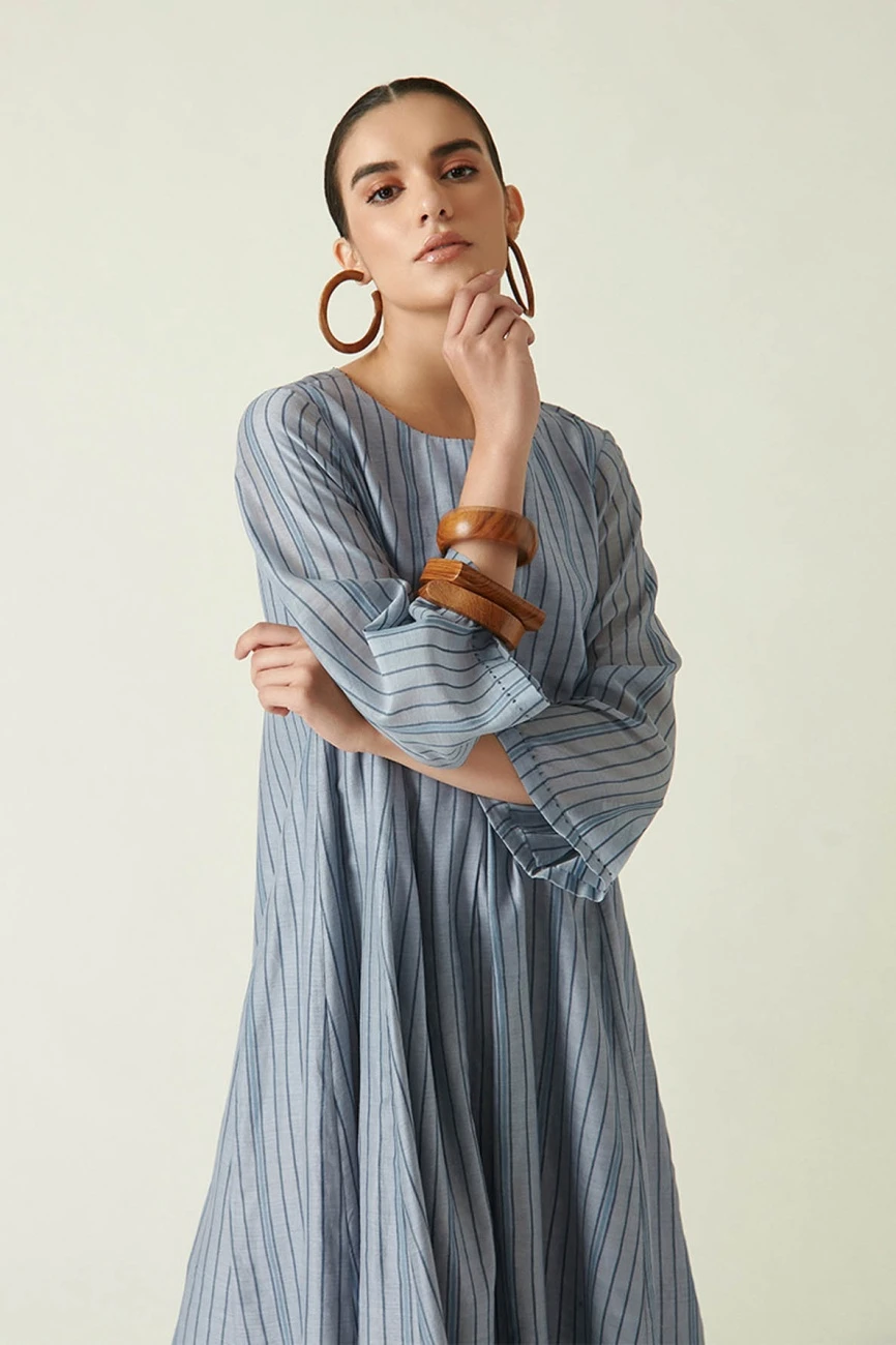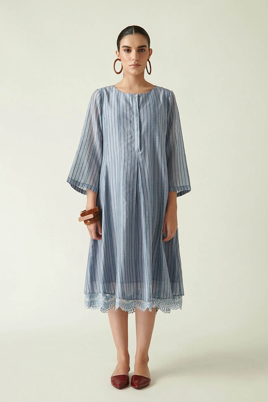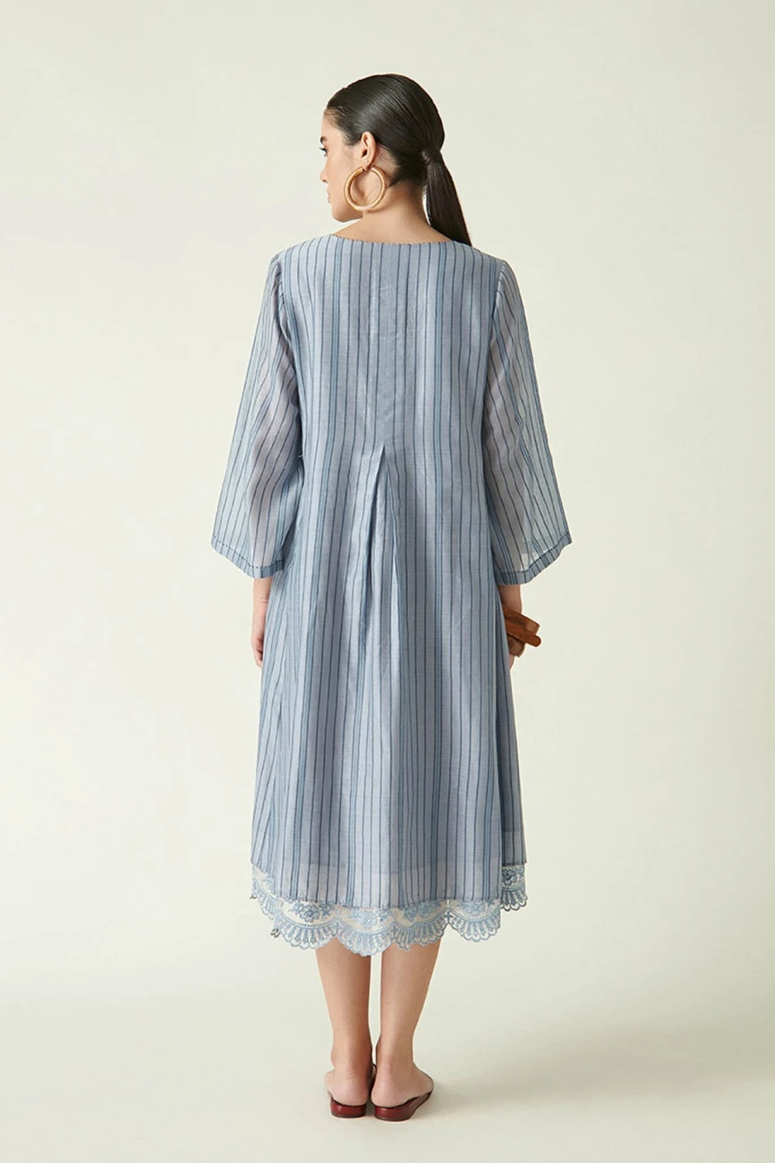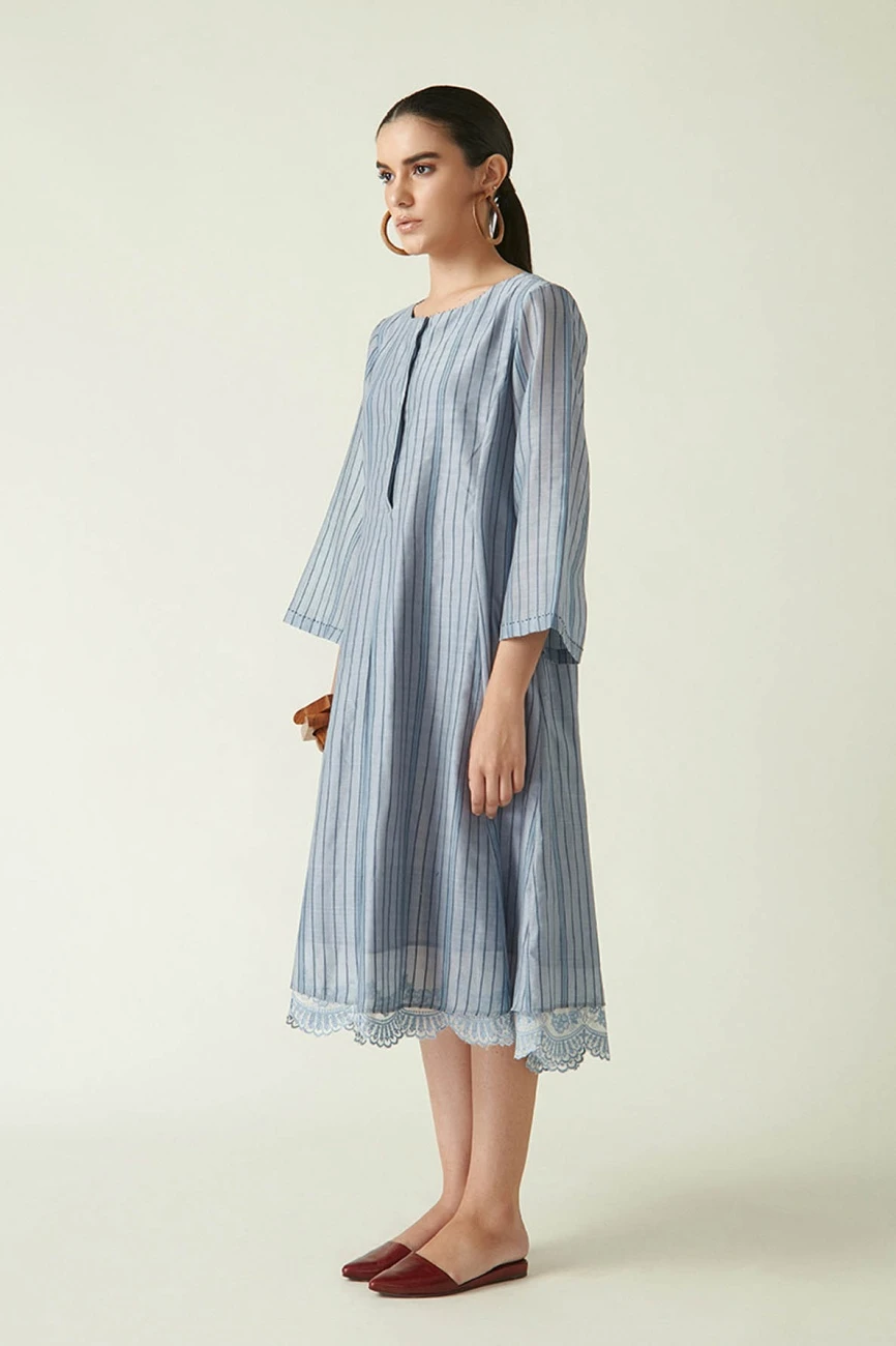 - Round neck box pleat dress with slip and scallop embroidery at hem