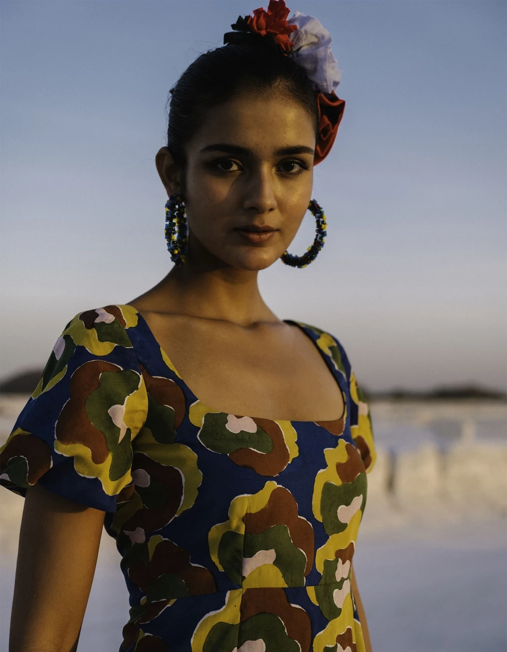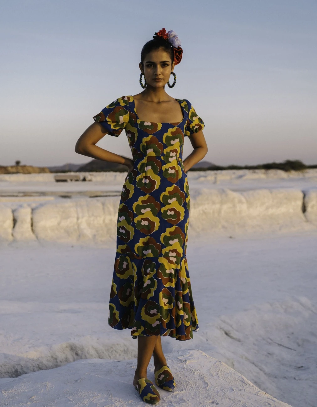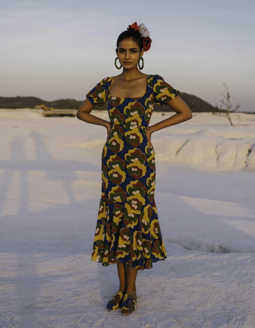 - Dress with wide square neckline, blousy sleeves and empire waist cut