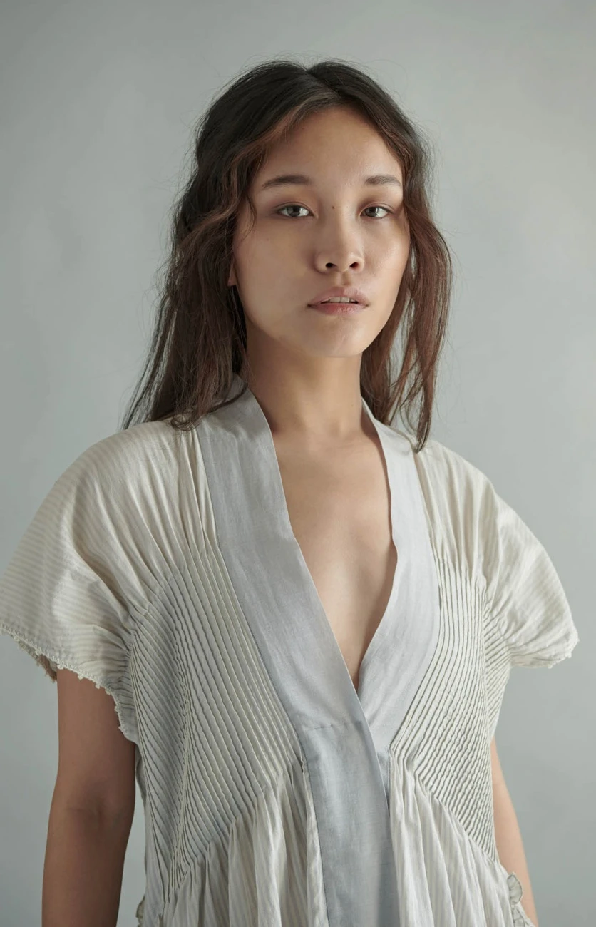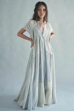 - Draped front open flared dress in yarn dyed handwoven cotton
