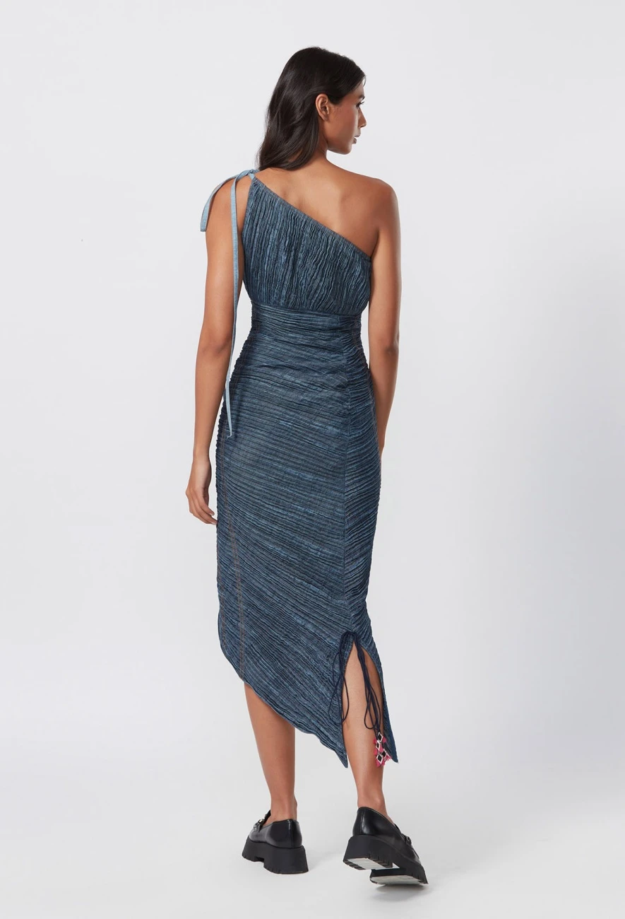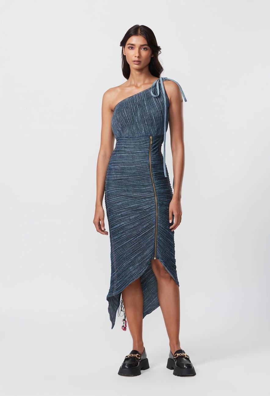- Dress : Hand Micro Pleated Denim Sari Style Dress With Zipper Detailing And Drawstring Adjustable Length