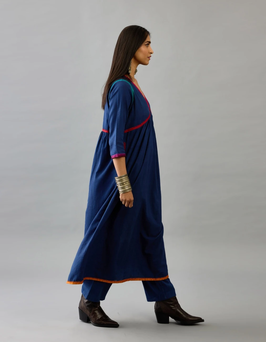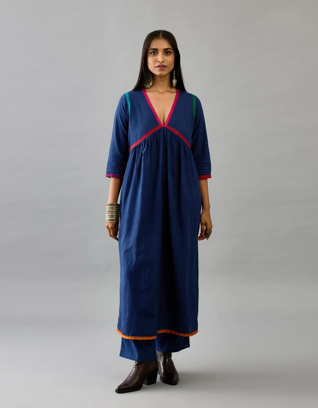 - Blue Handloom Cotton kurta dress with multi colored silk facing and embroidery detail at neck, hem and sleeves