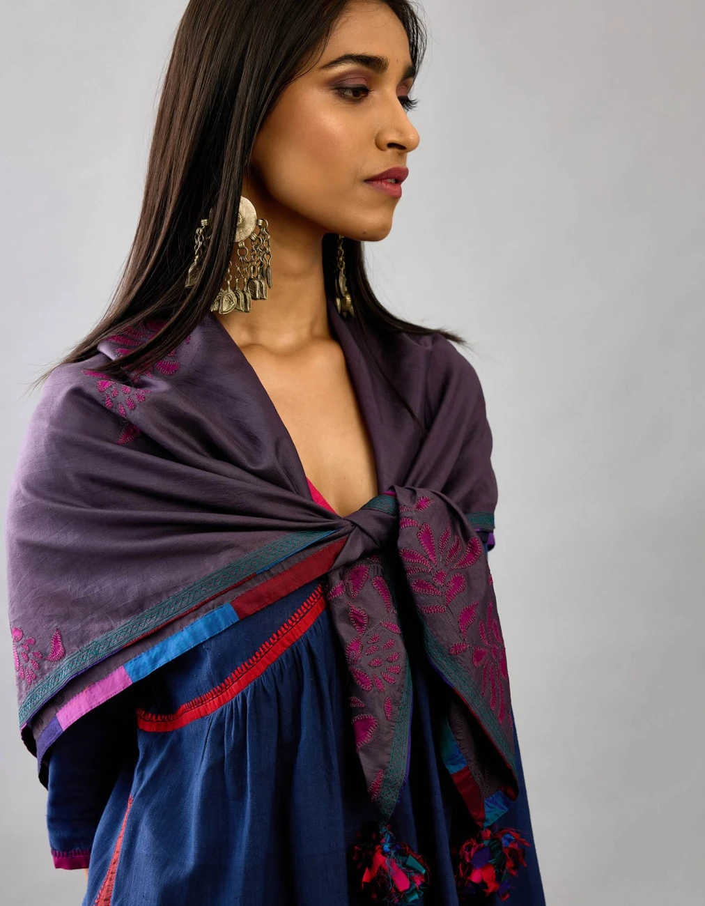 - Comes with grey silk square scarf with silk fabric applique work and embroidery at edges, it has multi colored silk fabric facing at edges and silk fabric tassels at all four corners