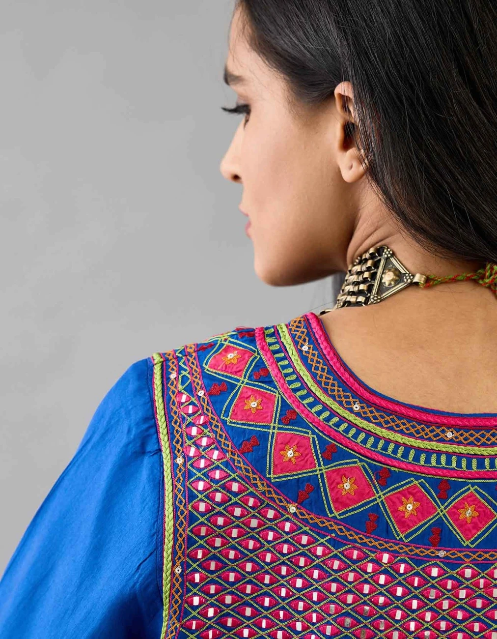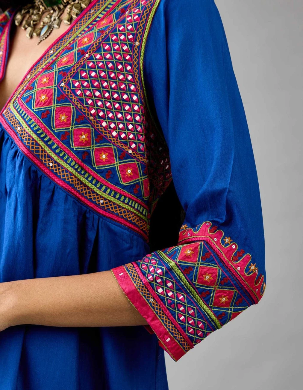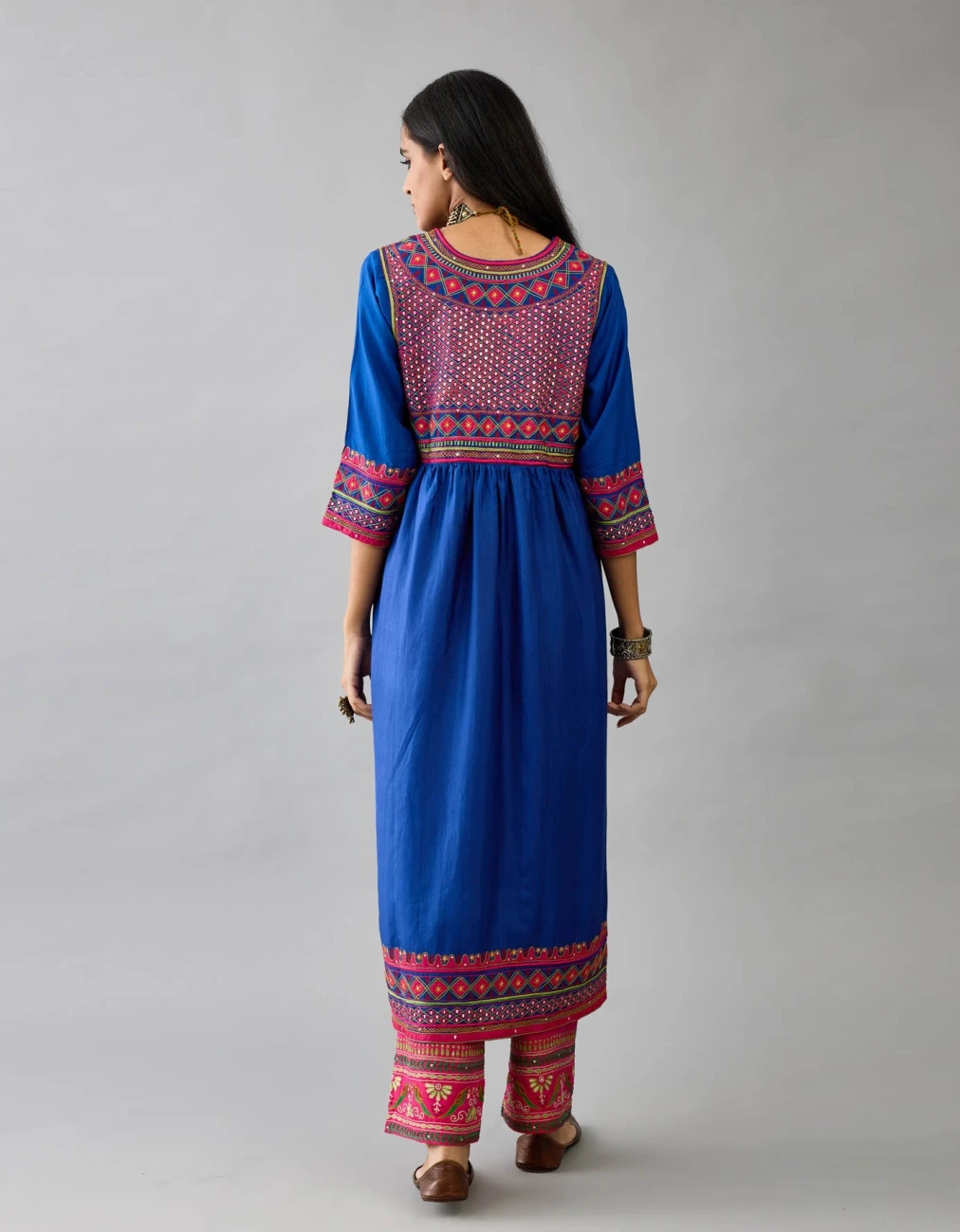 - Yoke, sleeves & hem are detailed with patch-work, silk thread embroidery, highlighted with mirror, sequins, tassels and braids