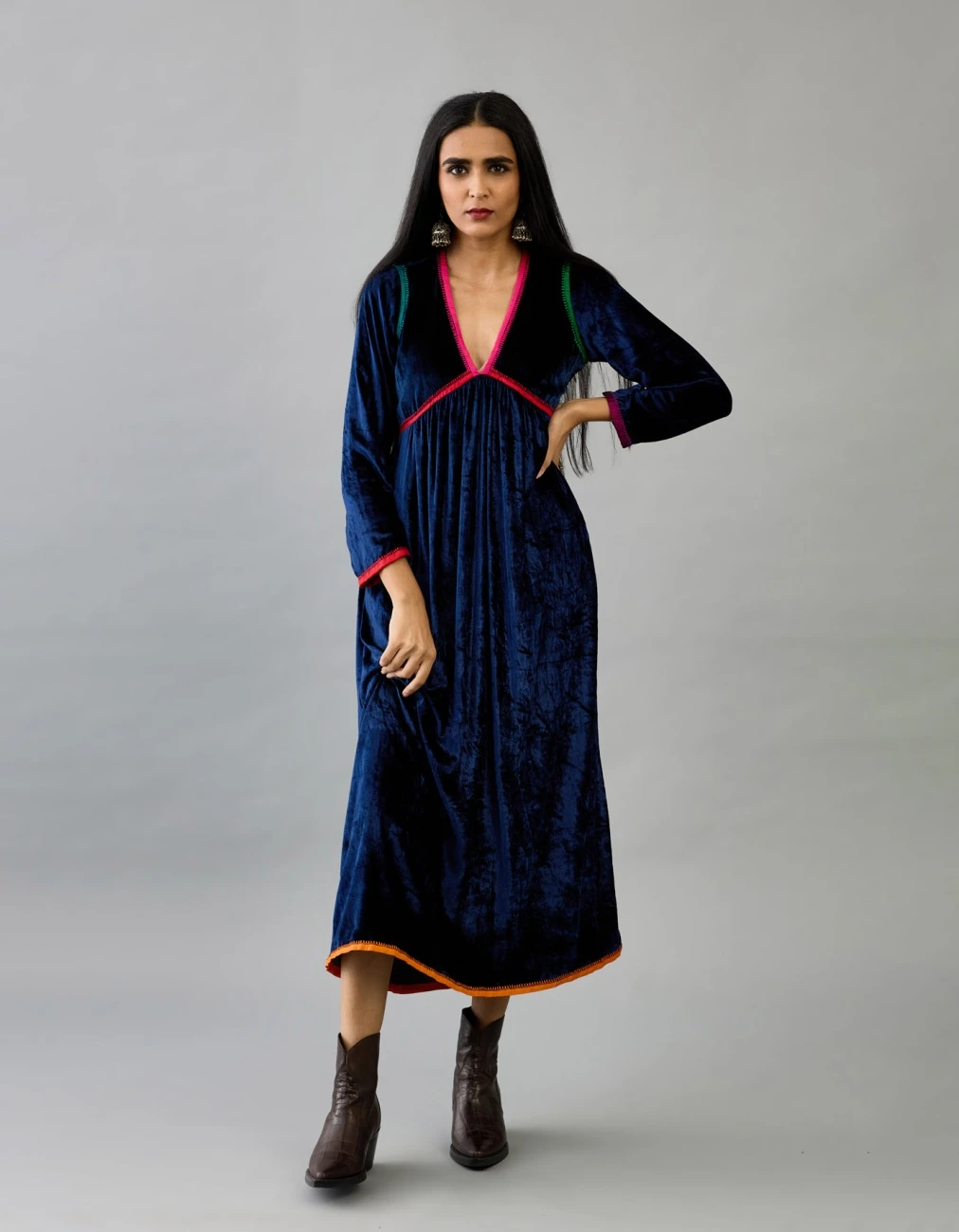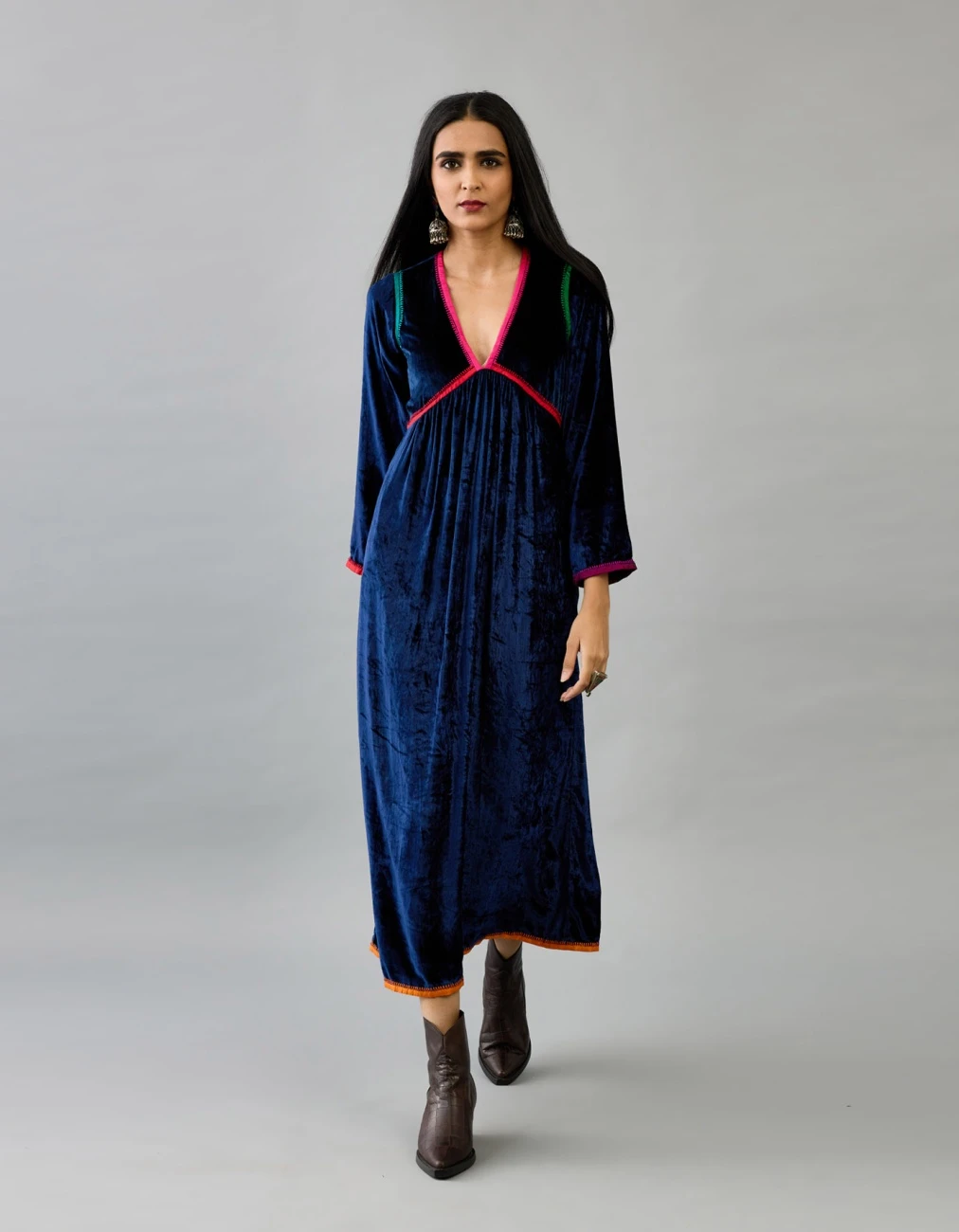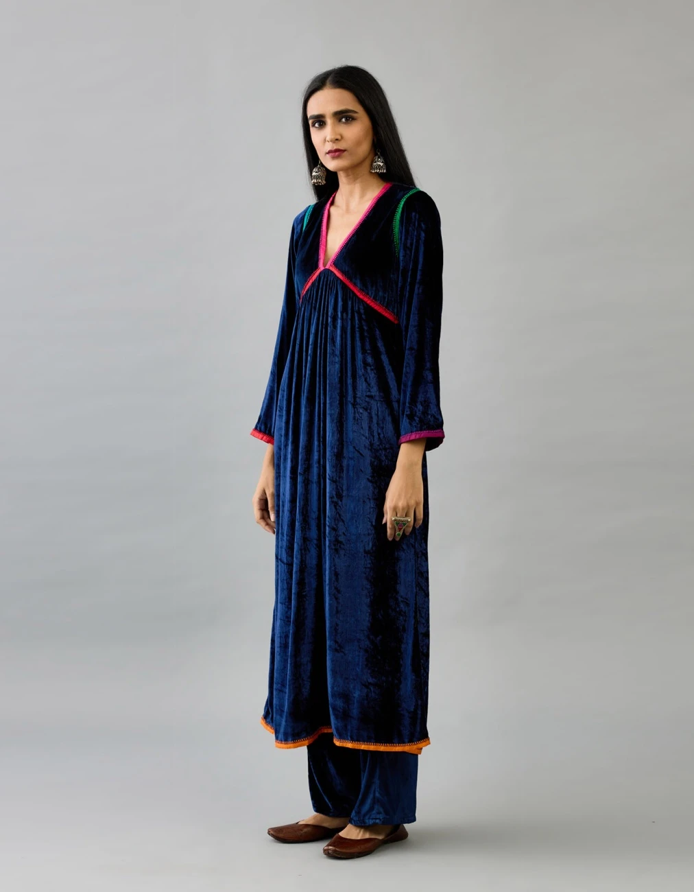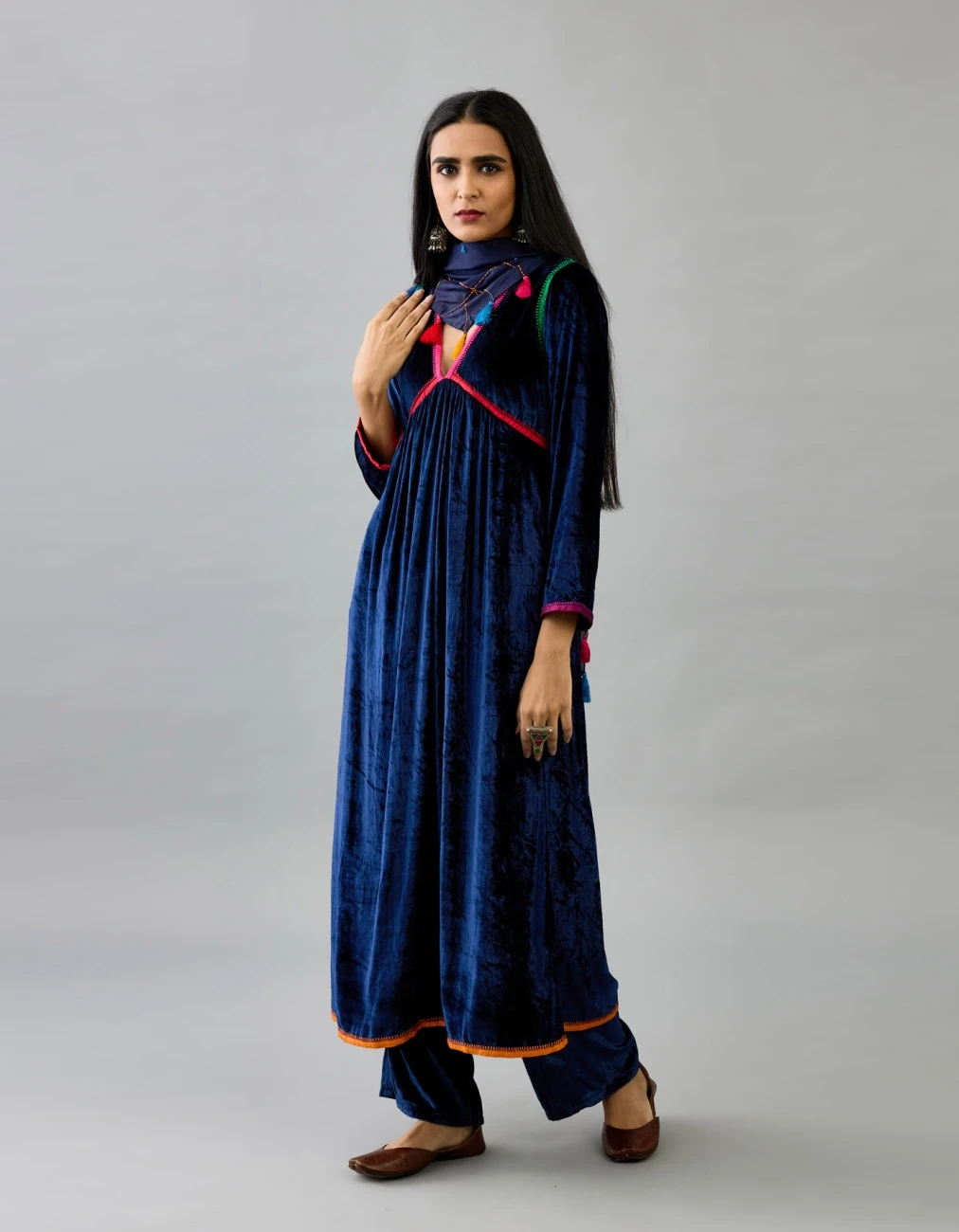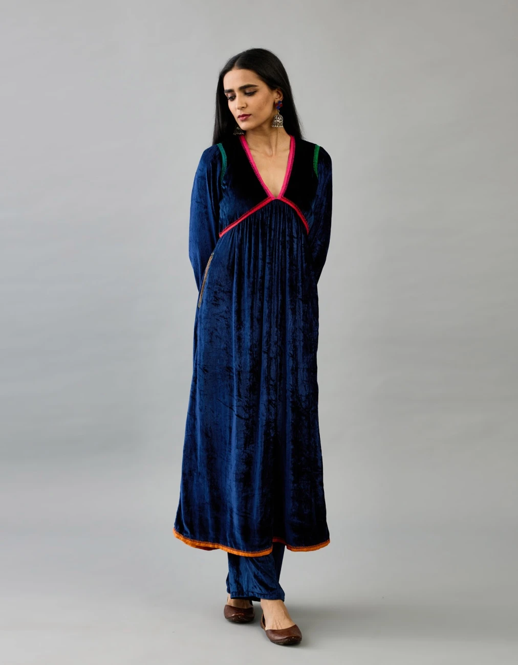 - Blue silk velvet kurta dress with multi colored silk facing and embroidery detail at neck, hem and sleeves