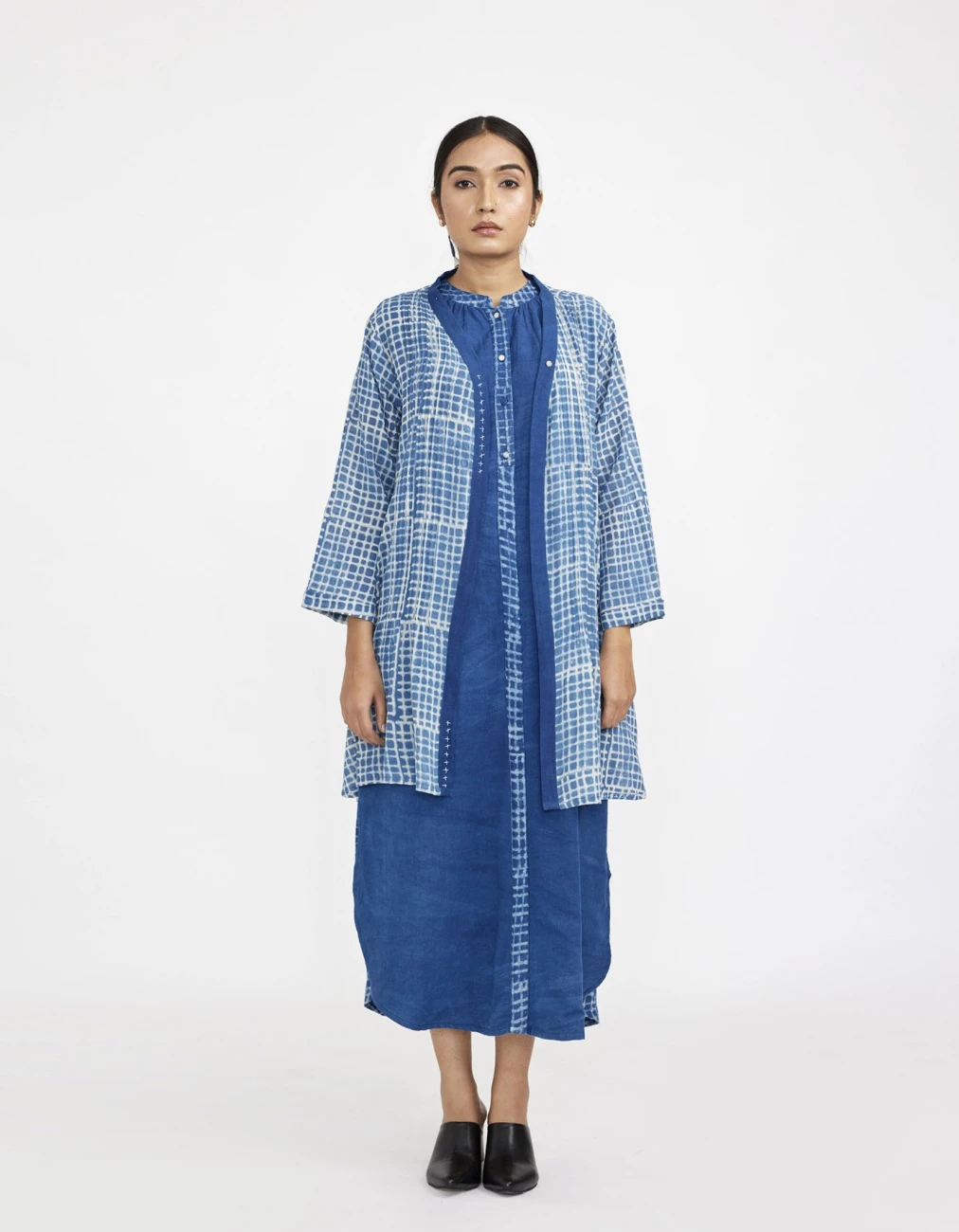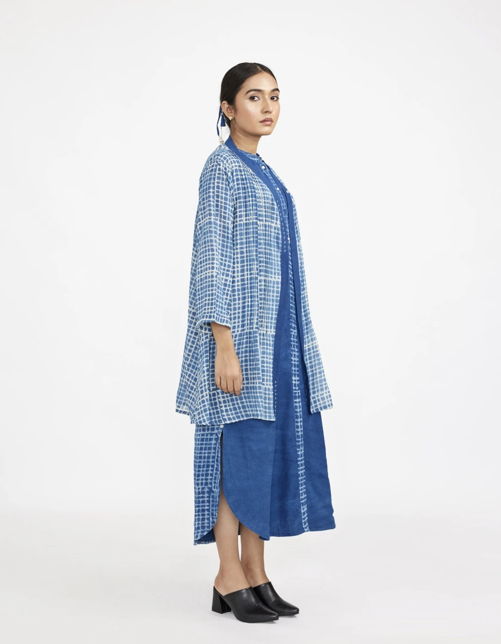 - Two piece dress set with solid button down sleeveless dress with lining paired with block printed fine cotton robe with pin tucks in front