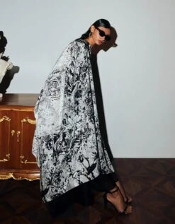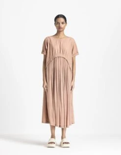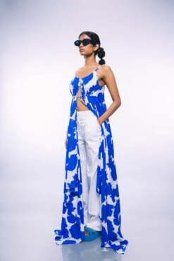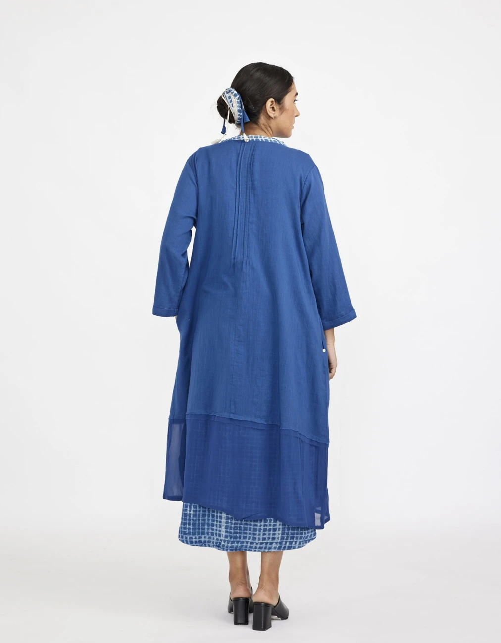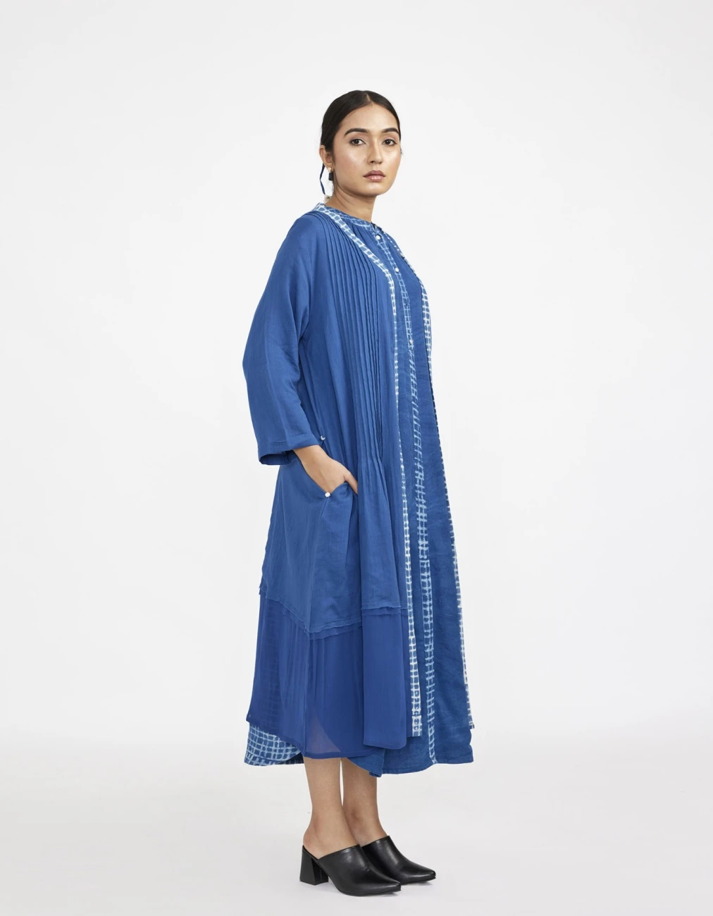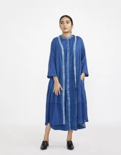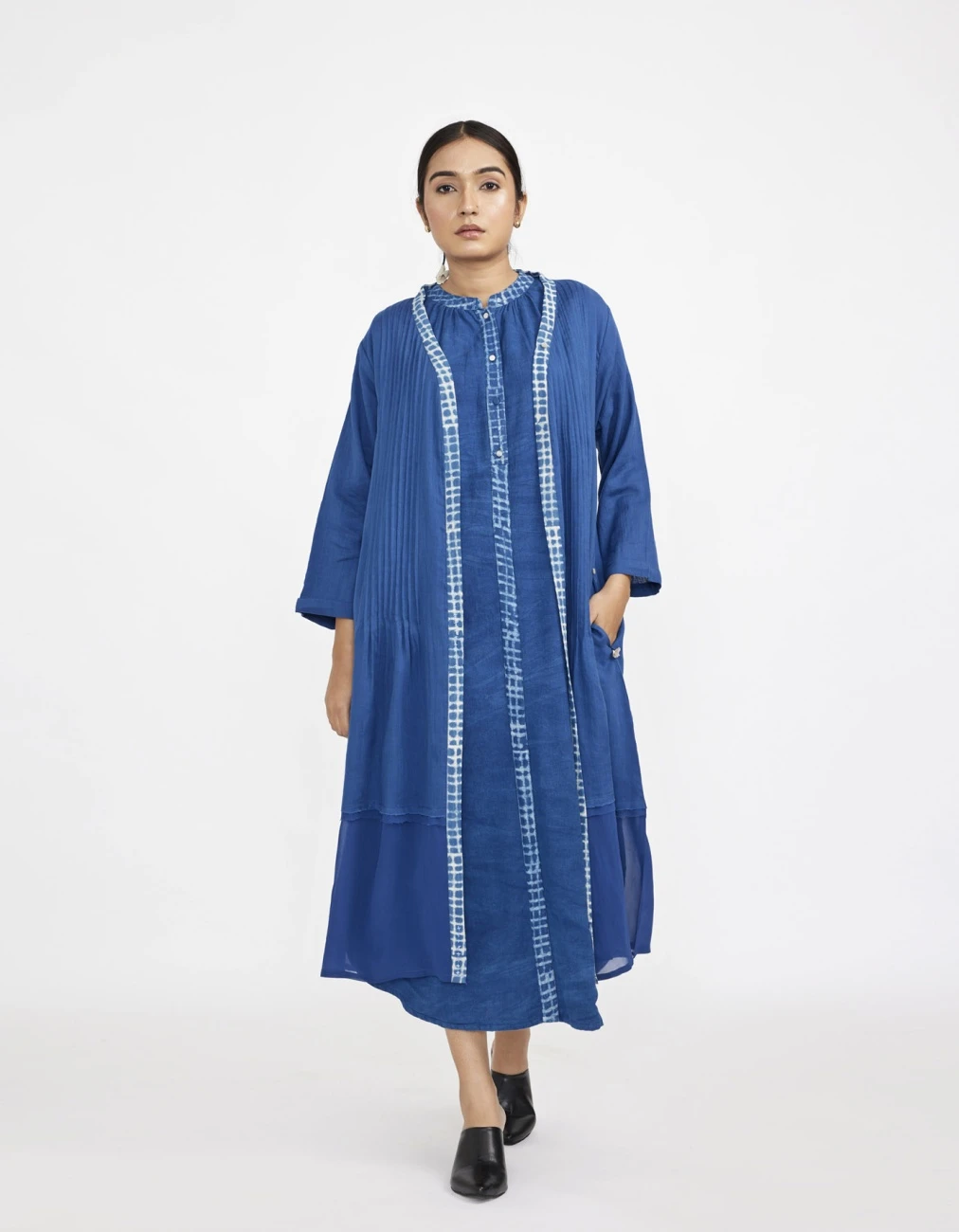 - Two piece dress set with solid button down sleeveless dress with lining paired with block printed fine cotton robe with pin tucks in front