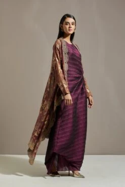 Salmon Pink Pleated Drape With Motif And Tassel Detail With Jersey Long Dress With Collar Detail