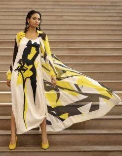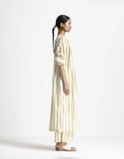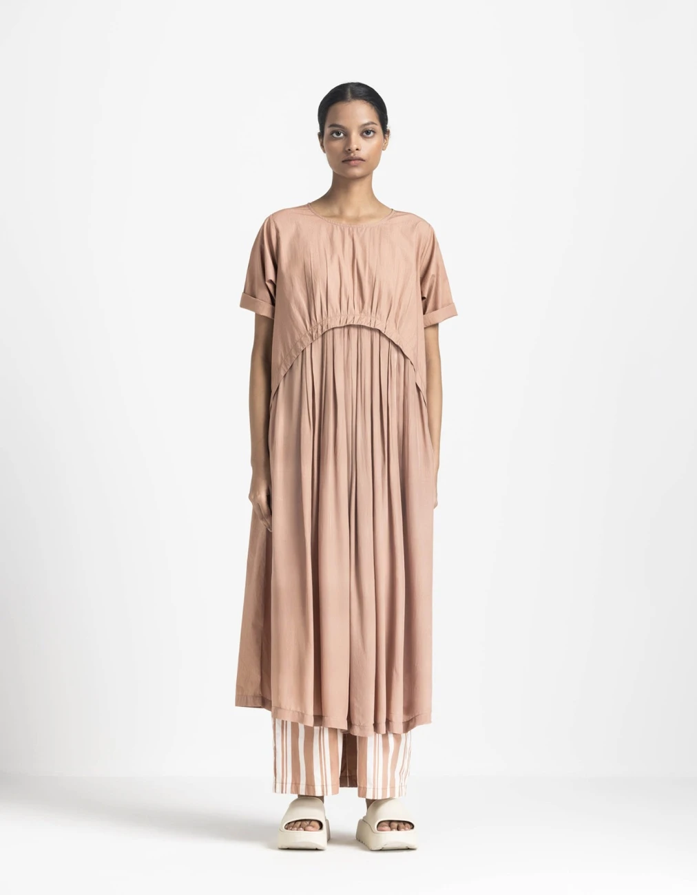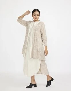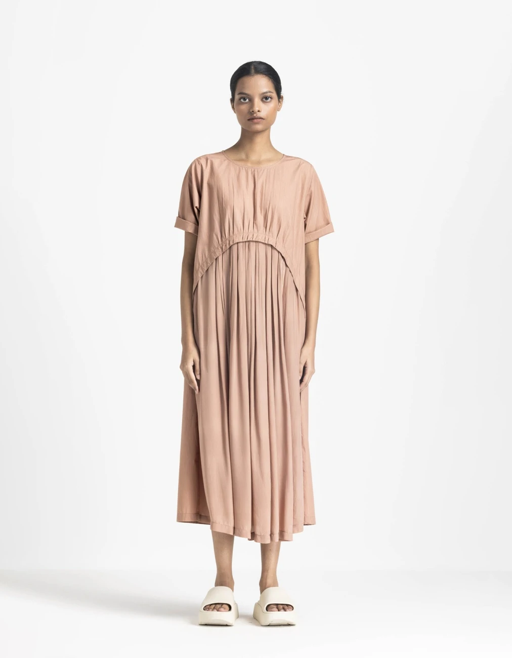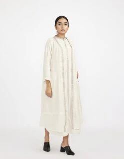 - Chanderi yoke relaxed fit dress with Front gathers in silk crepe, Side inseam pockets and Shoulder piping detail