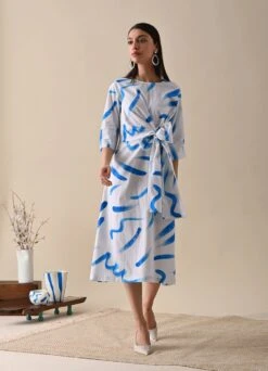- Blue stroke print dress with tie-up belt detail in the front