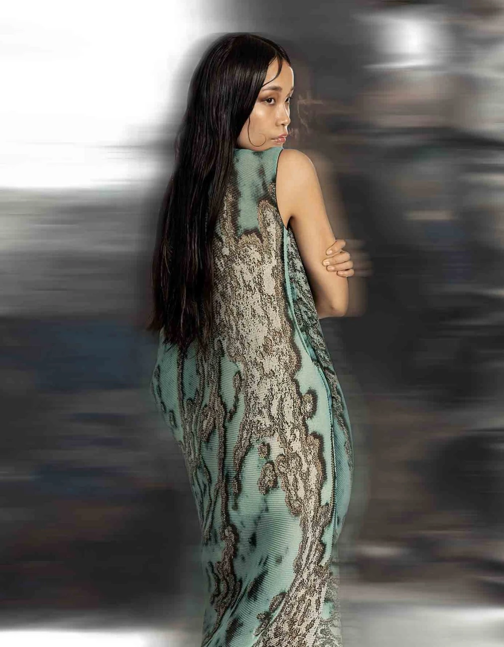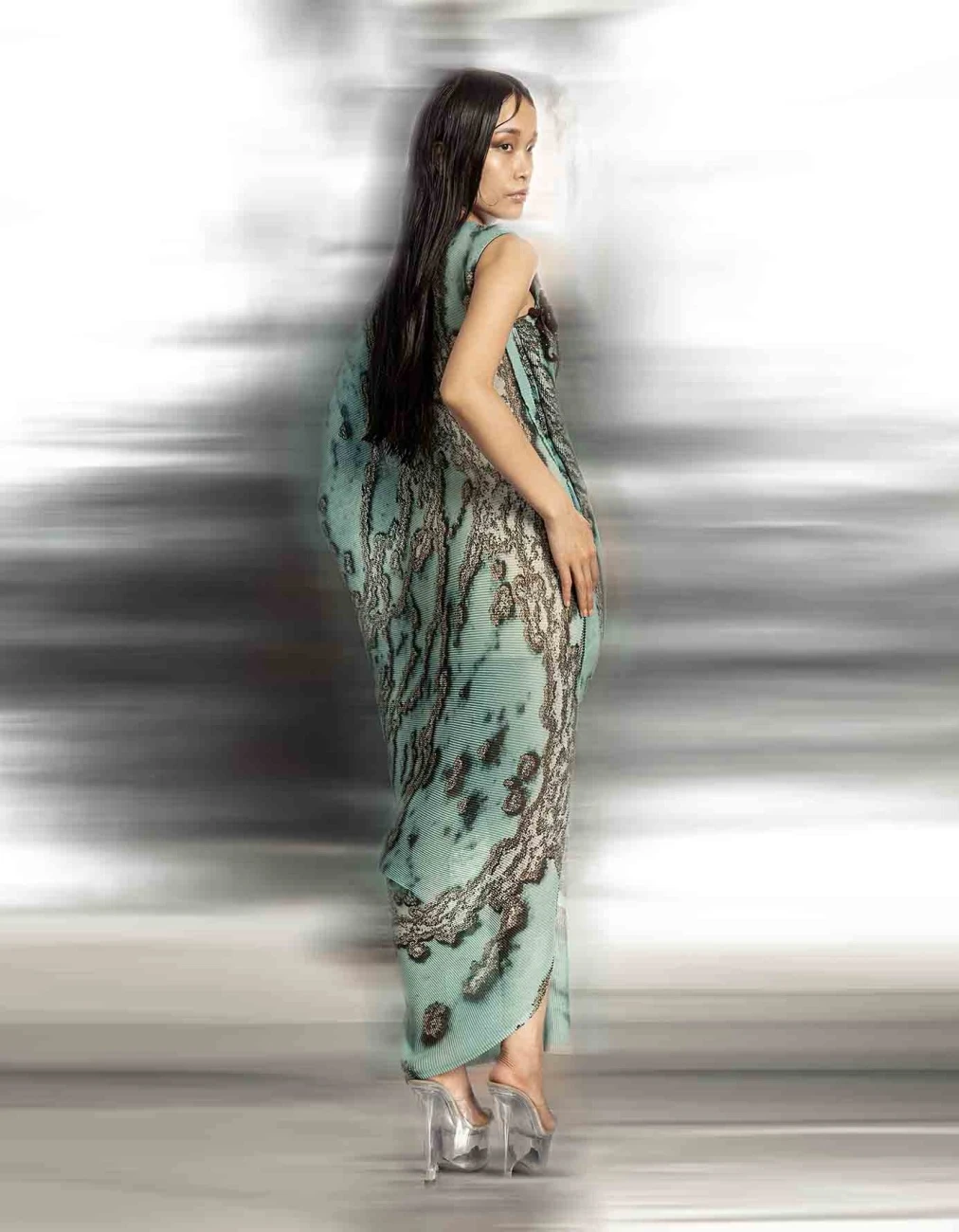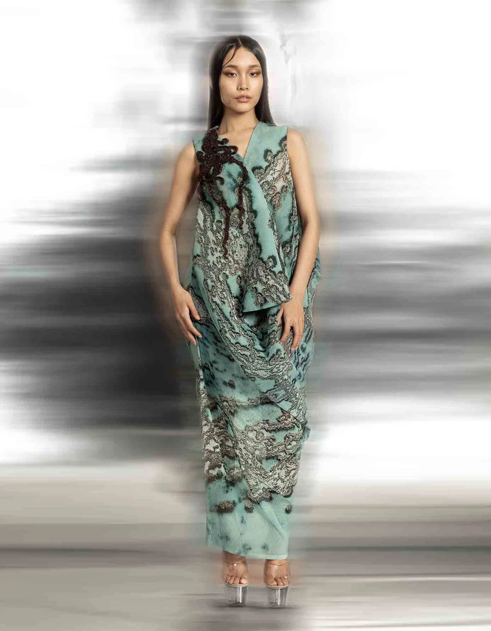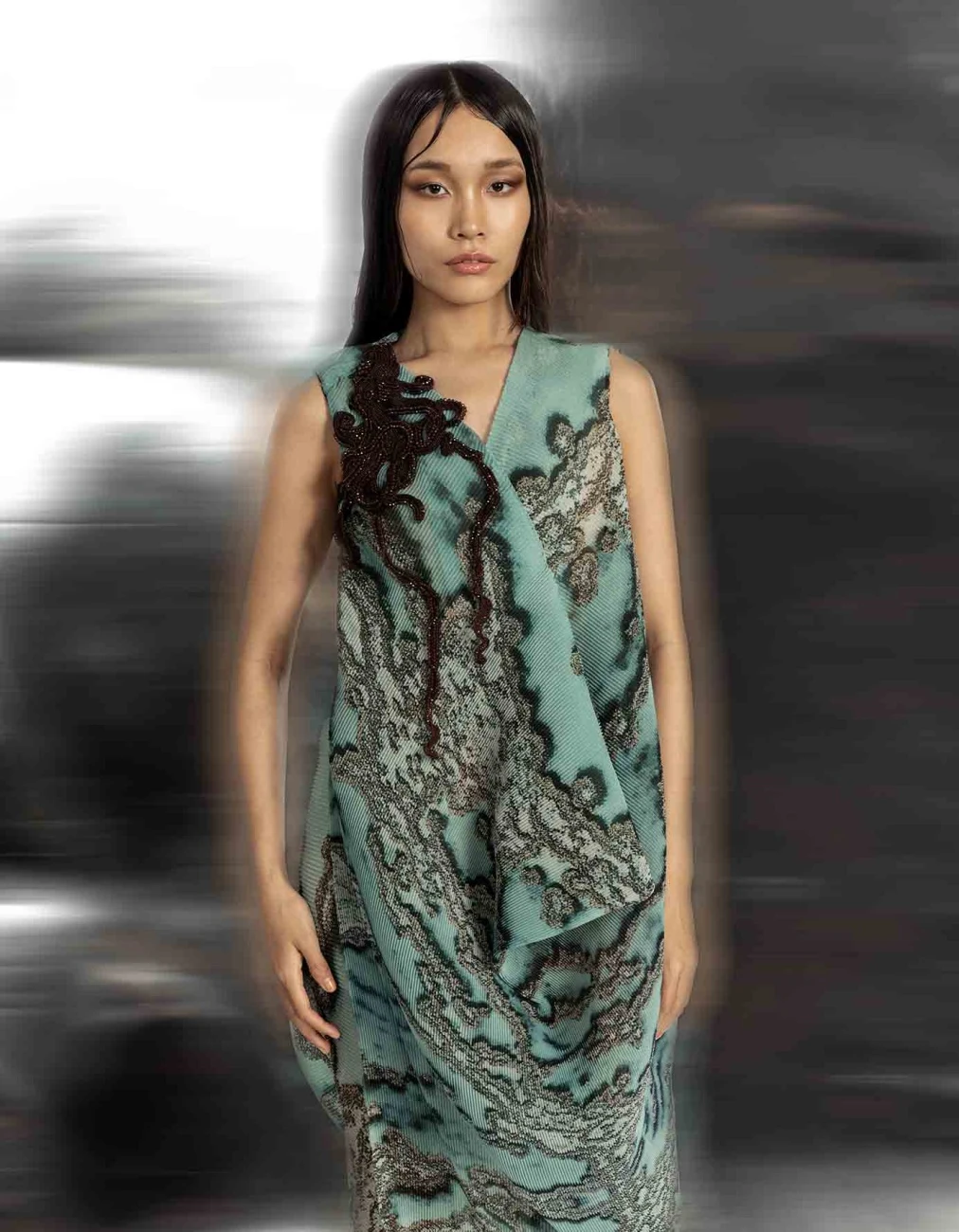 - Reef printed and textured draped V-neck dress with front cowl and chocolate 3D embellishment detailing.