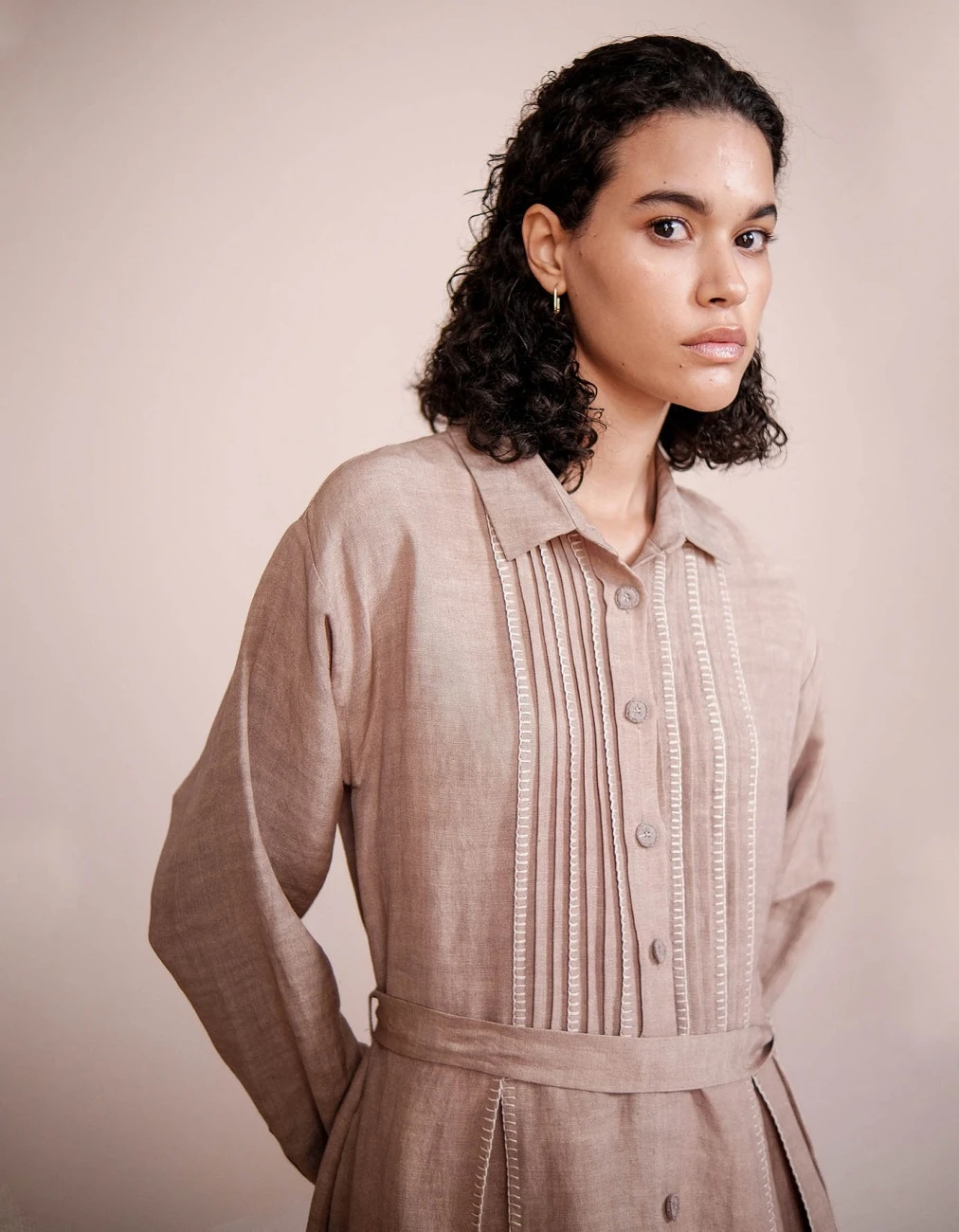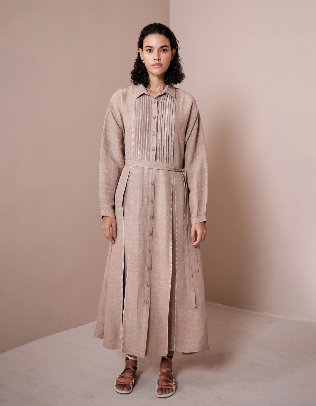 - Long collared dress with pleats and crochet details