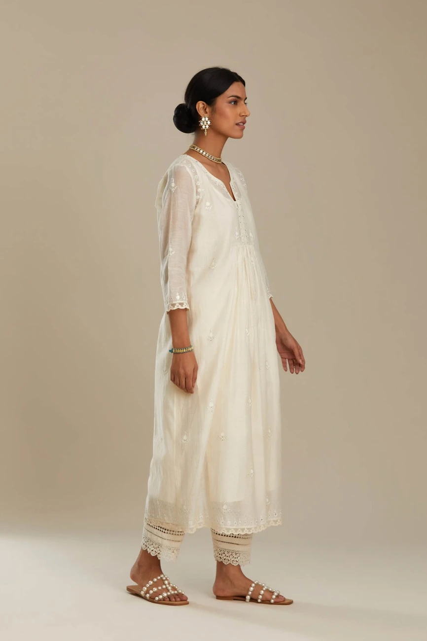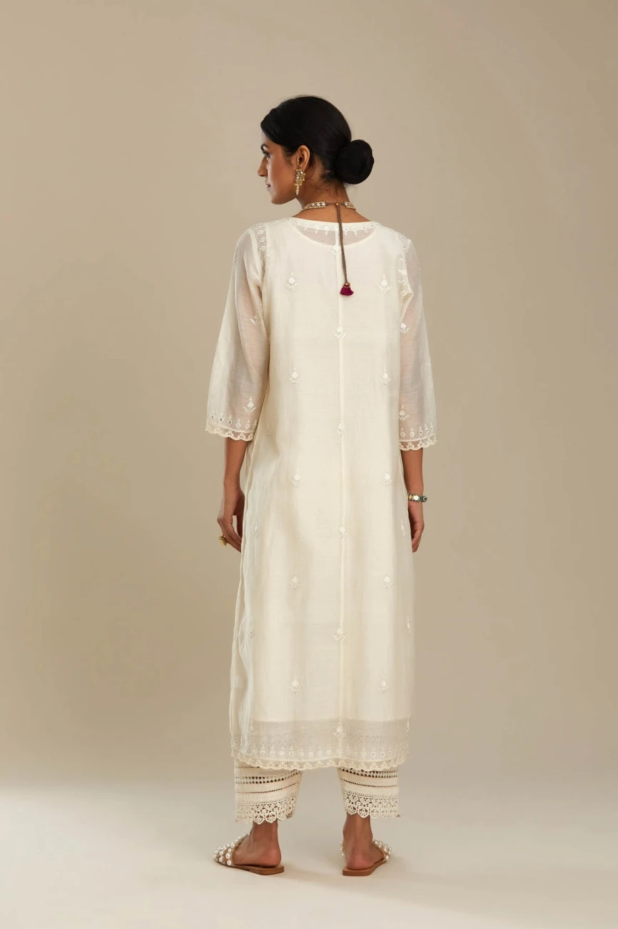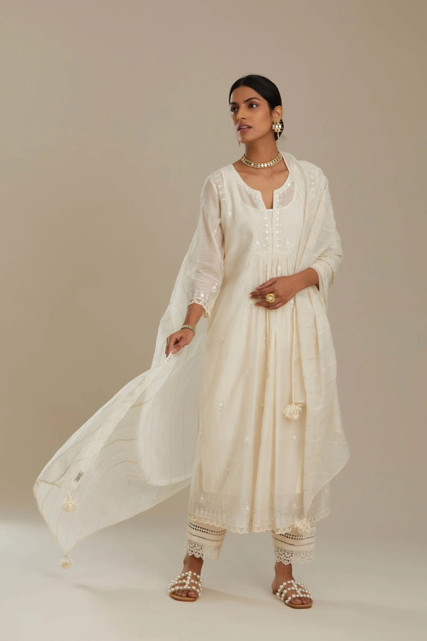 - Cotton chanderi Kurta dress with all-over off white silk thread embroidery, highlighted with sequins and beads