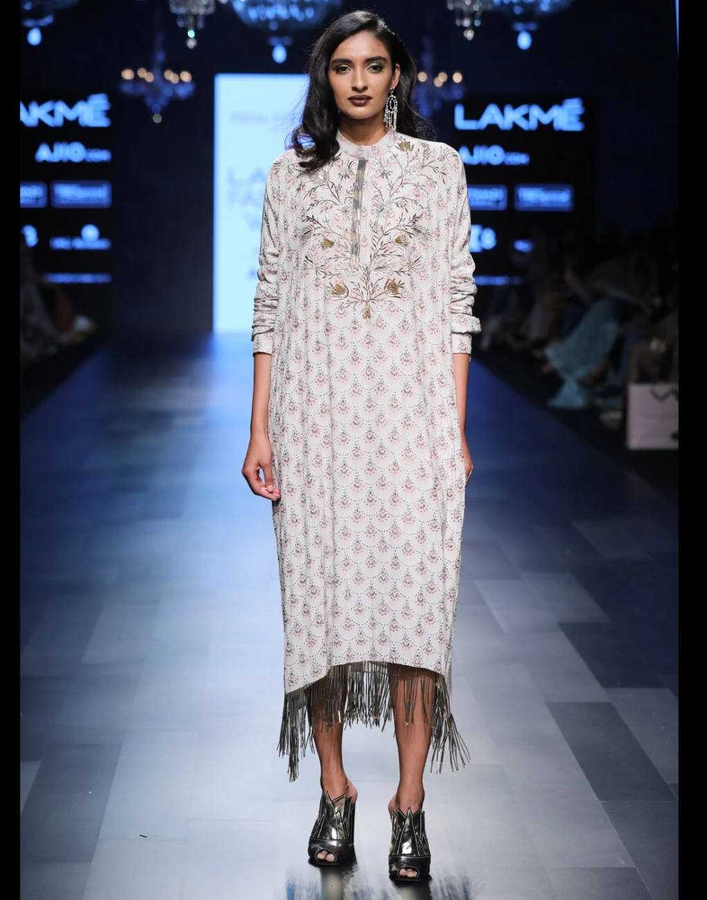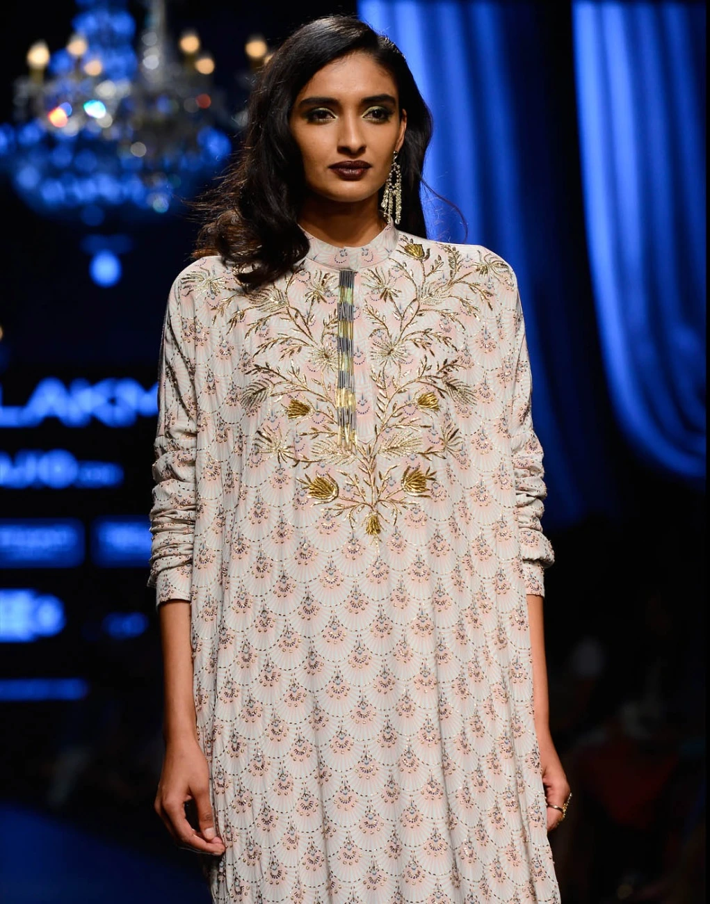 Payal Singhal combines clean and minimalist cuts with exquisite pearl and mukaish embroidery. The silhouettes seamlessly merge the traditional and the modern by pairing off-shoulder cholis with lehengas, and featuring cold shoulder kurtas and scalloped hemlines.