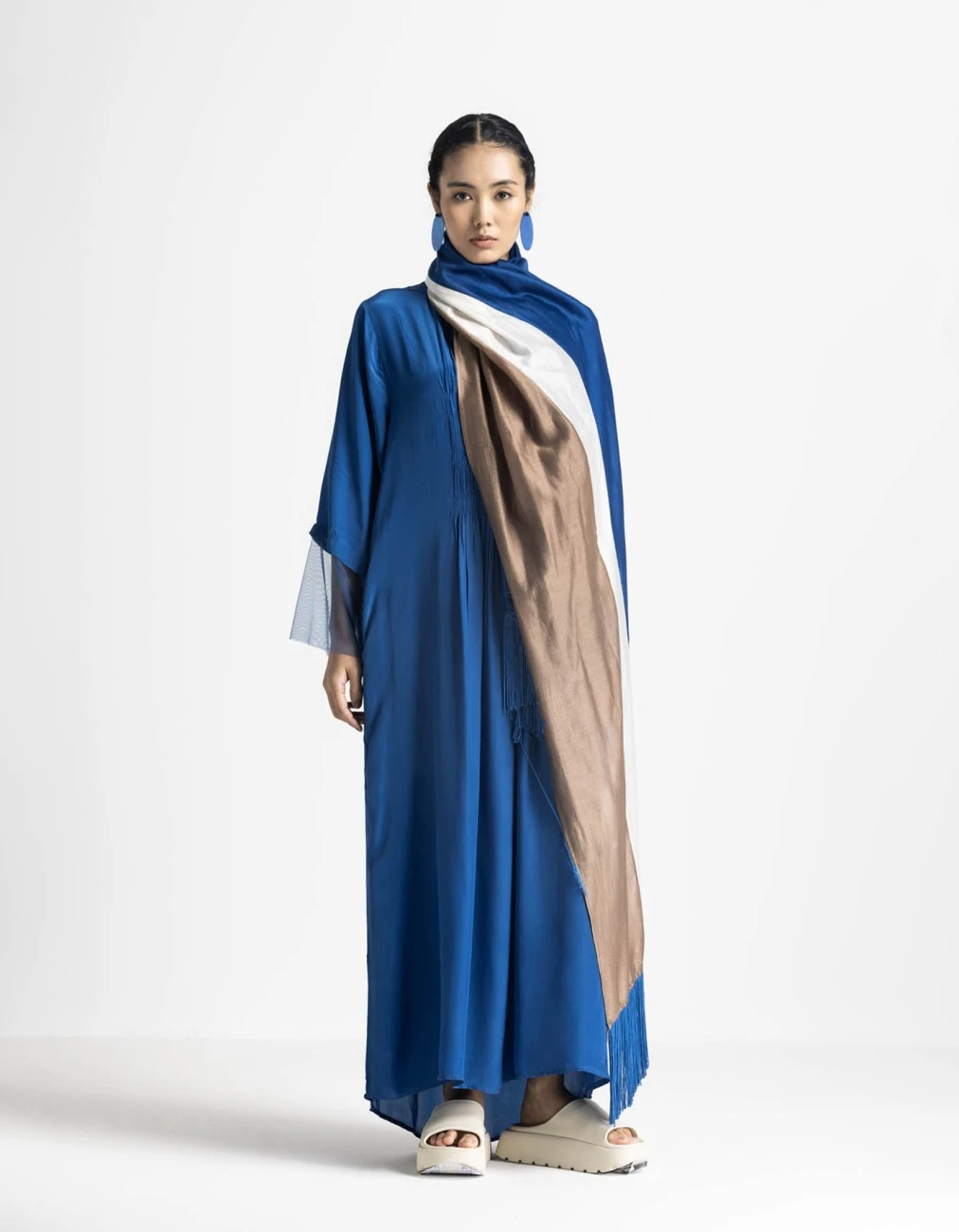 - Color – Dress : Electric Blue, Scarf : Electric Blue + Cedar + Ivory