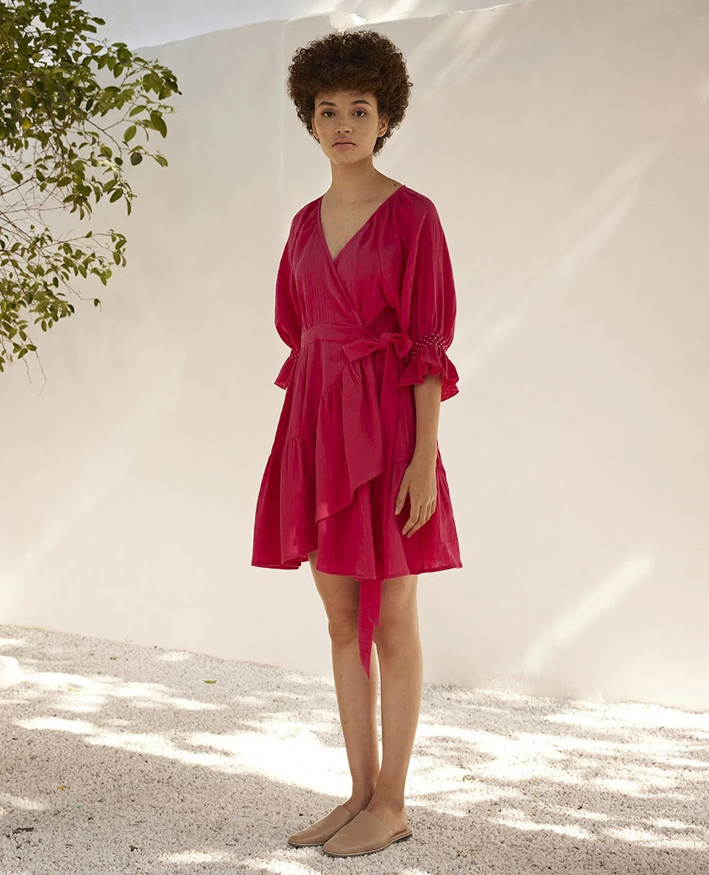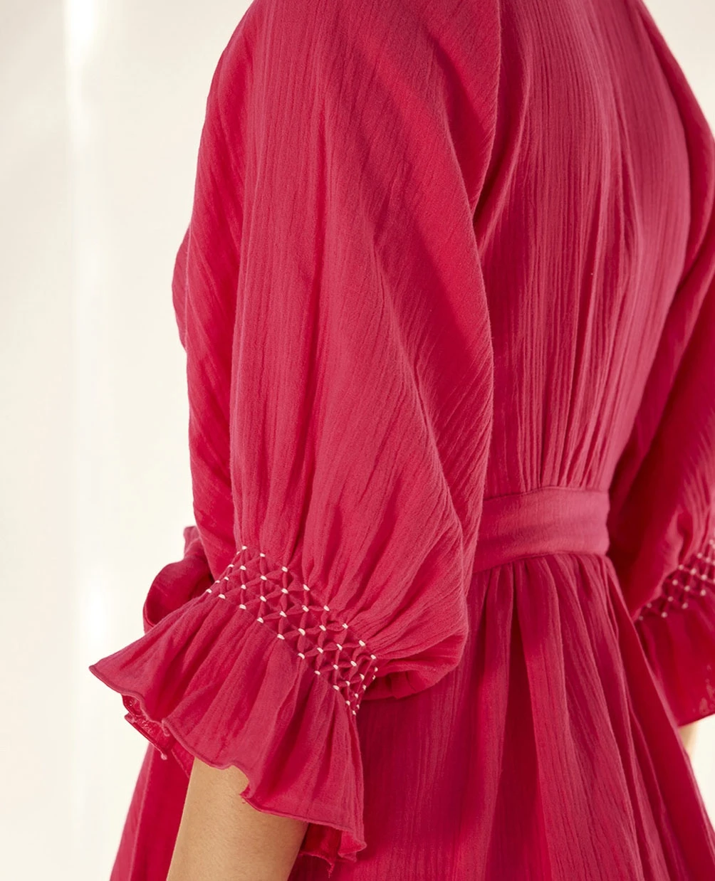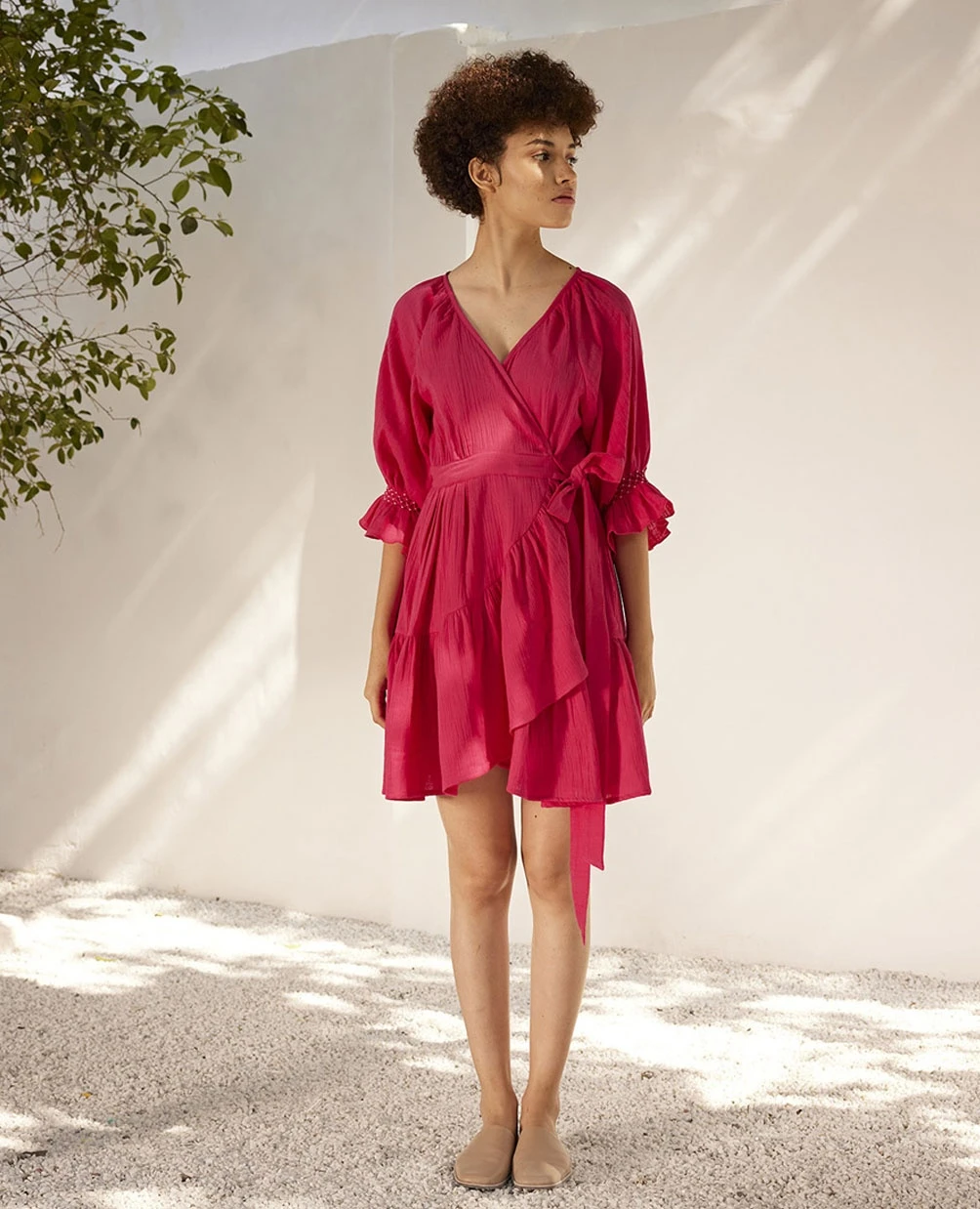 - A fuchsia pink double cotton wrap dress with front tieup opening