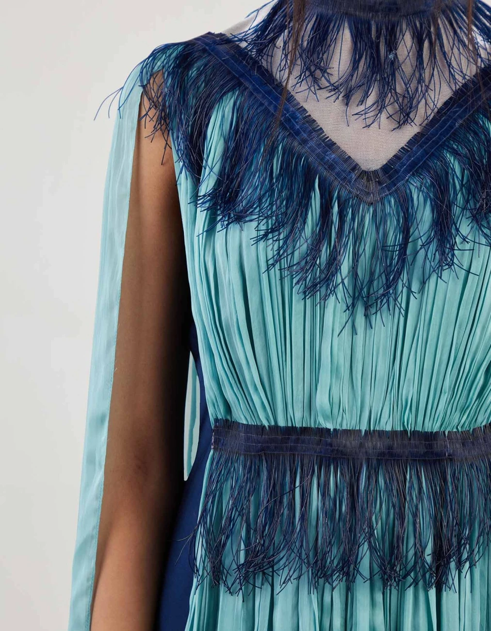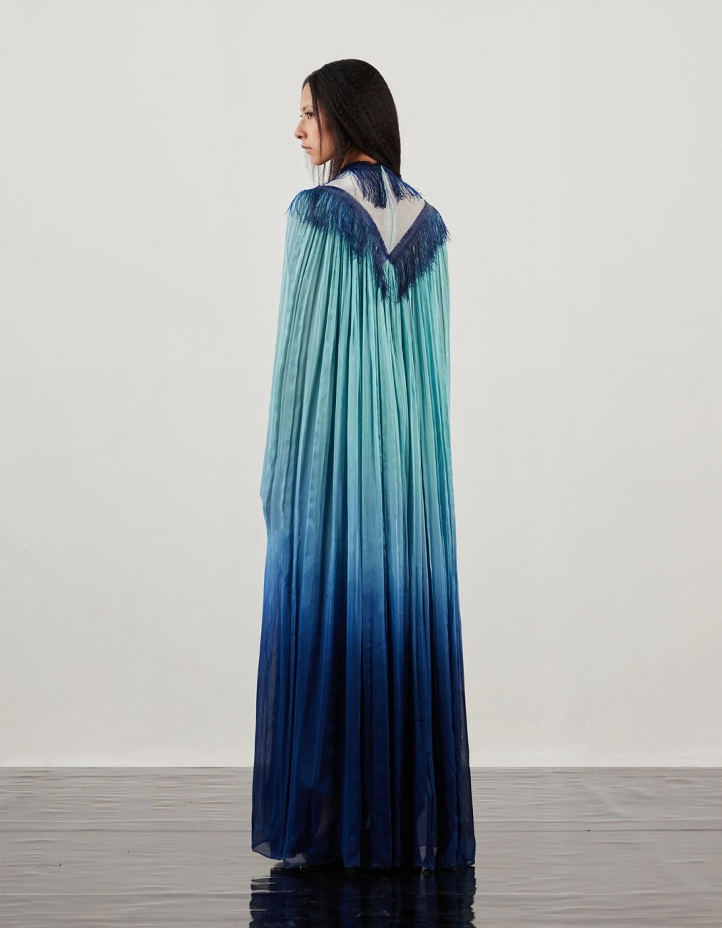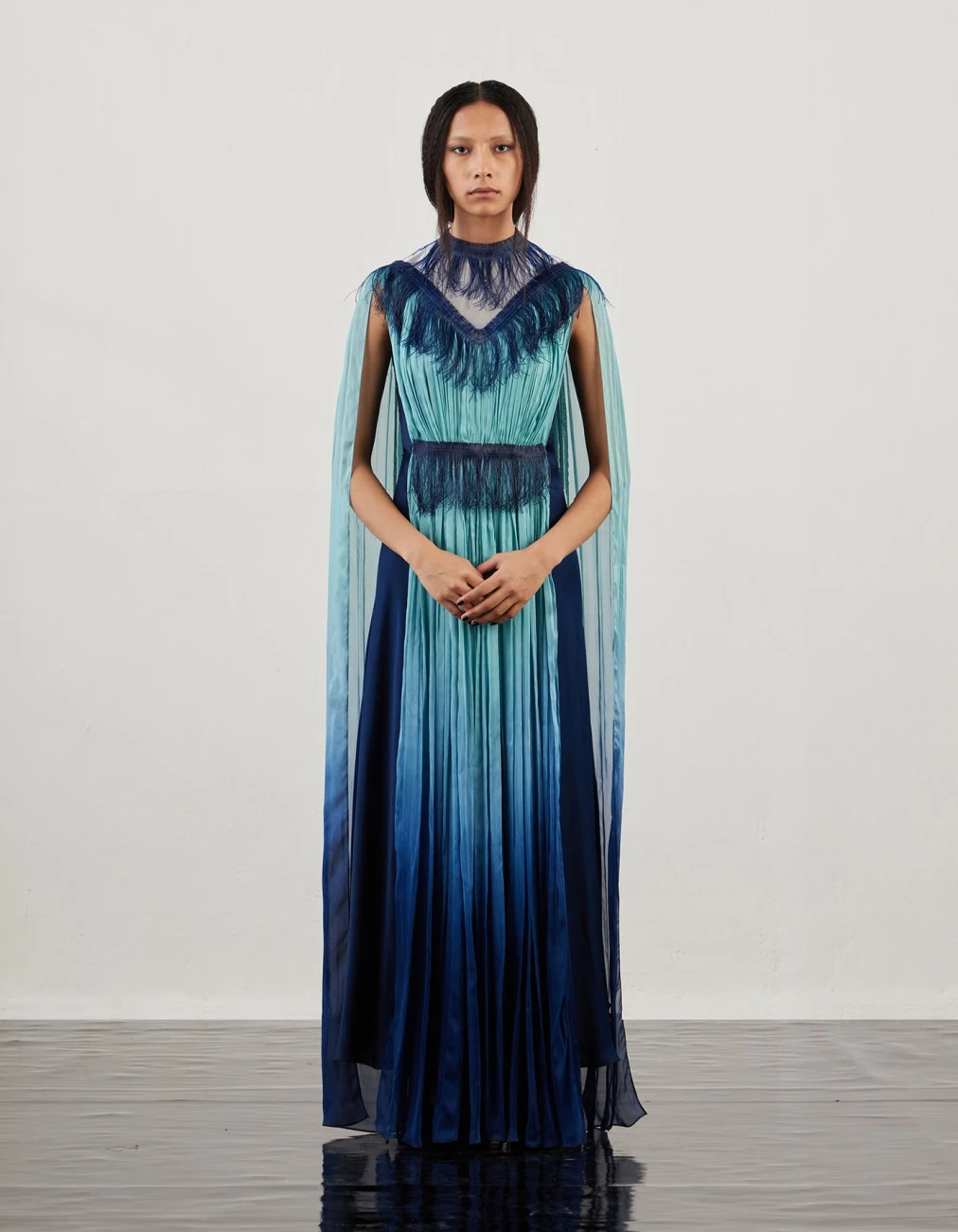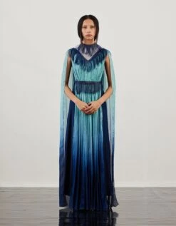 - Gathered chiffon kaftan dress detailed with hand-embroidered glass yarn yoke and belt