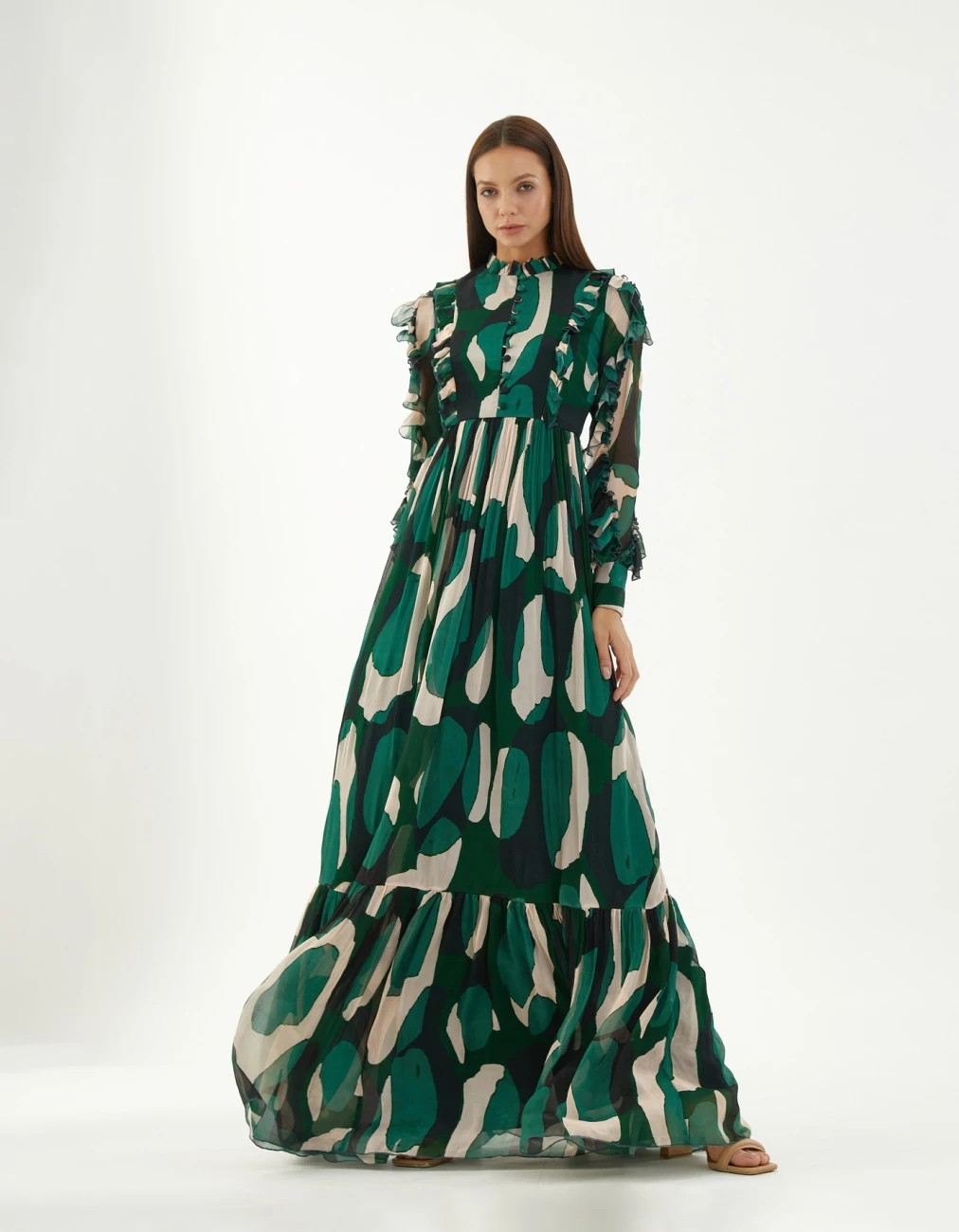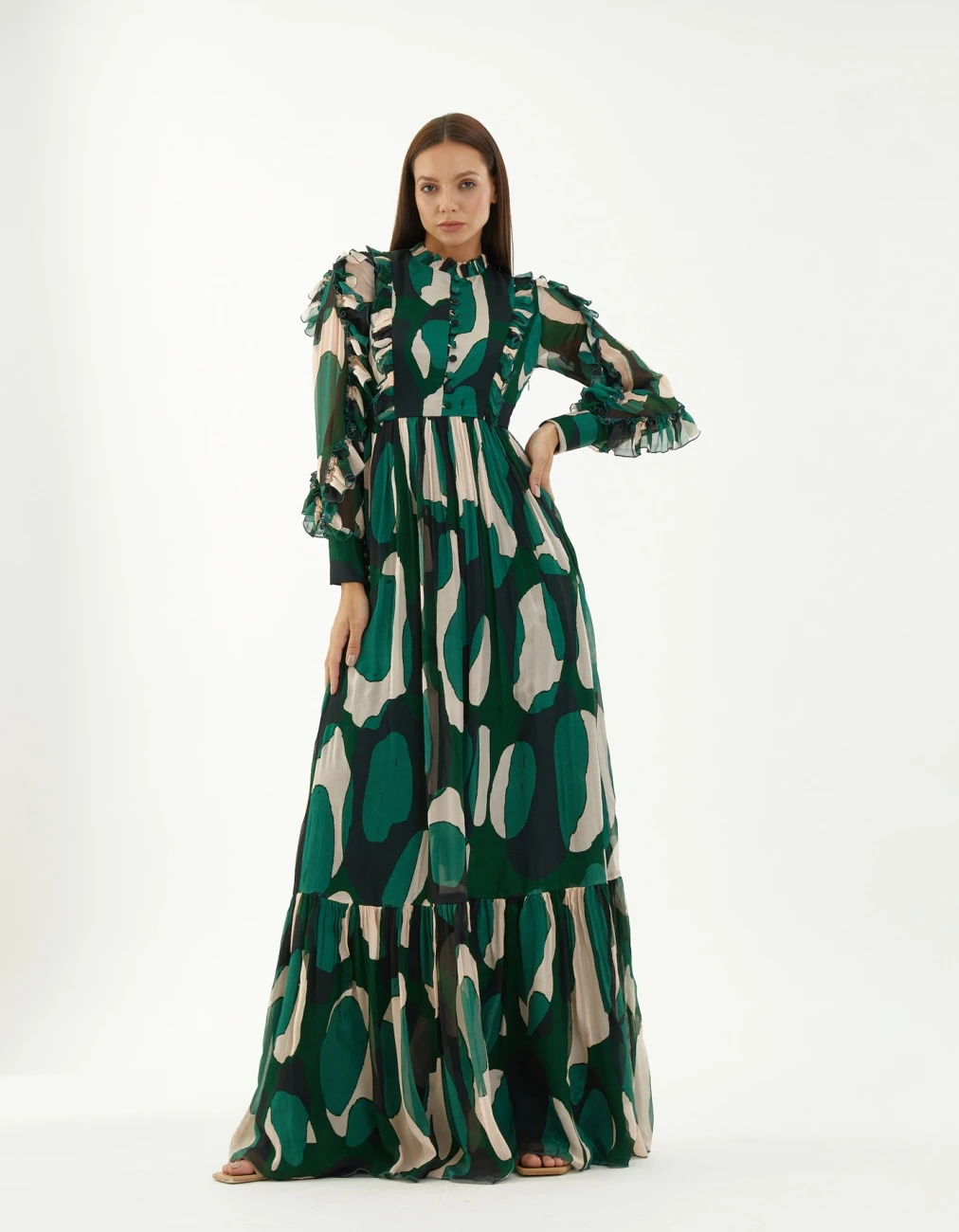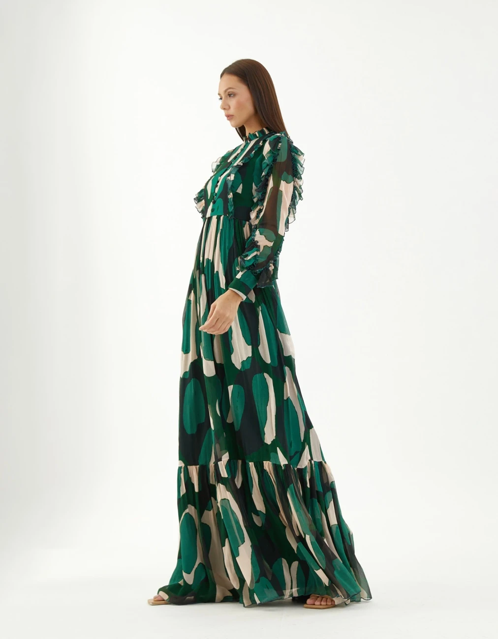 Green Chiffon Abstract Frill Long Dress