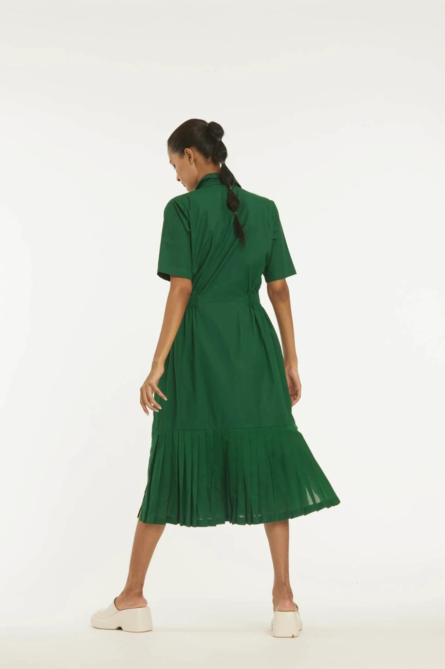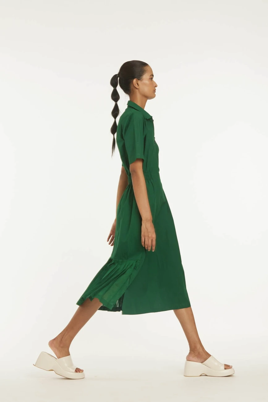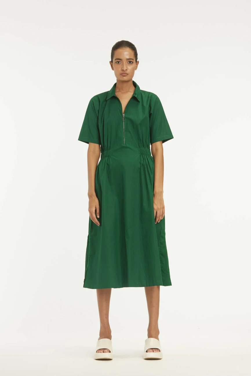 - Dress- side elastic detail with collar neckline and front zipper opening