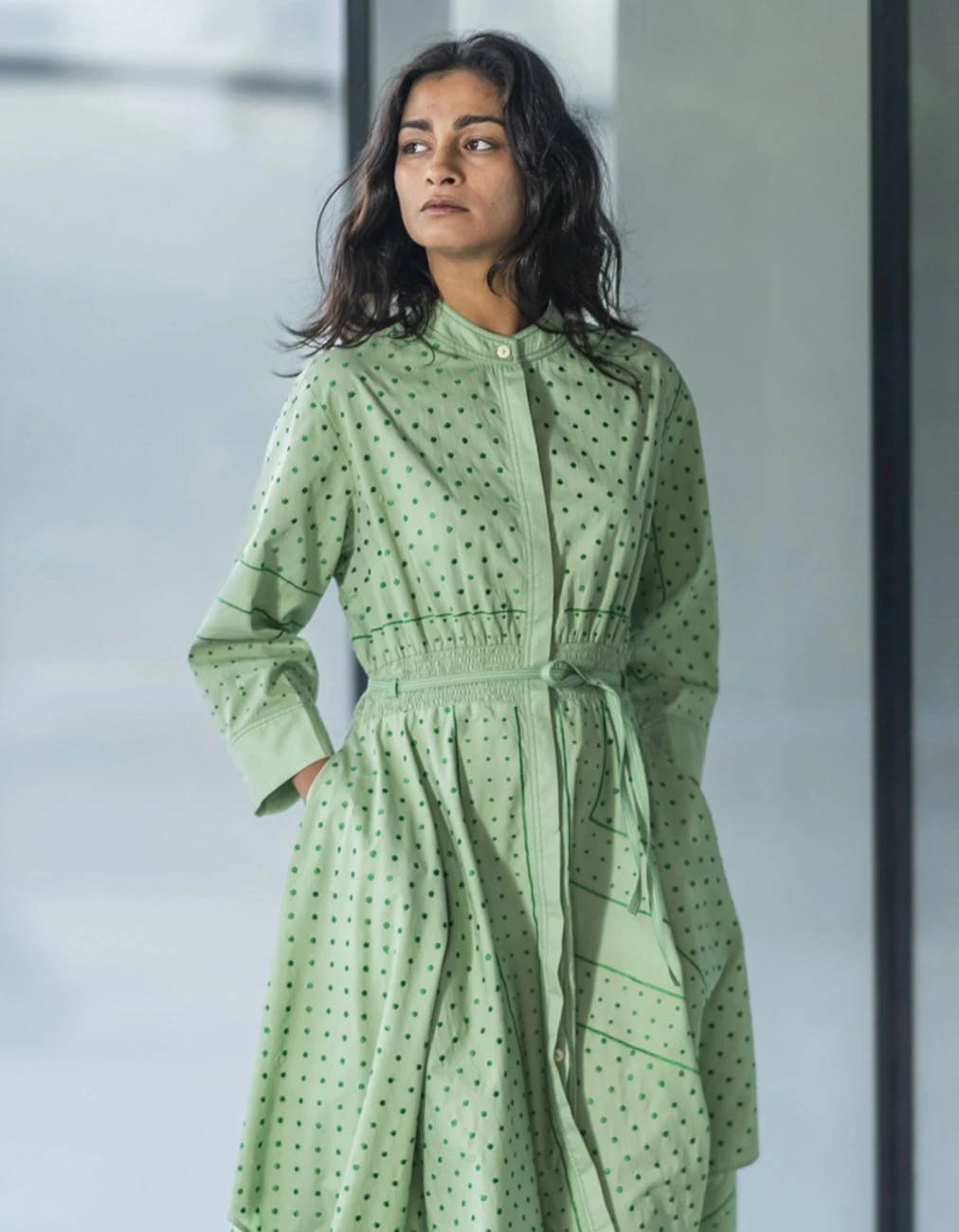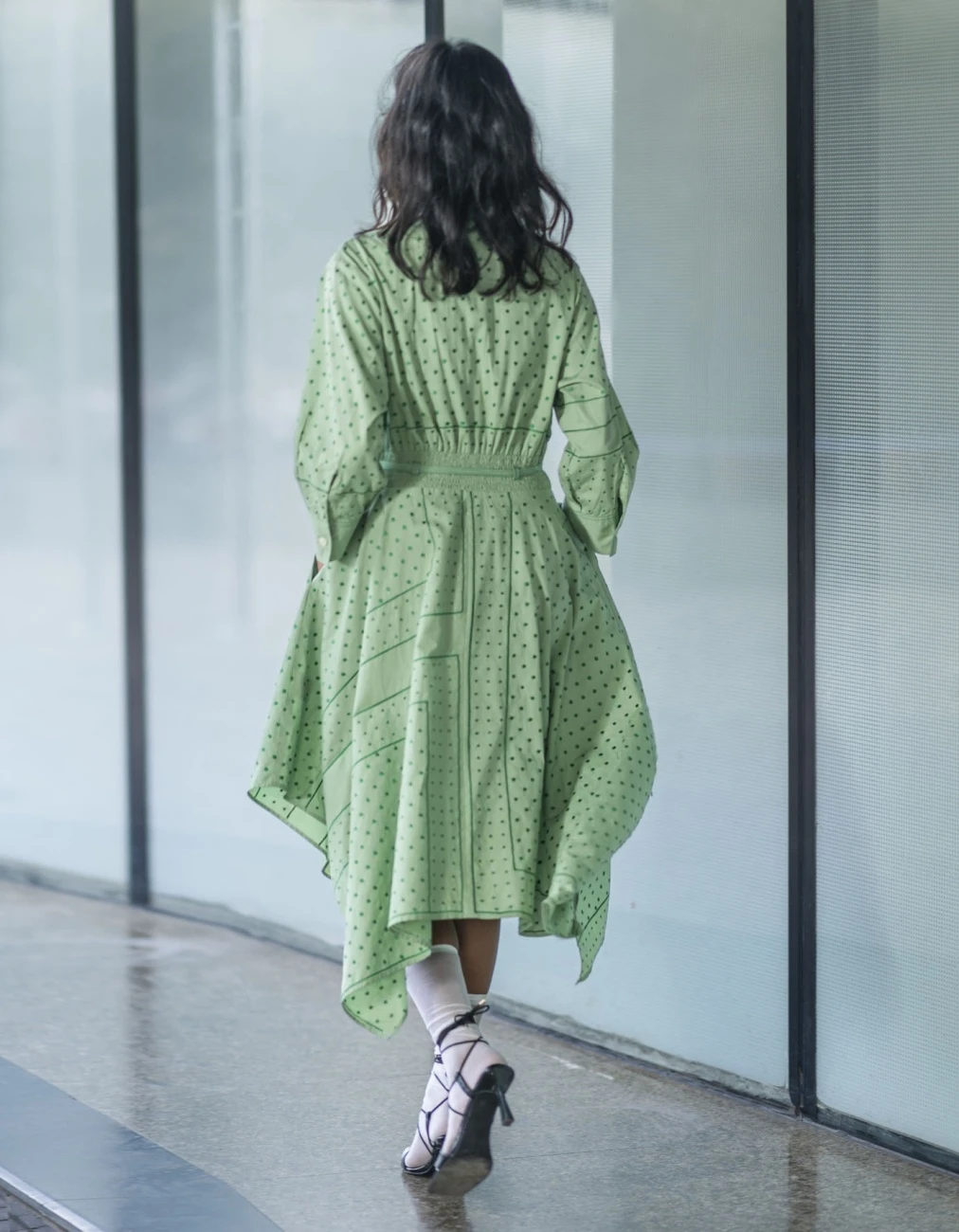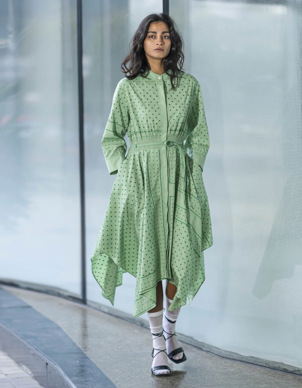 - The dress features a hankercheif hem and embroidered dots in silk threads