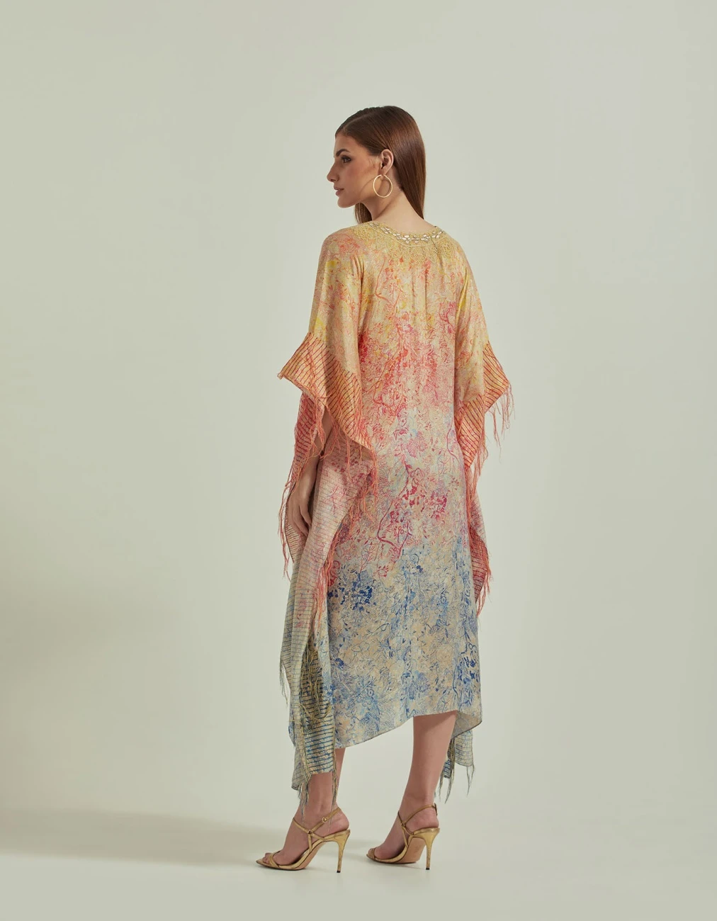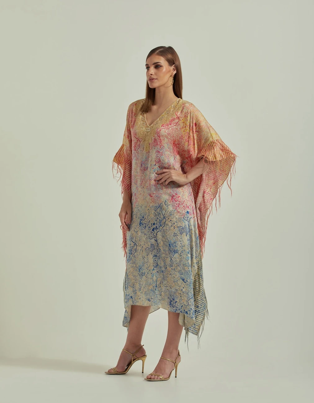 Hand Block Printed Multi Colour Kaftan Dress Embellished With Gota Patti Cross Stitch Around The Neck Line