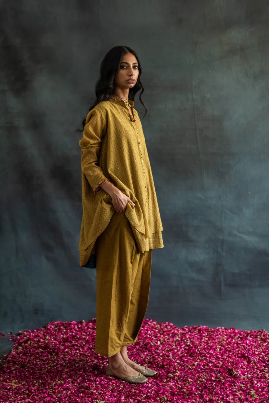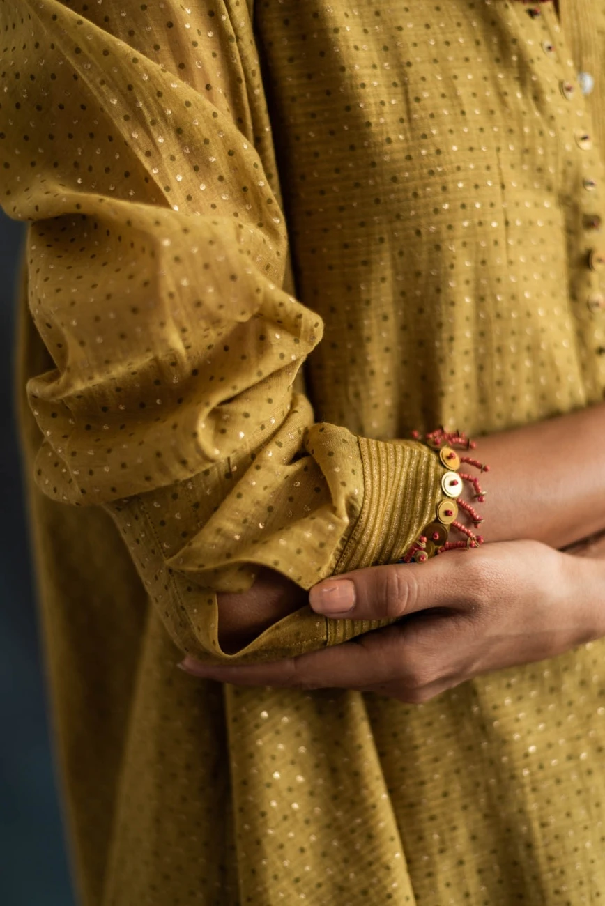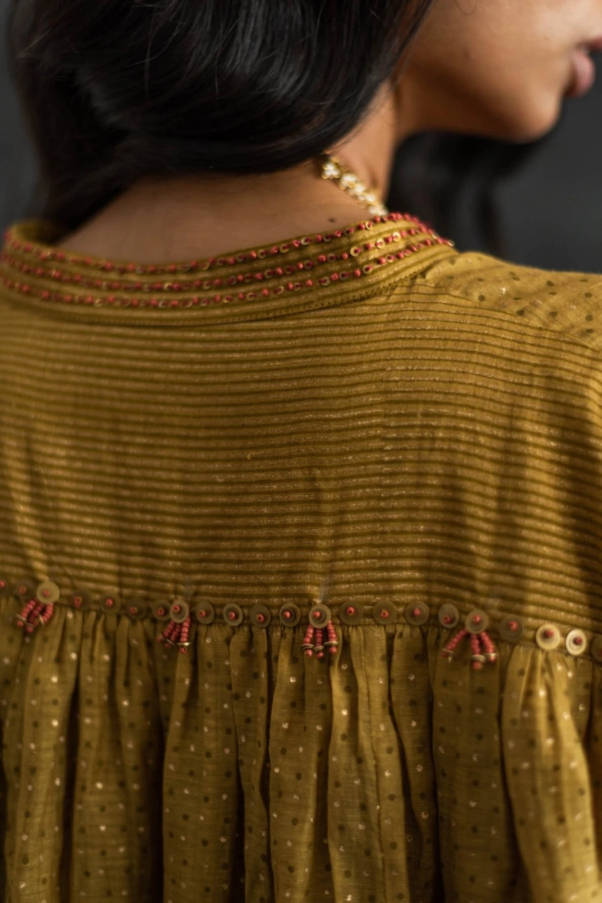 - Double layered hand block printed, with metal sequins and beads detailing at collar and back