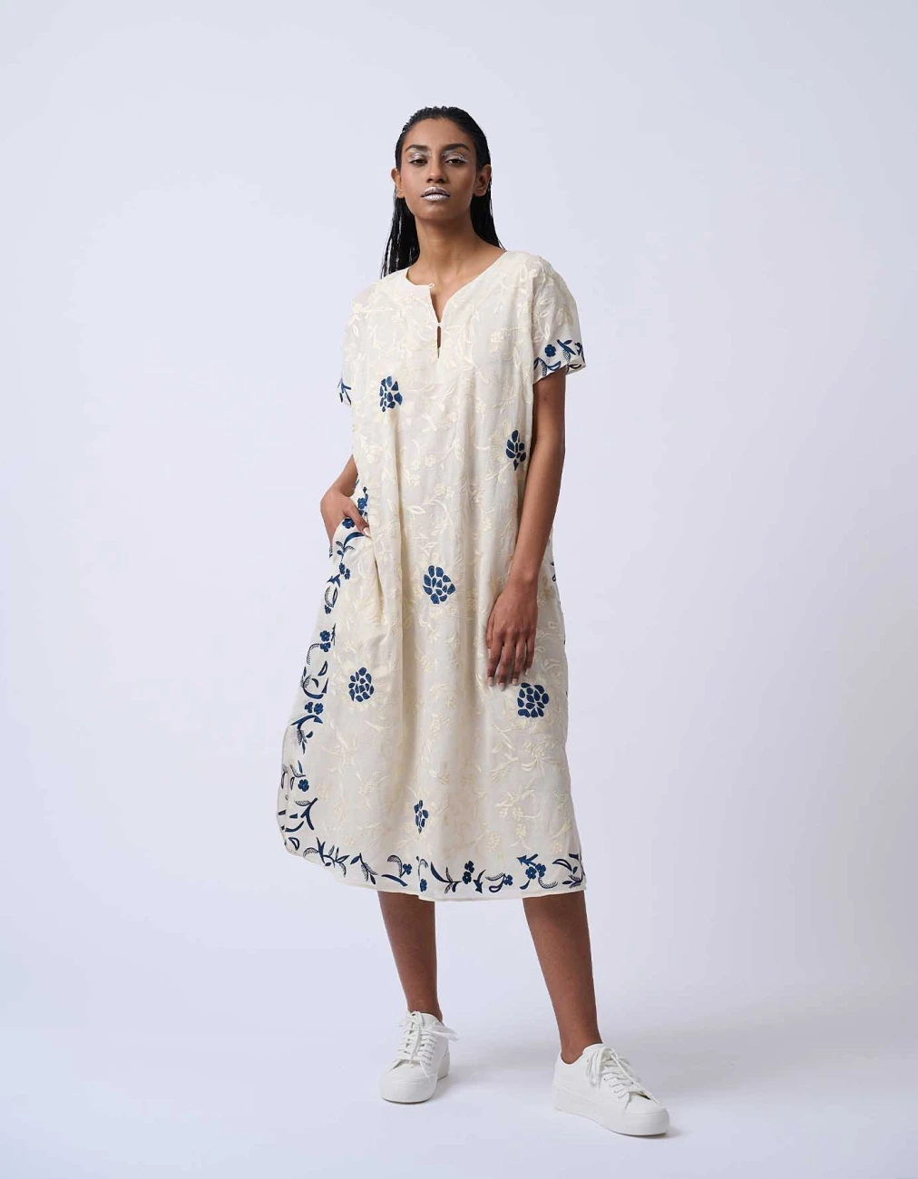 - Ivory and Blue Embroidered Dress in Handloom Cotton