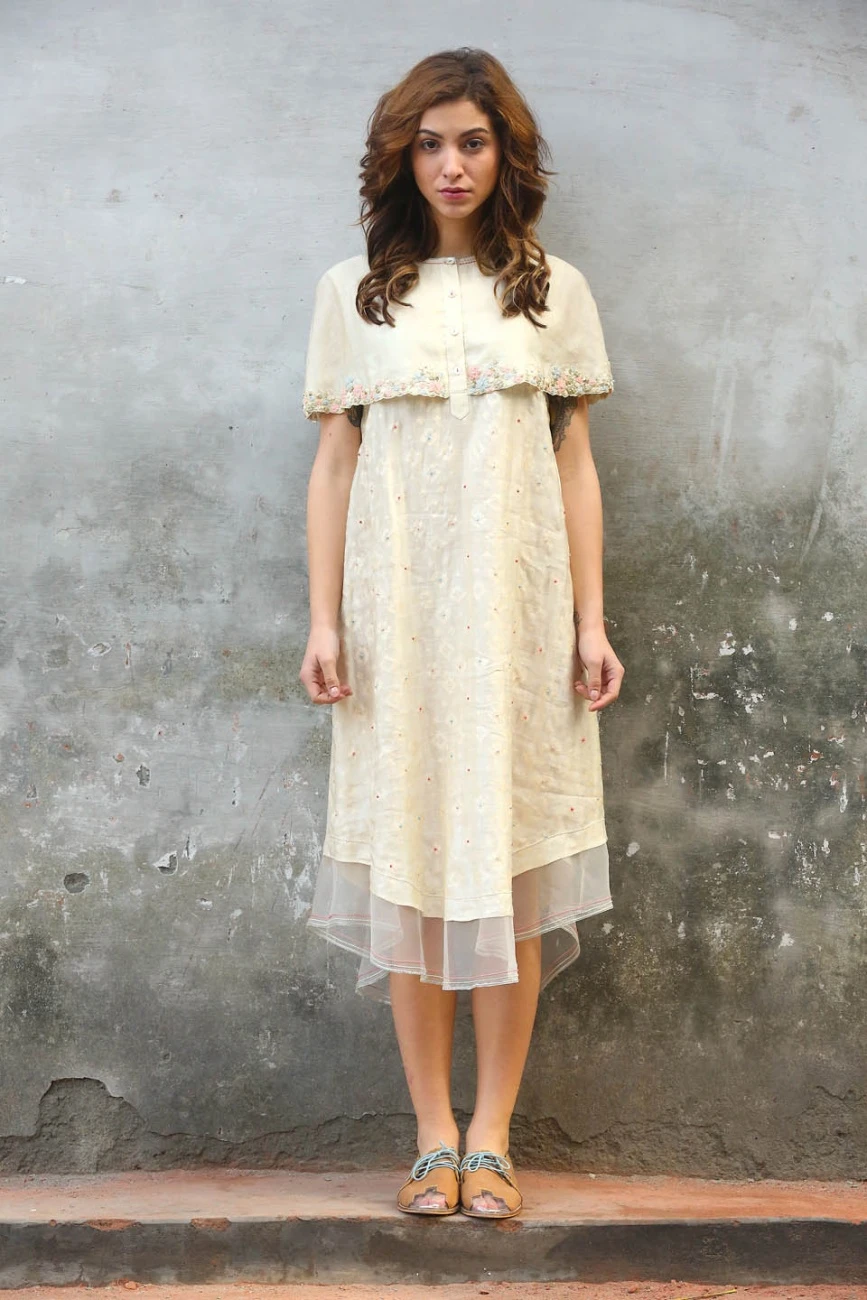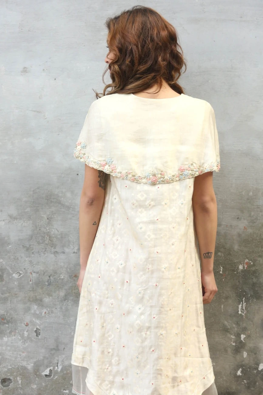 - Ivory cape style emdroidered & ikat printed kurta dress