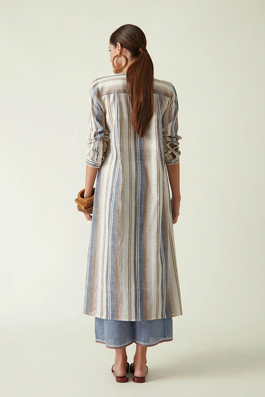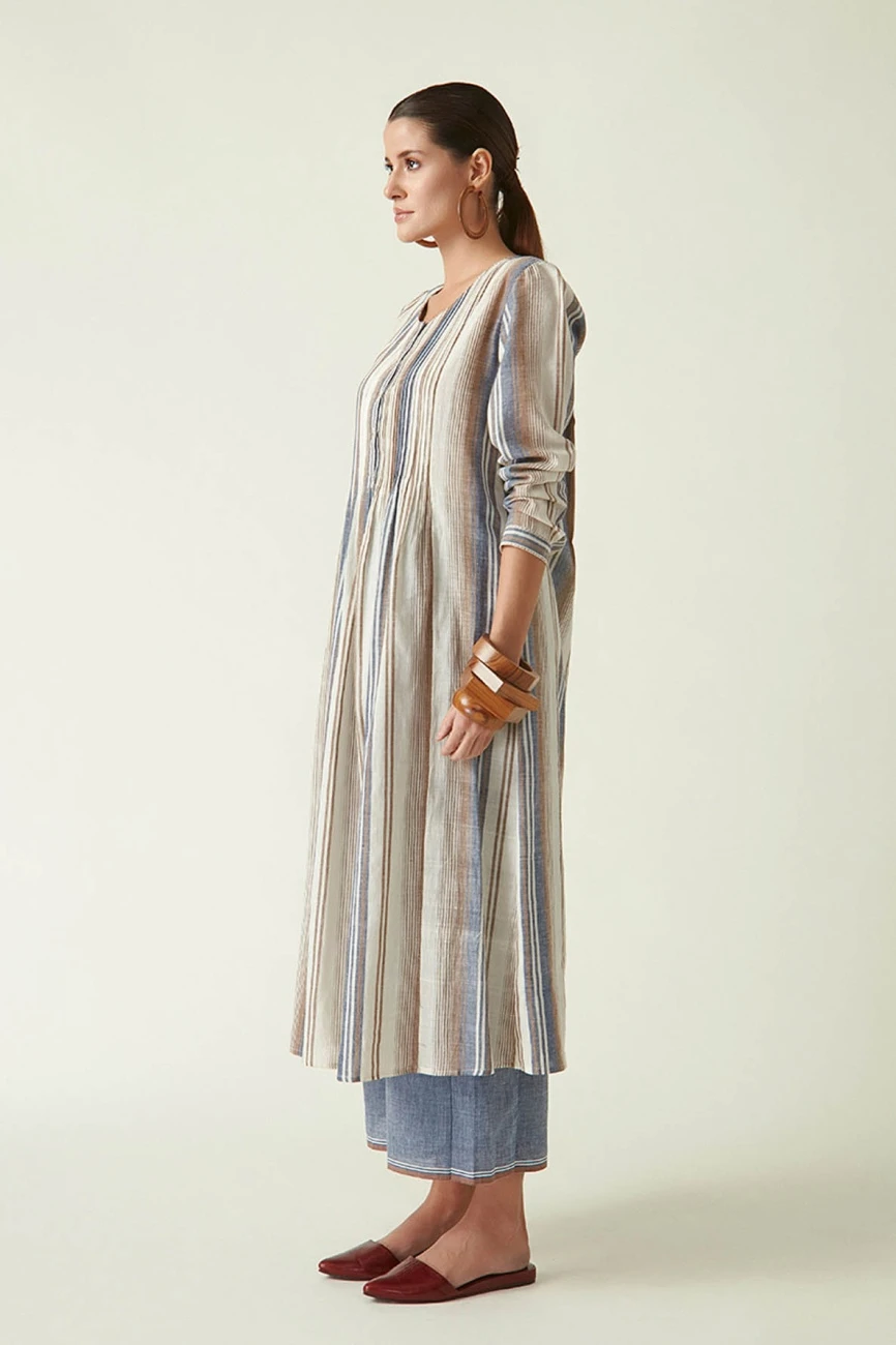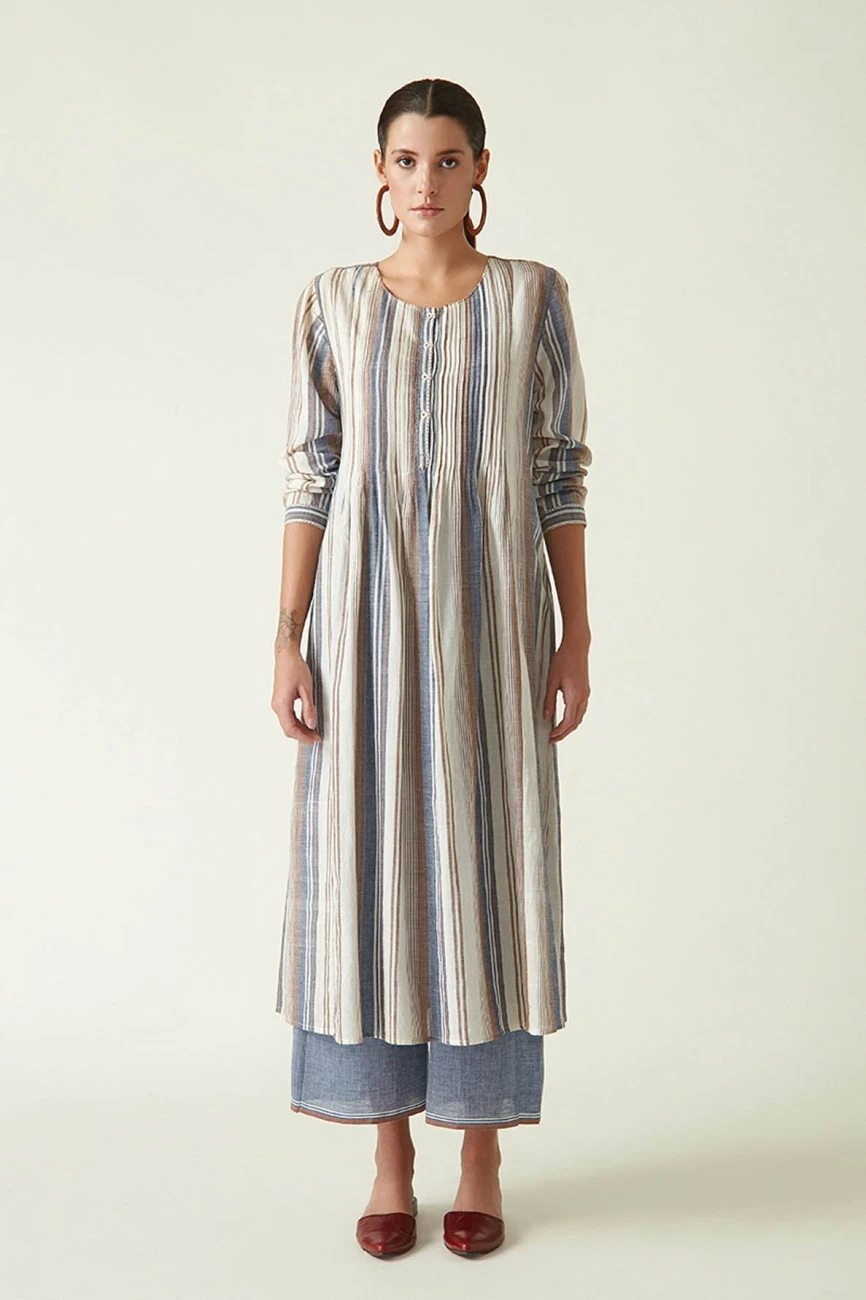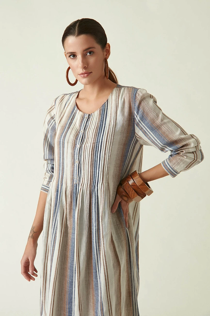 - Round neck dress in cotton handloom brown/blue stripes with front placket