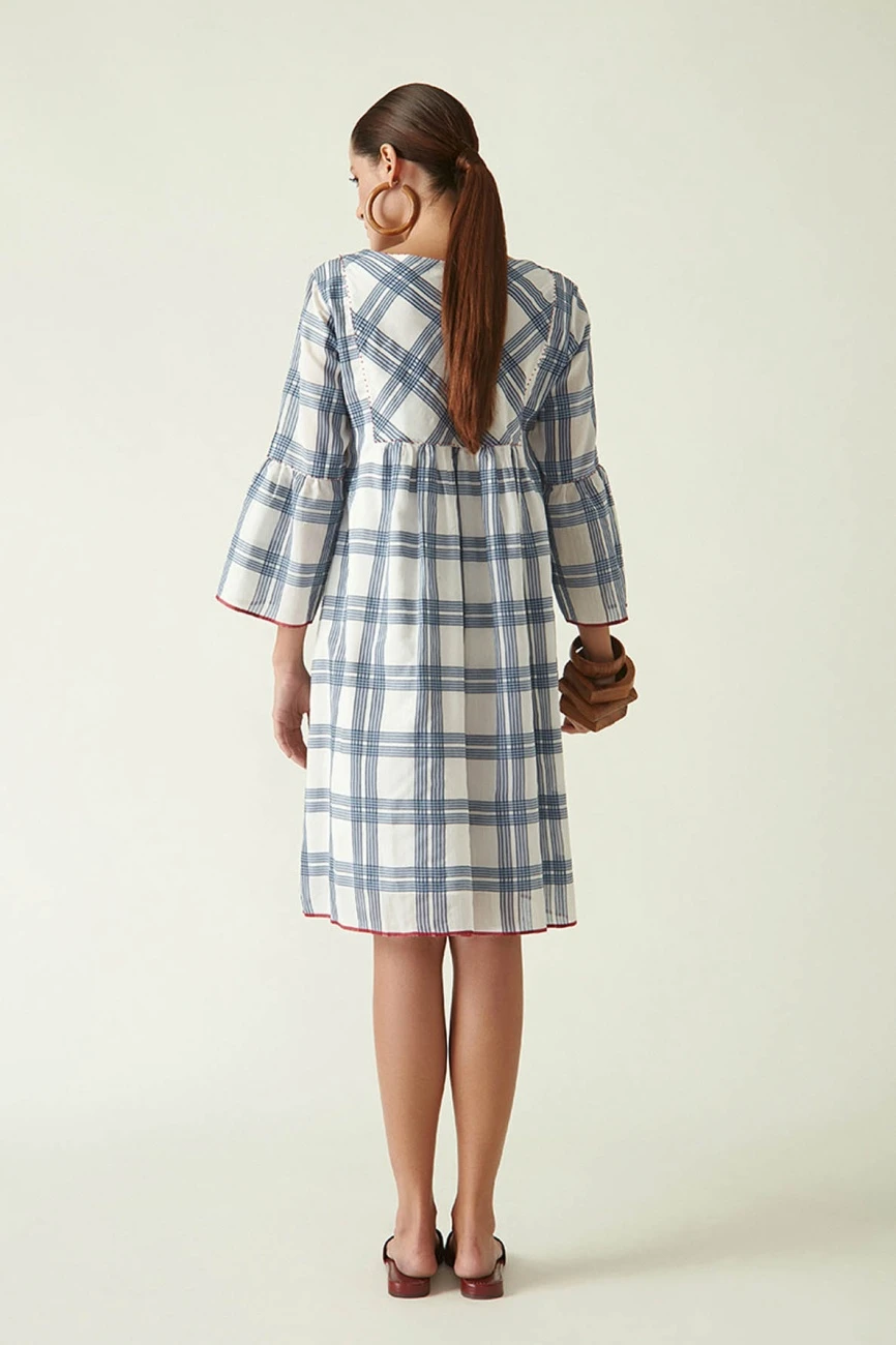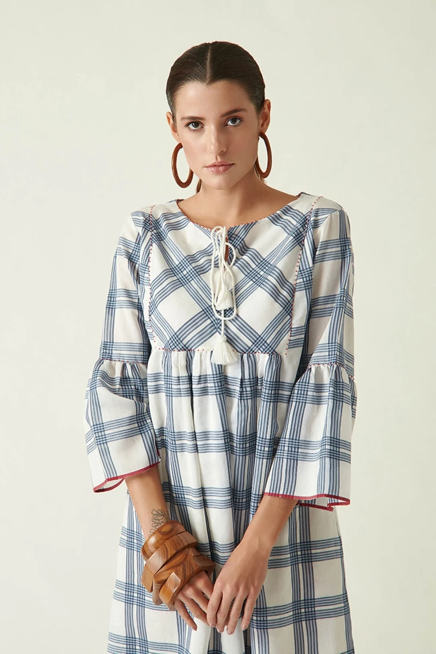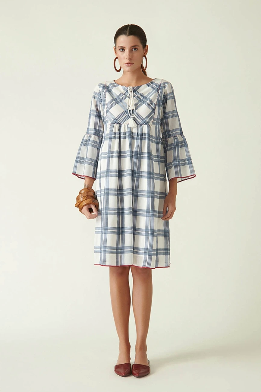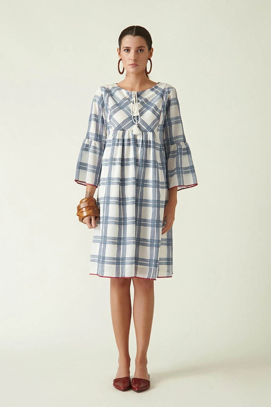 - Short dress in cotton silk with yoke, selvedge detailing and neck tie with tassels