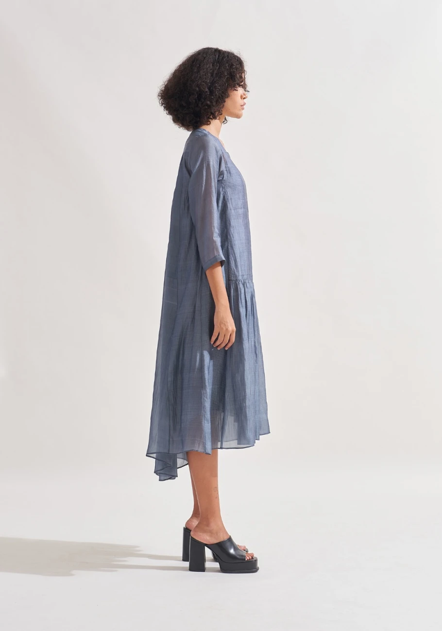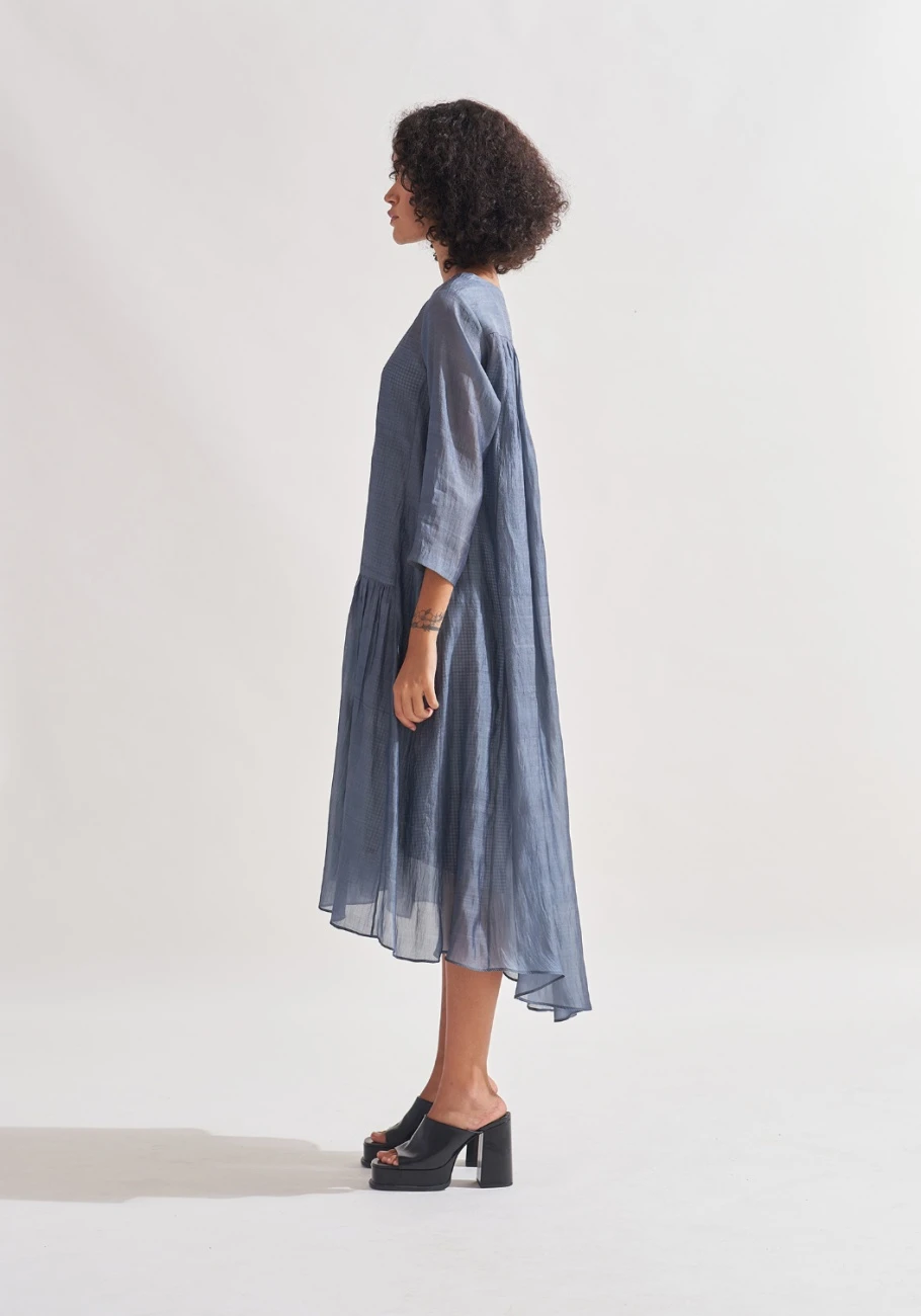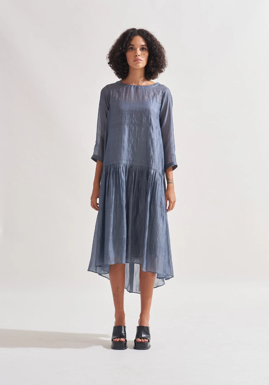 - Hand-woven silk hi-lo dress. Wide round neck. 3/4th sleeves. Checkered cotton slip included.
