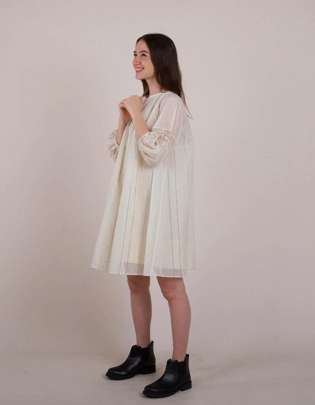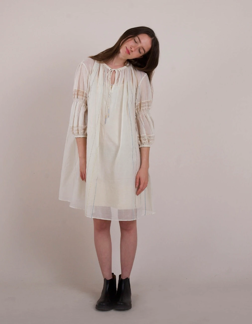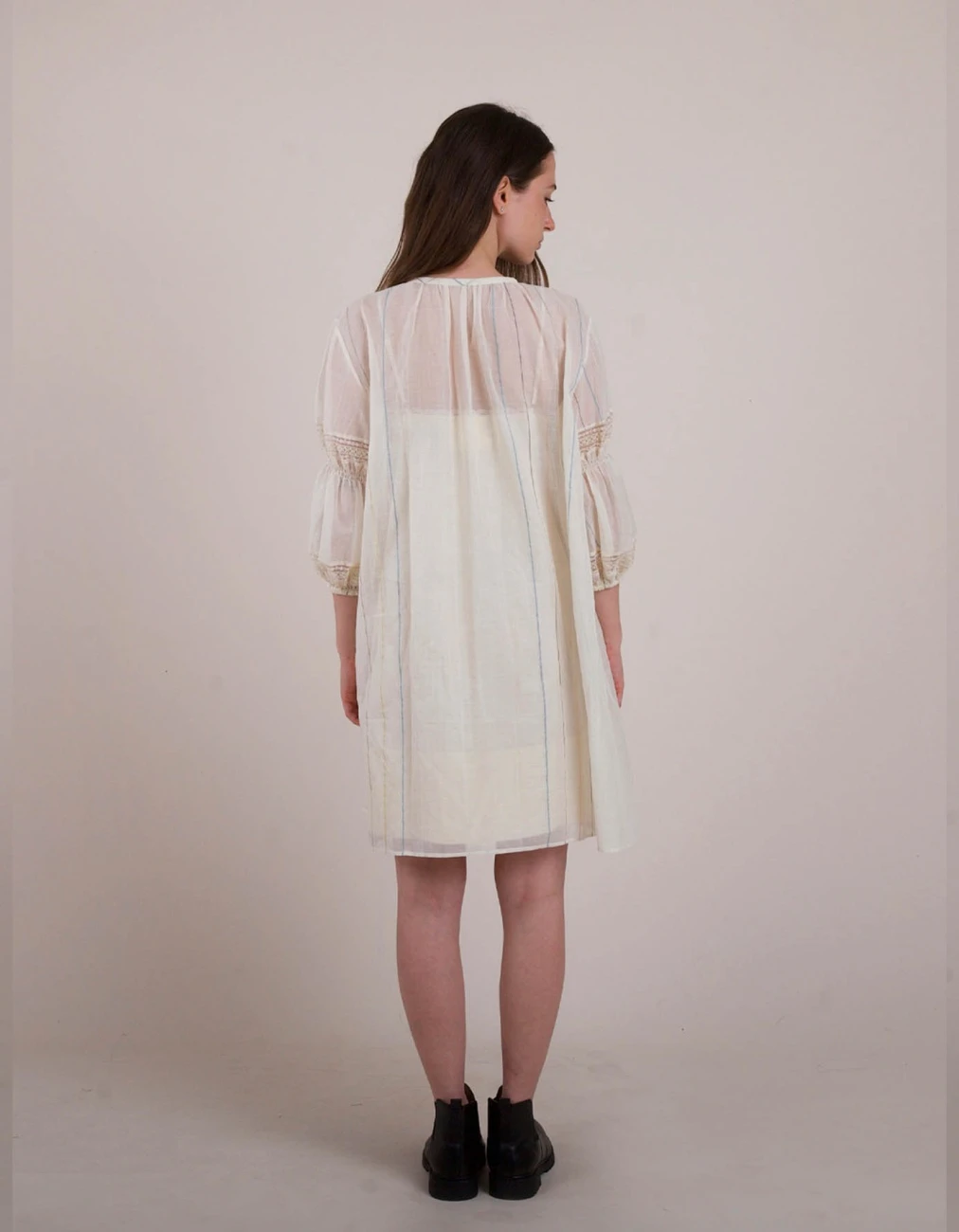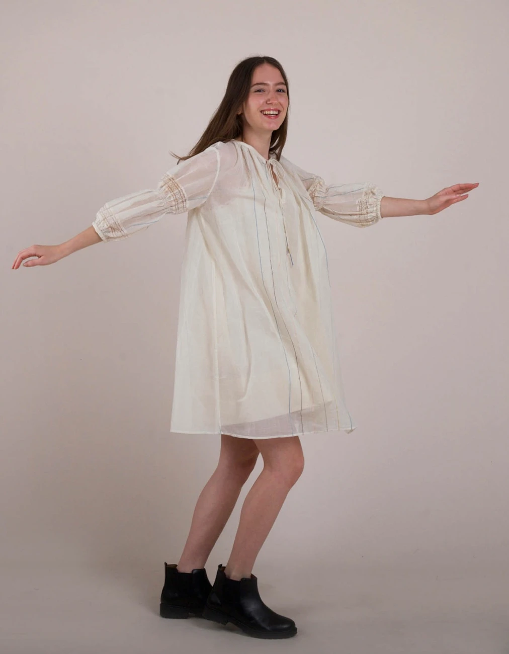 - Semi sheer neck gathered mini dress with a tie-up closure and elasticated bubble laced sleeves
