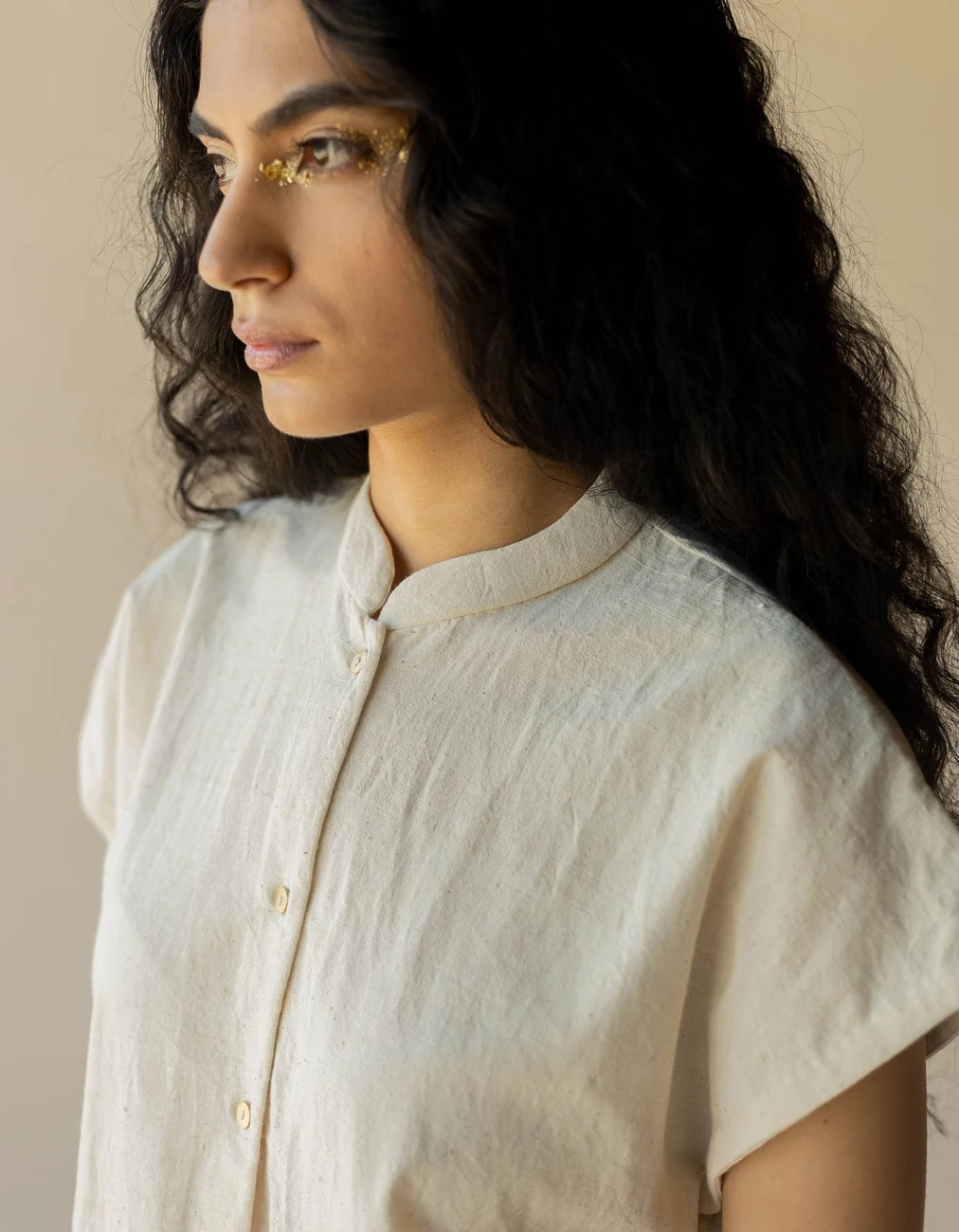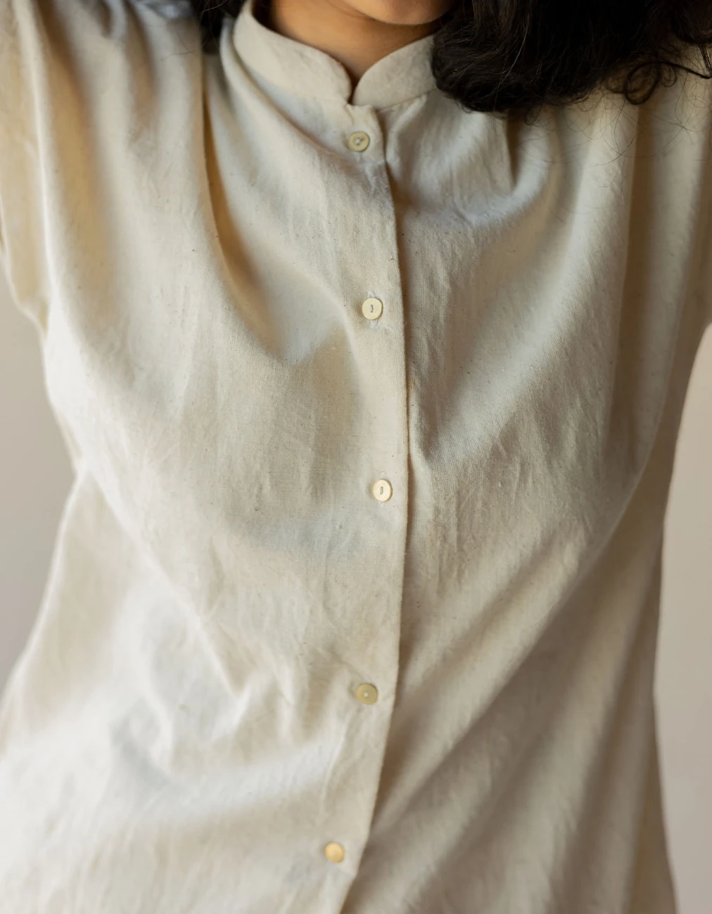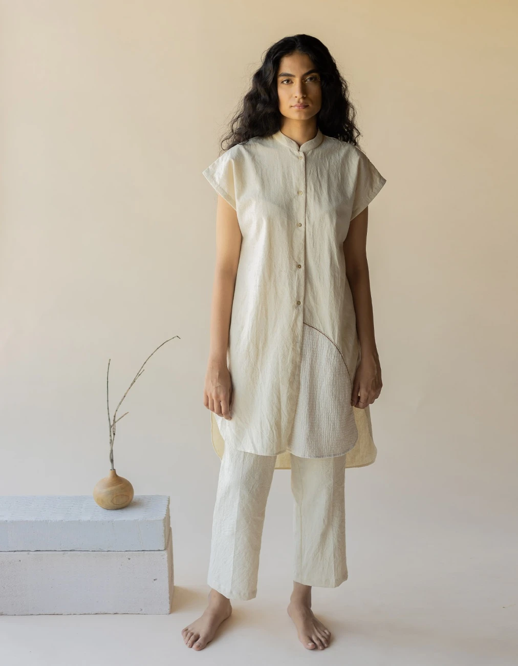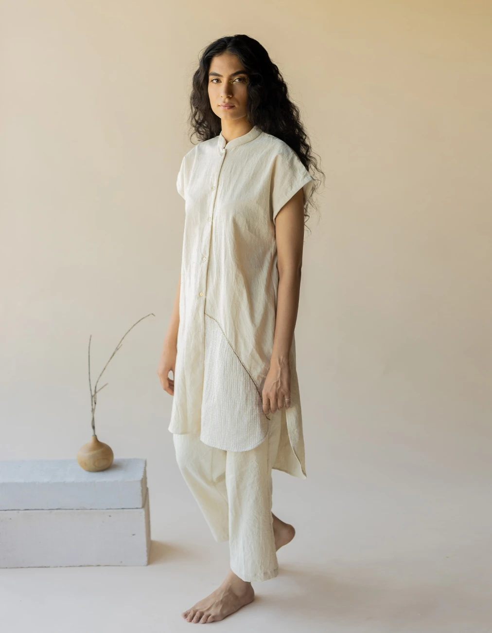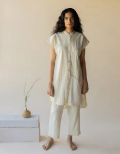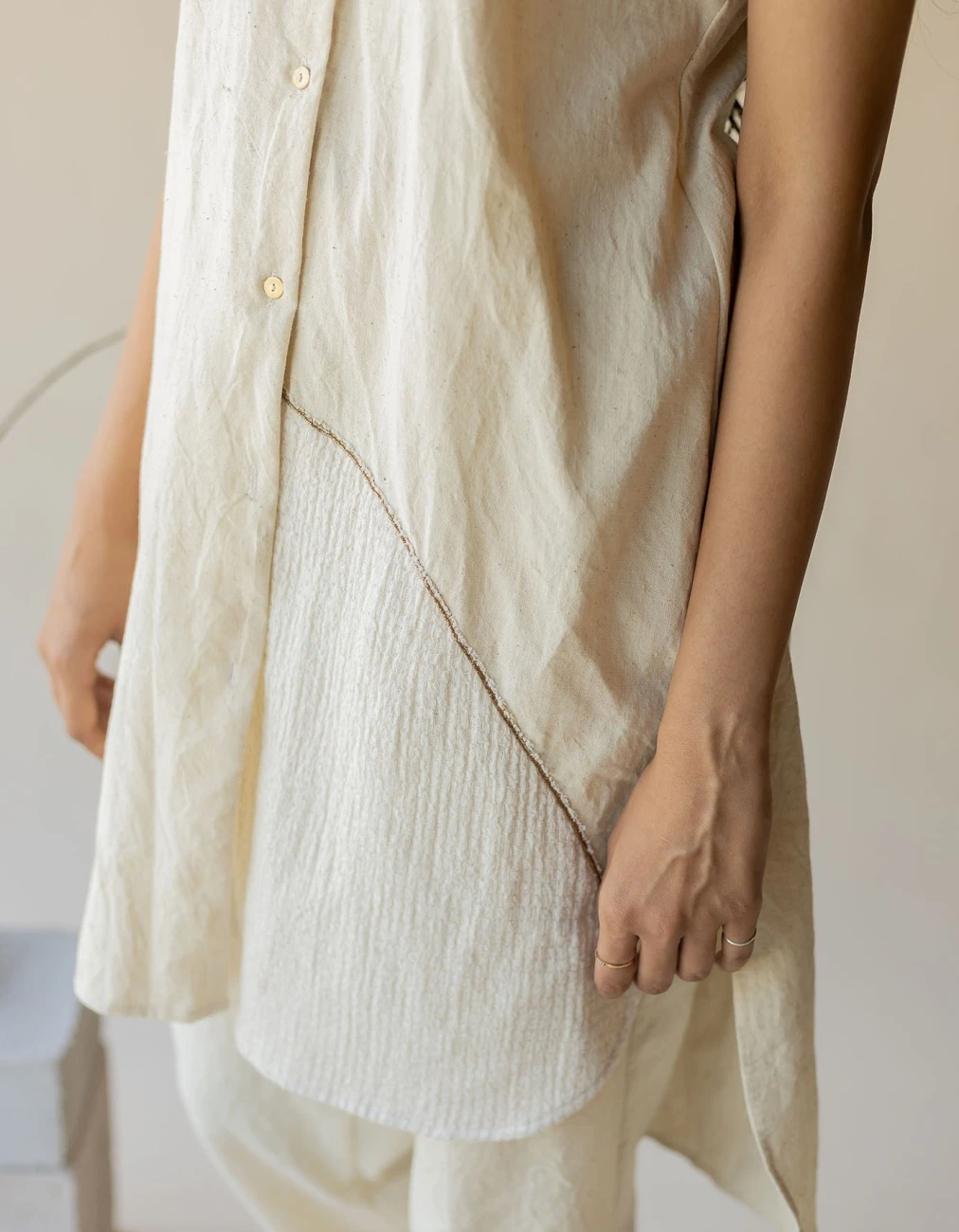 - An A-line shirt created in a neutral shade of off-white featuring the works of antique wire work patched with textured cotton