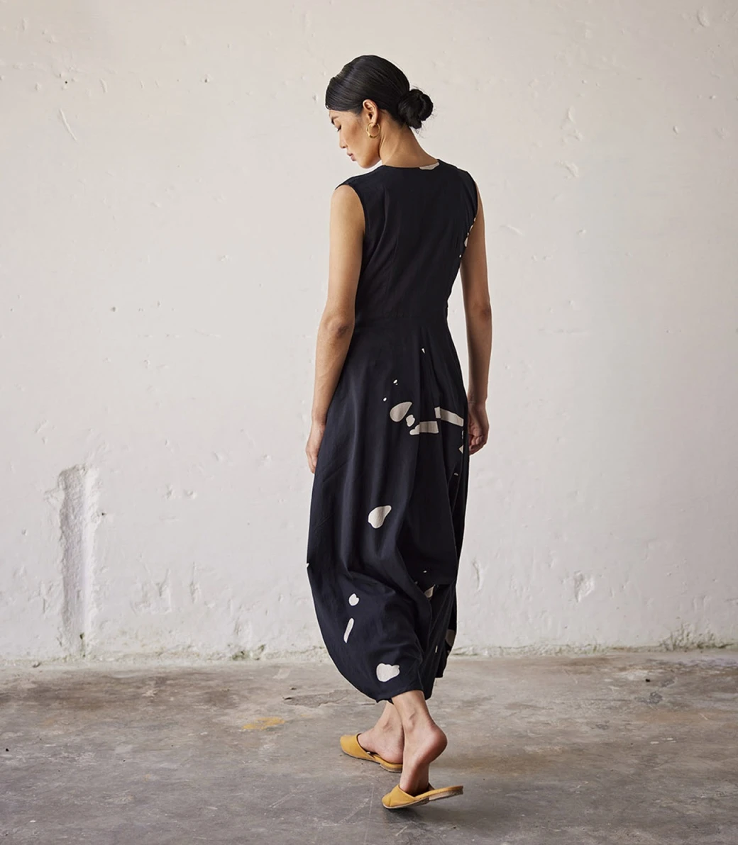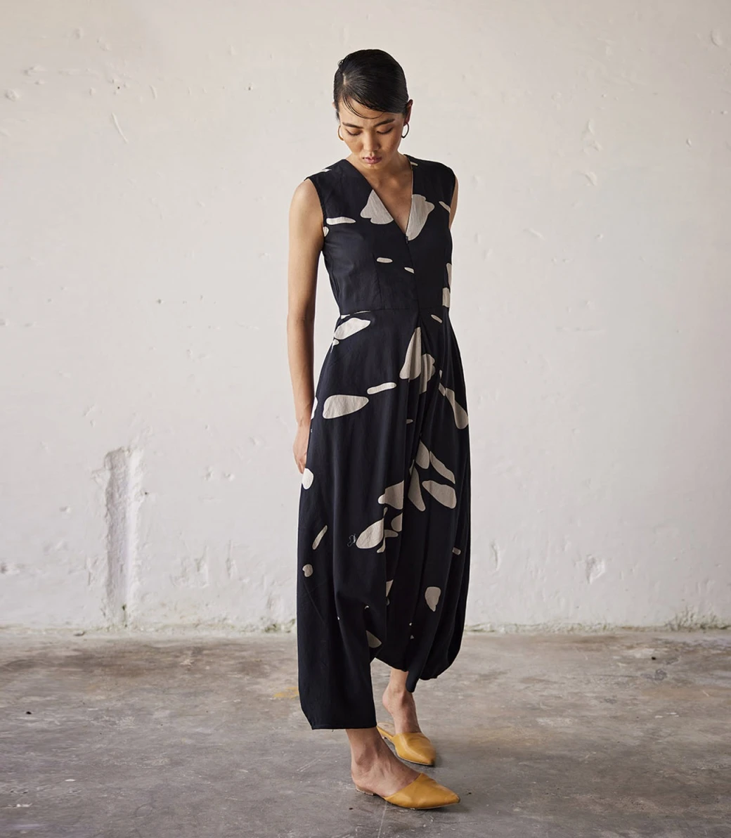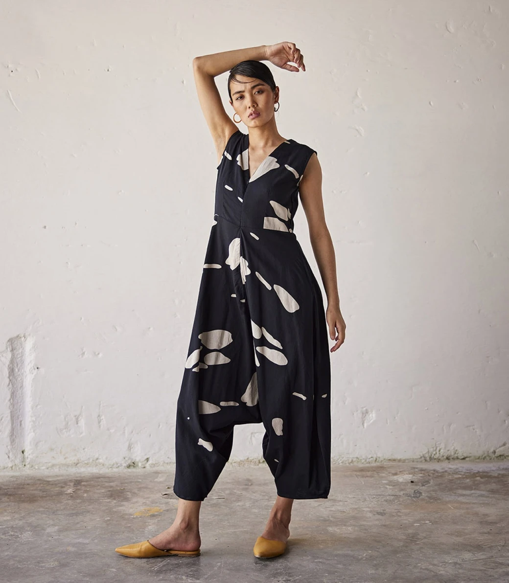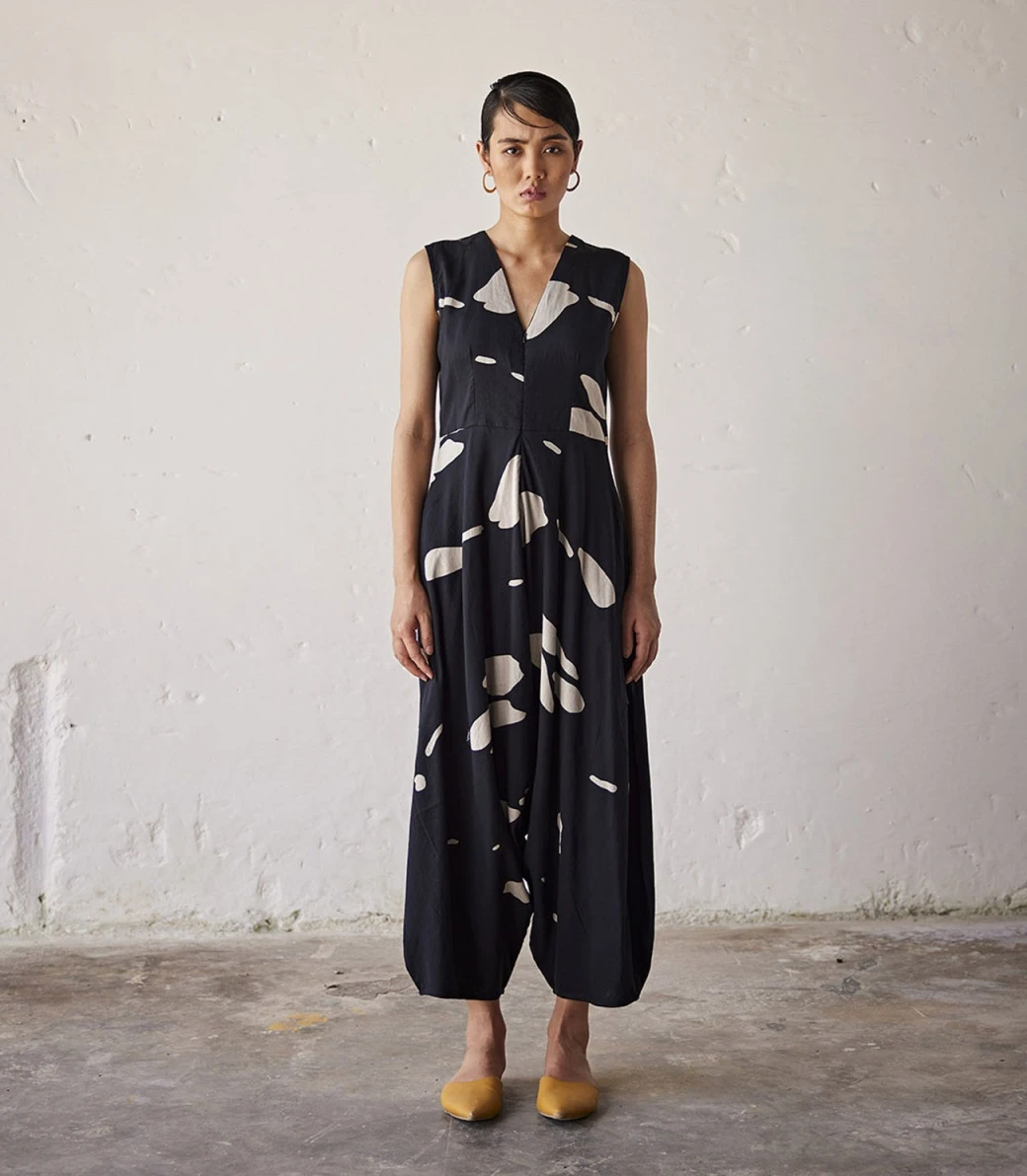 - A black terracota print mul jumpsuit with a concealed zipper opening and a V neckline