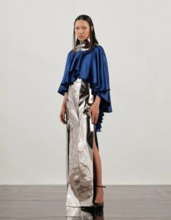 - Front-slit fitted dress in mirror-metallic fabric, adorned with textured satin assymetrical cape