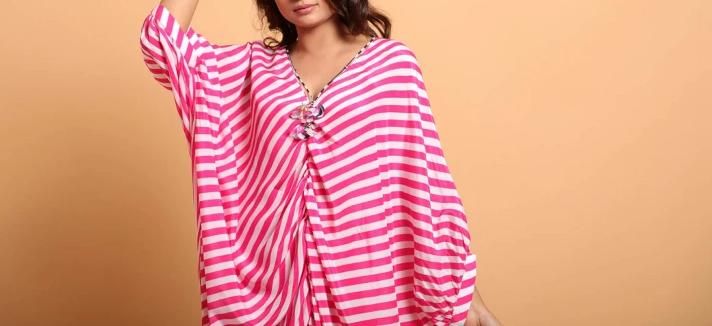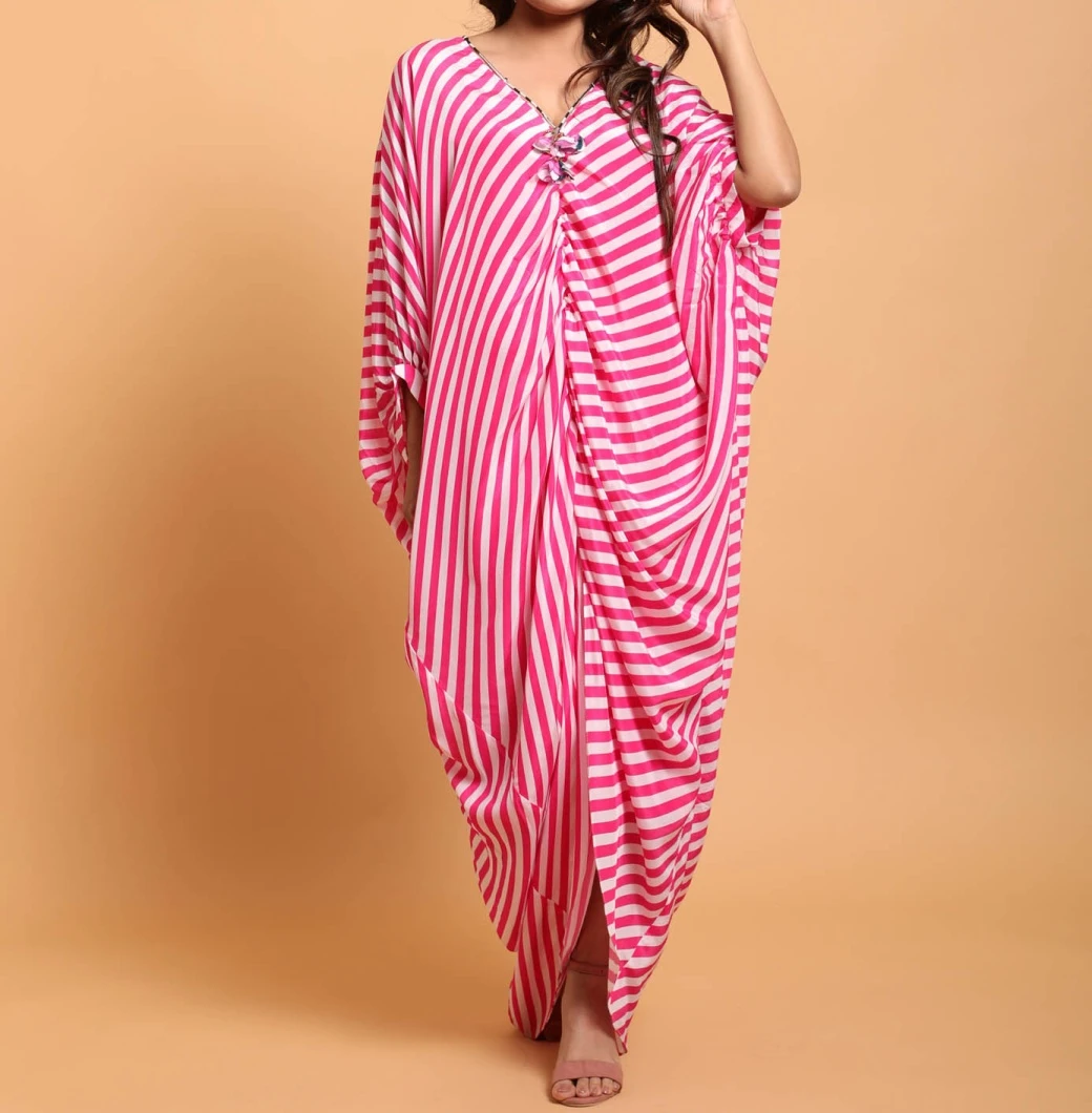 - Mithai Pink white loose crepe sarong style kaftan dress with hand crafted dori and tassels on neckline