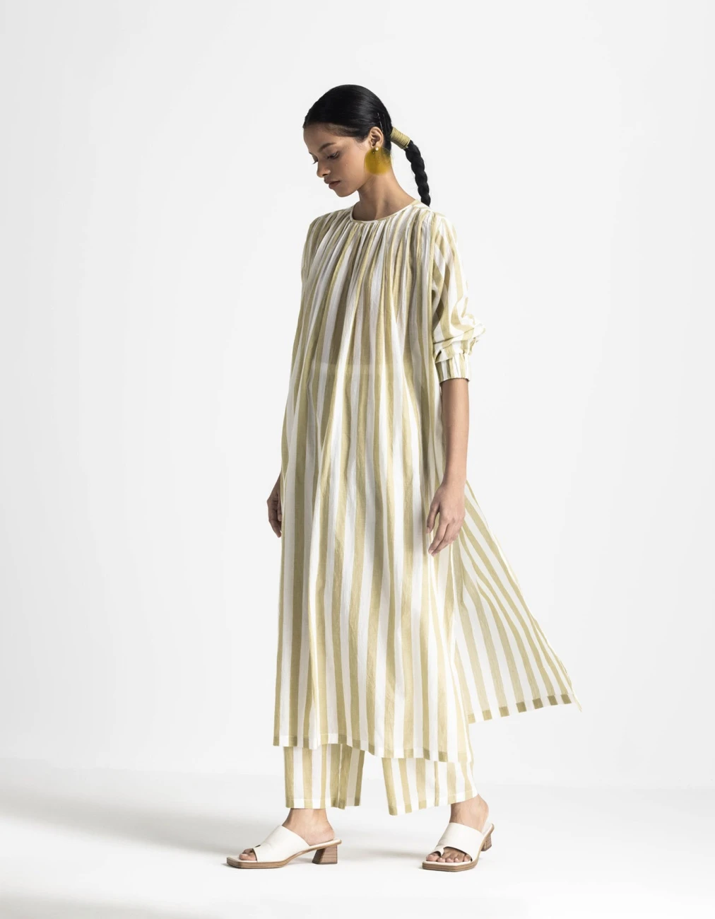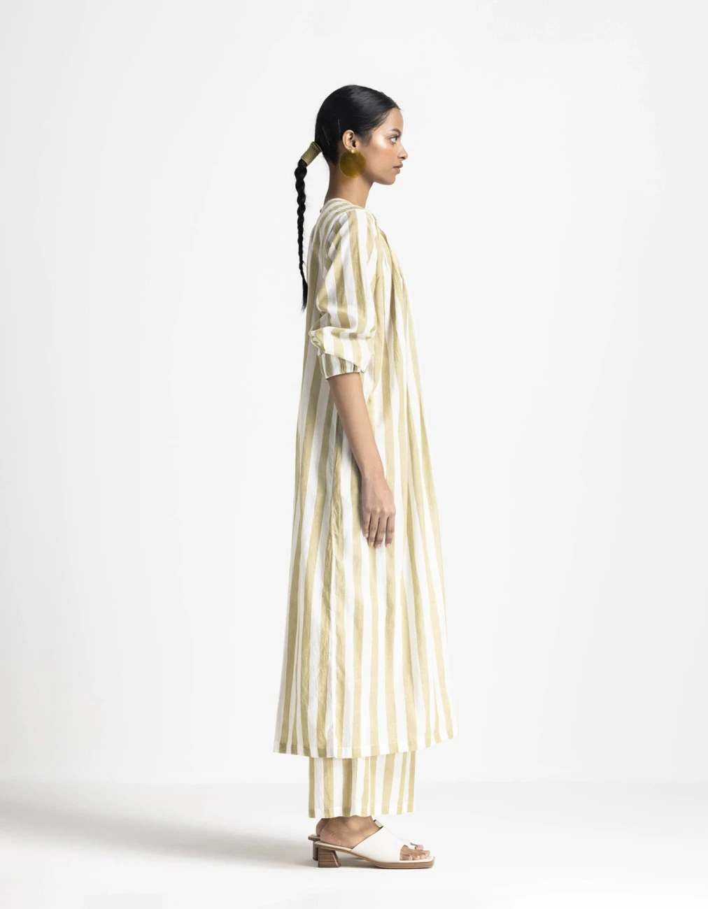 - Hand woven cotton, moss green striped loose fit dress