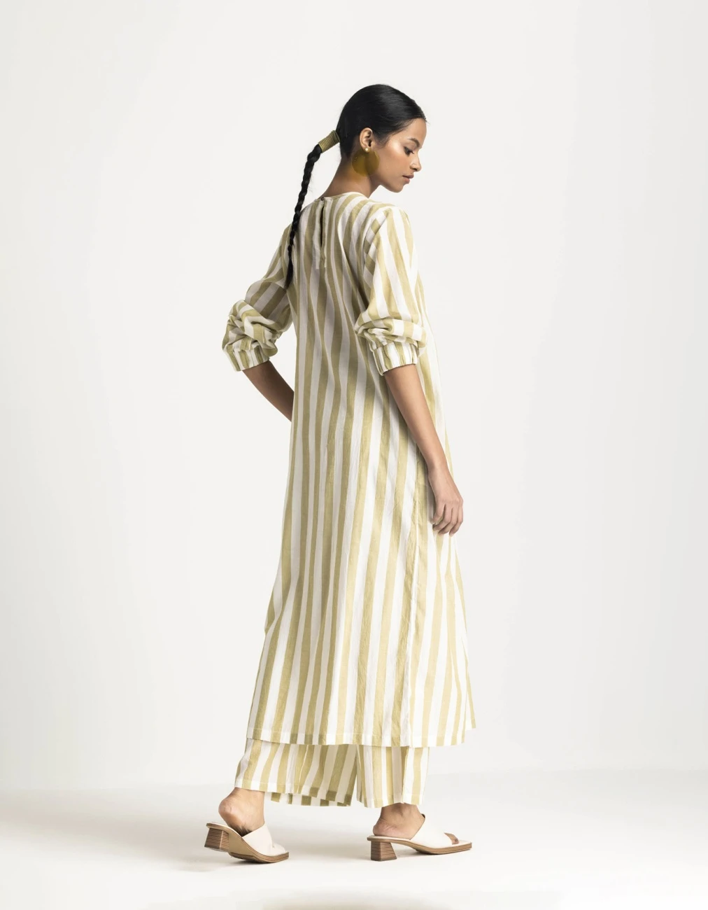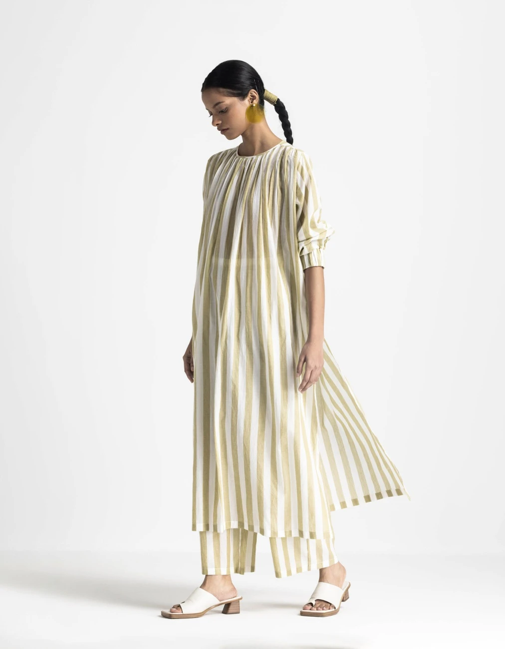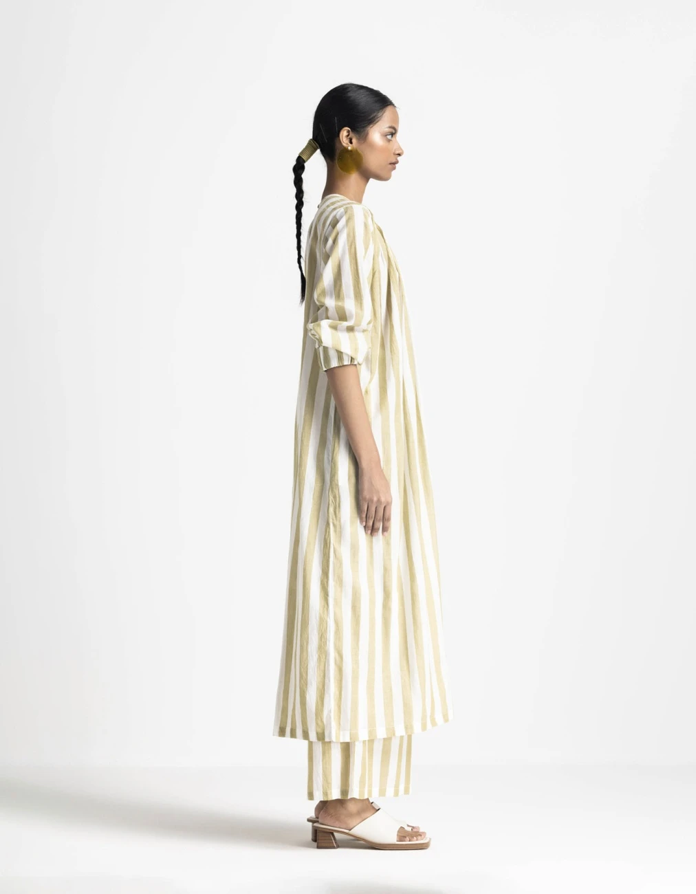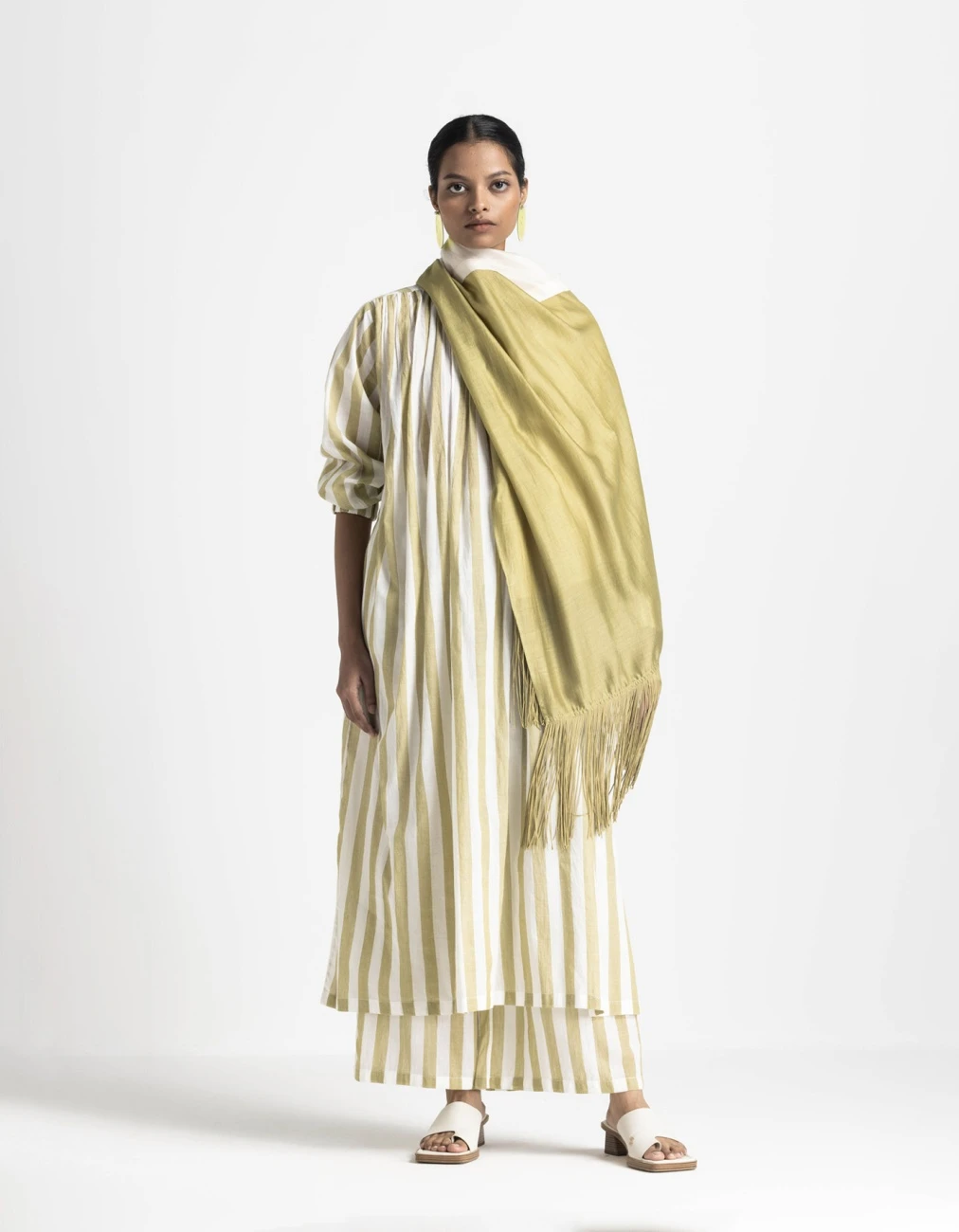 - Hand woven cotton, moss green striped loose fit dress