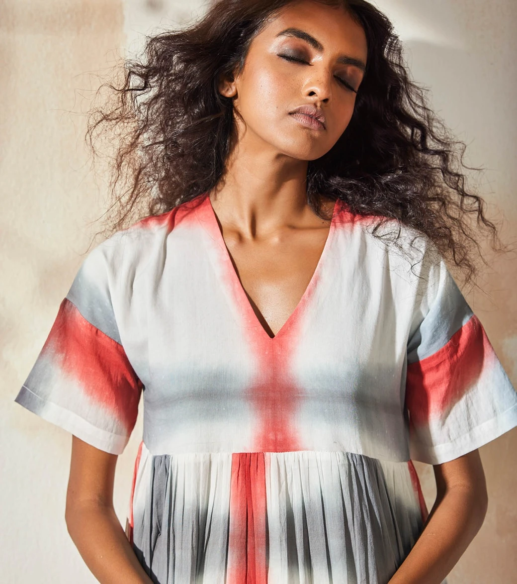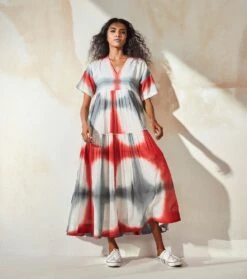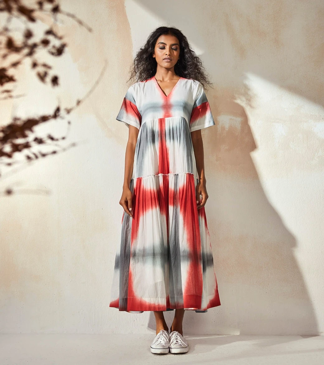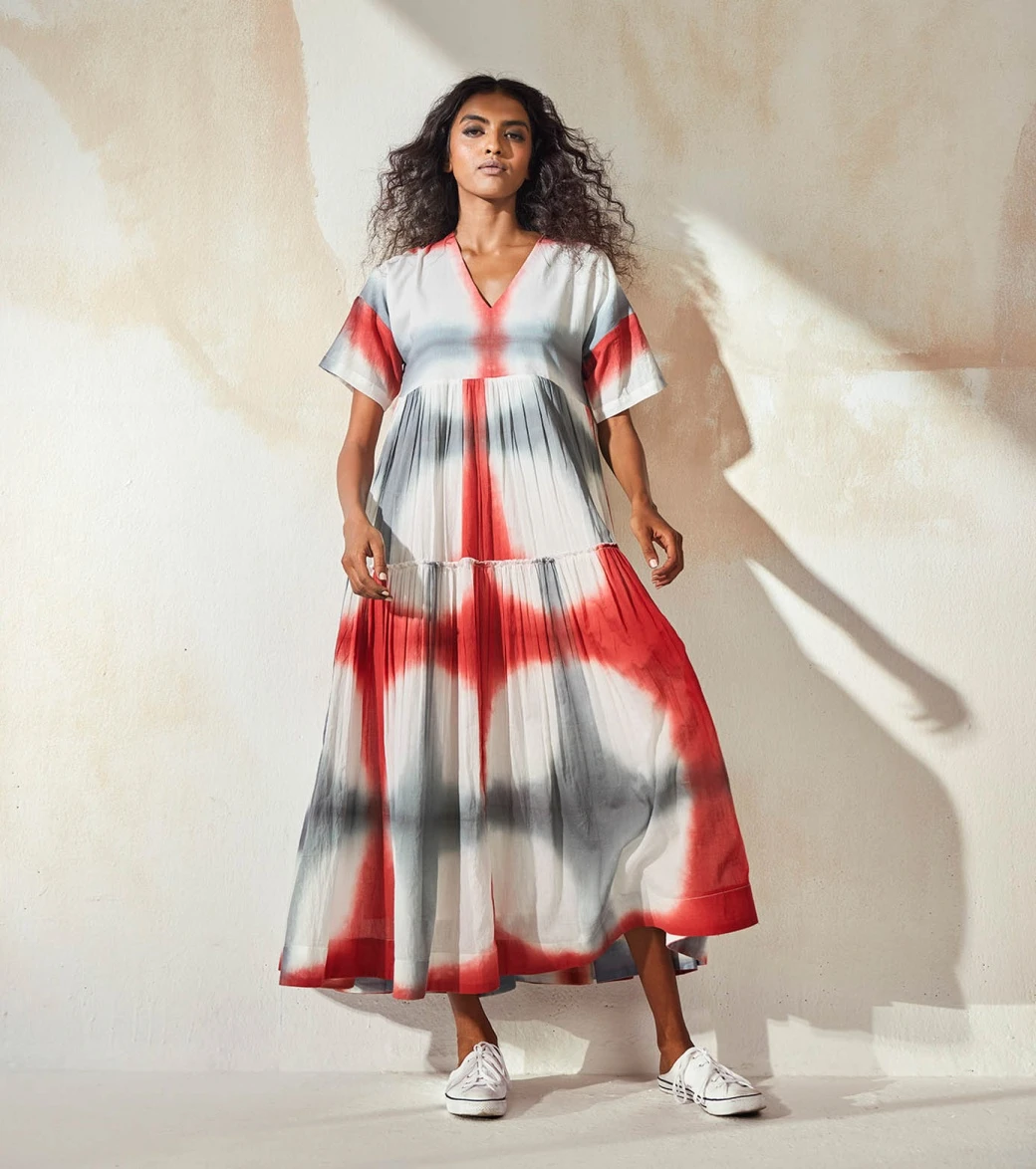 - A tiered midi multi-color shibori dyed dress with half sleeves, side pockets and a v-neckline