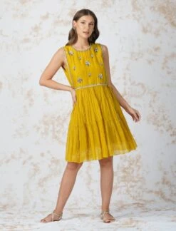 - Broad yoke tiered dress with side strings is embellished with antique sequins work